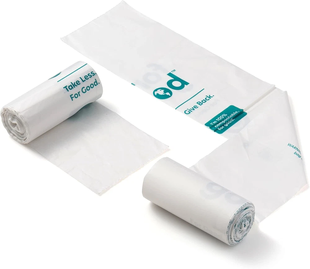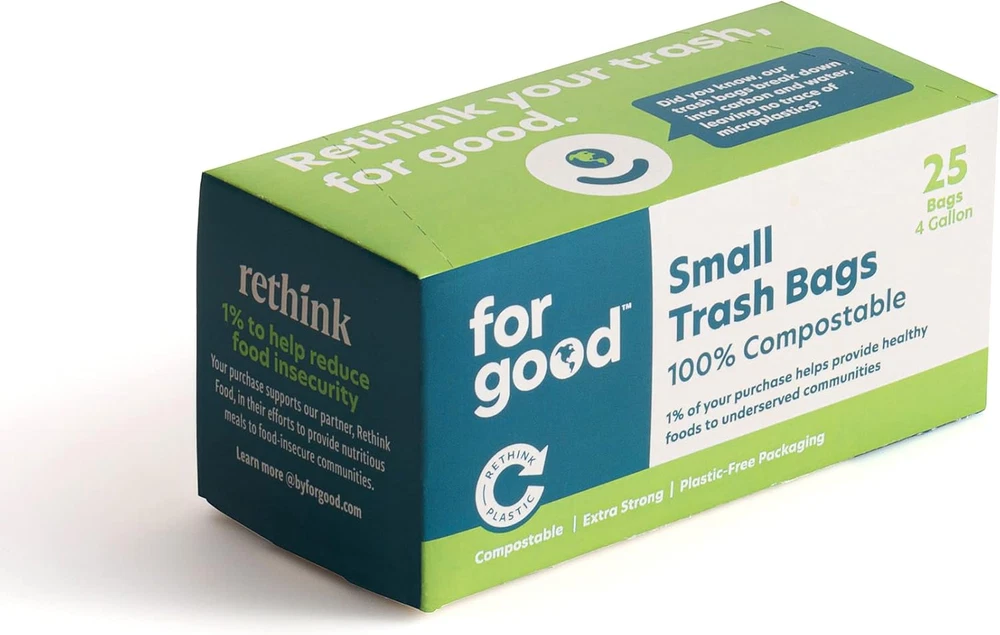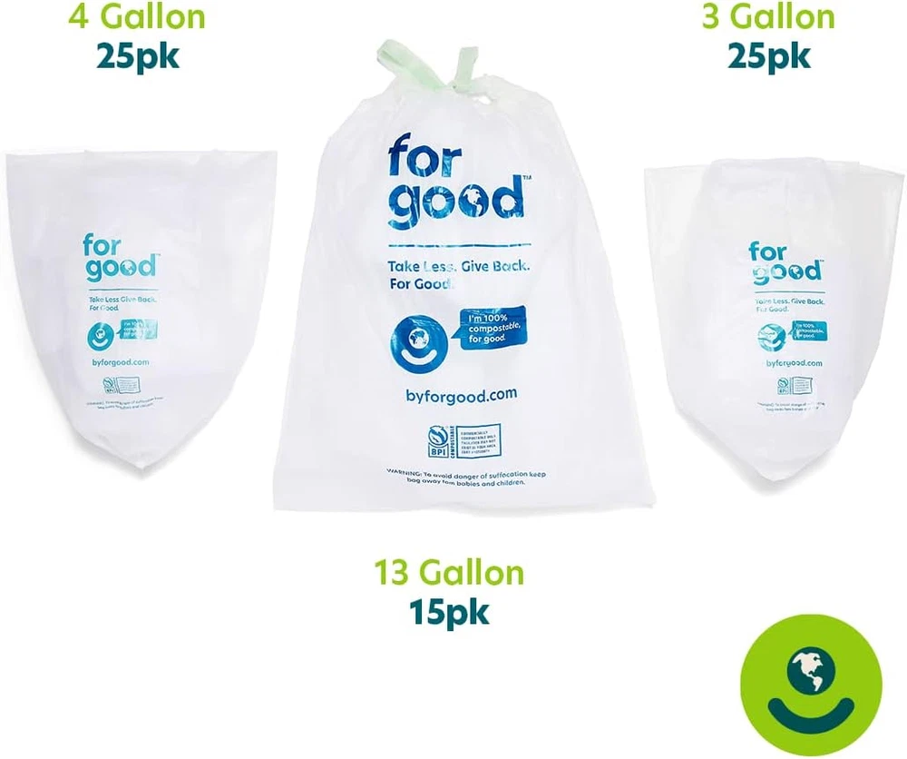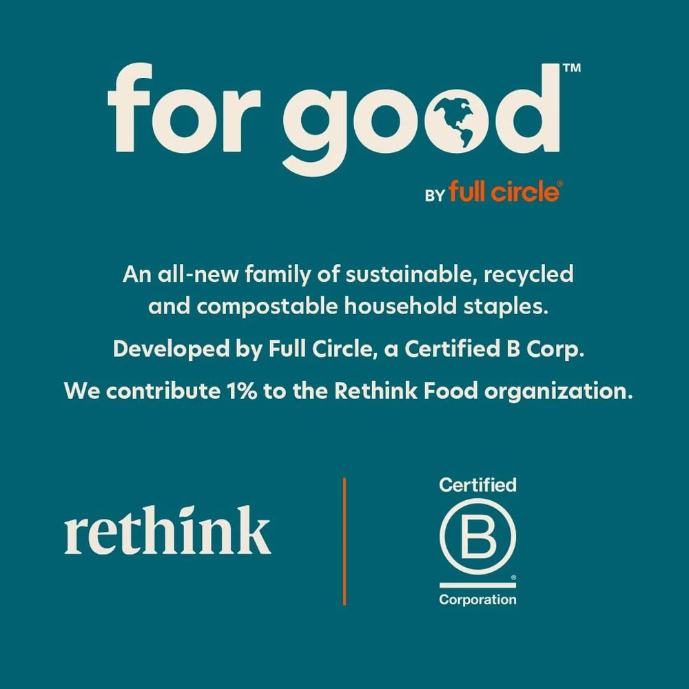 SMALL TRASH BAGS: Plastic stinks, so we’ve made our biodegradable trash bags without it; these compostable bags are ideal for small trash cans in the bathroom, office, kids’ room or laundry room EXTRA STRONG: Our 0.7mm thick trash bags are designed for maximum strength, tear and leak resistance without using plastic; these extra strong bags keep the mess in the liner, not the bottom of the bin 100% COMPOSTABLE: The eco-friendly trash bags are made with plants (PLA & PBAT) that break down into carbon and water, and are certified by BPI to rapidly compost in municipal or commercial composting facilities 4 GALLON TRASH BAGS: These 4 gallon bags are ideal for bathroom and office bins ; each decomposable bag measures 17.7in x 21.7in (45cm x 55cm),; supplied in plastic free, recyclable packaging EARTH FRIENDLY KITCHEN ESSENTIALS: For: good is an all-new family of sustainable, recycled and compostable household staples. Developed by Full Circle, a Certified B Corp. We contribute 1% to the Rethink Food organization 100% COMPOSTABLE TRASH BAGS: Full Circle Small Trash Bags are a high performance, biodegradable alternative to plastic trash bags for the bathroom, office or laundry room can. Made from plant based compostable materials (PLA and PBAT) that break down into carbon and water (and NO microplastics), you can be sure that you won’t be throwing out any extra plastic on garbage day. The extra strong bin liner bags measure 0.7mm thick, and are both leak and tear resistant to minimize mess and spills. Each compostable bin liner is designed to perfectly fit a 4 gallon trash can, and measures 17.7in x 21.7in (45cm x 55cm). These plant based, earth friendly home essentials are supplied as 25 waste bags per box. FOR GOOD: Our biodegradable bin bags are part of an all-new family of sustainable, compostable household staples - trash bags, zipper bags, wraps and other everyday items that turn into earth instead of microplastics. The plant based compostable bags meet internationally-recognized standards to safely compost in municipal or commercial composting facilities, and come in plastic free, recyclable packaging. PLASTIC & CARBON NEUTRAL: Being plastic neutral means that for every ounce of plastic we use, we work with Plastic Bank to recover and recycle the same amount of plastic that would otherwise enter our environment, and through Carbon Fund we’re offsetting all emissions from ocean shipping. FOR GOOD by Full Circle : We make beautifully designed, functionally innovative home care products from safe and sustainable materials to benefit this and future generations, and preserve the world we all share.