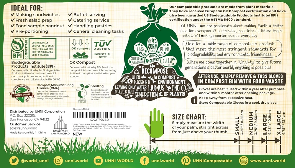 Store New Arrivals Add to Favorite View Feedback Contact Compostable Food Prep Gloves, Restaurant-Quality, for Food Handling, Powder-Free, 100 Count, Small, Earth Friendly Highest ASTM D6400, US BPI, CMA & Europe OK Compost Certified, San Francisco Description Item model number Gloves-S-100 Part Number Gloves-S-100 Style Small Size 100 Count (Pack of 1) Color Green Product Dimensions 10.24 x 5.95 x 0.75 inches Material compostable Batteries Required? No Item Weight 7.4 ounces Batteries Included? No Special Features Powder-free Special Feature Powder-free Number Of Pieces 100 100 Count; Small = 3.25" / 8.25cm; Size Chart: Simply measure the width of your palm, straight across from just above your thumb Ideal for: Making sandwiches, Fresh salad prep, Food sample handout, Pre-portioning, Buffet serving, Catering service, Handling pastries, General cleaning tasks CERTIFIED COMPOSTABLE IN U.S. & EUROPE: Certified by the Biodegradable Products Institute (BPI) under US standard ASTM D6400. Certified OK Compost under European standard EN 13432 by Vinçotte and Tüv Austria. OK Compost certification guarantees 100% BIODEGRADABILITY IN COMPOSTING facilities. Compost Manufacturing Alliance (CMA) Approved: CMA verifies the compliance of UNNI compostable products with real-world composting standards through disintegration tests. HIGHEST BIOBASED CONTENT: UNNI Compostable Bags are made from plant starches and contain NO polyethylene. Bags are durable, nontoxic, easy to use and great for the environment. UNNI compostable bags are the ethical choice for a cleaner environment and an ECO-FRIENDLY future. Thank you taking care of our planet for FUTURE GENERATIONS by replacing plastic with our sustainably manufactured, compostable bags. Together, U ‘n’ I make Earth a better place. Product Description Denotes certification by TÜV Austria as 100% compostable in backyard and home composting units. OK Compost Home is one of the world’s only home composting certifications. US BPI Denotes certification by the BPI for use in commercial and municipal composting facilities, in compliance with U.S. standard ASTM D6400. At UNNI, we are passionate about making Earth a better place for everyone. A sustainable future begins with U 'n' I making smarter choices every day. When we come together in "Unni-ty" to give future generations a better world, anything is possible! We offer a wide range of 100% compostable products that meet the most stringent standards for biodegradability and environmental friendliness. Our compostable bags are made from plant materials and have received European OK Compost Home certification, so they are 100% compostable even in home composting units These bags have also been awarded US BPI certification under the ASTM #6400 standard, and can be composted in municipal and industrial facilities. ABOUT US We offer the best prices around on high quality products. Our E-store includes media such as books, movies, music and games while offering electronics, toys, sporting apparel, clothing, tools, general home, garden items and more. SHIPPING We are always working hard to ensure your package arrives as soon as possible. Please understand that some factors like weather, high postal traffic, and the performance of shipping companies are outside of our control. We offer free shipping to the lower 48 states and ship within 2 business days of payment, usually sooner. We do not accept P.O. Boxes. Please provide a physical address. For shipping outside of the continental USA, we only use eBay's Global Shipping Program.The item is shipped to KY and then sent to the rest of the world. International customers are responsible for all duties and taxes. Continue to check out in order to calculate costs for shipping the item to your country. Messages regarding eBay's Global Shipping Program MUST be directed at eBay EXCLUSIVELY. RETURNS We offer a 30-Day Return Policy on items which you are not completely satisfied with. You have the option for a full-refund or an exchange of the item. No returns are available on items shipped outside of the USA. PAYMENT We accept PayPal. CONTACT US This page content is yet to come Please ad us to your favorite seller and visit again later Thank You CUSTOMER SATISFACTION We try our very best to make sure every customer is completely satisfied. If there's a problem, message us! We're happy to help. WE ACCEPT Copyright © 2021 AutoDS. | All Rights Reserved
