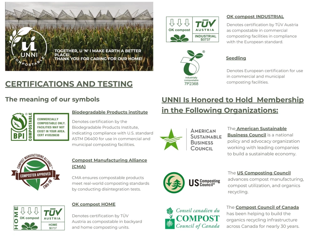ASTM D6400 100% Compostable Bags, 2. 6 Gallon, 100 Count, Extra Thick 0. 71 Mils, Small Kitchen Trash Bags, Food Scrap Yard Waste Bags, US BPI & European VINCOTTE OK Compost Home Certified San Francisco 2.6 Gallon / 9.84 Liter capacity; Size: 16.3 in x 16.5 in x 0.71 Mils; 100 Bags Per Roll. Ideal for managing kitchen food scraps in compact bins, these bags are thoughtfully designed to reflect our commitment to sustainable living and eco-conscious choices. Rooted in the heart of San Francisco, we strive to create products that support a cleaner, greener future. Certified for a Greener Future: compostable bags are certified to meet compostability standards in both the U.S. and Europe: BPI Certified: Compliant with ASTM D6400 for industrial composting in the U.S. OK compost HOME: Certified by TÜV Austria for home composting systems in Europe. CMA Verified: Approved by the Compost Manufacturing Alliance for reliable decomposition in real-world composting environments. Usage and Storage: bags in a cool, dry place and avoid exposure to excessive heat. Use within 1 year of purchase for best performance and compostability. compostable bags are the smart choice for a cleaner environment and an ECO-FRIENDLY future. Thank you taking care of our planet for FUTURE GENERATIONS by replacing plastic with our sustainably manufactured, compostable bags. Together, U 'N' I make earth a better place! Please note: Commercial composting facilities may not be available in all areas. We recommend verifying local availability to ensure compliance with composting requirements.