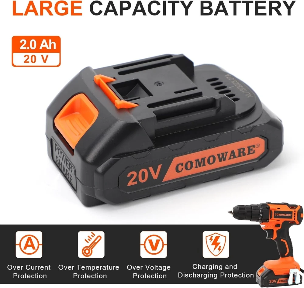 Maximum Torque: 266 in-lbs Battery Included: Cordless Drill and Tool Set Battery Cell Composition: Lithium Ion Battery Capacity: 2 Ah Speed: 0-1300 RPM Unit Count: 1.0 Count Number of Items in Set: 120 Style: 120 Pcs W/ Drill(orange) UPC: Does not apply Maximum Rotational Speed: 1.3e+3 Rpm Voltage: 20 V Charging Time: 2.5 hr Features: Lightweight, Non-slip handles, Compact size, Easy portability Brand: Unbranded Number of Batteries: 1 Type: Cordless Drill Set Batteries Included?: Yes Item Weight: 11.6 pounds Chuck Type: Keyless Amperage: 2 Amps gtin13: Does not apply Item Torque: 266 Inch Pounds Set Includes: Power Drill, 20v cordless drill, us charger, rechargeable battery, claw hammer, hand saw, tape measure, utility knife, needle nose pliers, vise, wrench, phillips screwdriver, slotted screwdriver, blade, spirit level, voltage tester pen, socket adaptor, 1/4-inch 6-point drive sockets, precision screwdriver, slotted precision screwdriver, screwdriver with socket, brad point drill bit, hss metal drill bit, screwdriver star drive bit, screwdriver bits Chuck Size: 3/8 in Batteries Required?: Yes Power Source: Battery Package Dimensions: 17.24 X 12.64 X 4.72 Inches Battery Technology: Lithium-Ion (Li-Ion) Color: Orange Batteries: 1 Lithium Ion Batteries Required. (included)