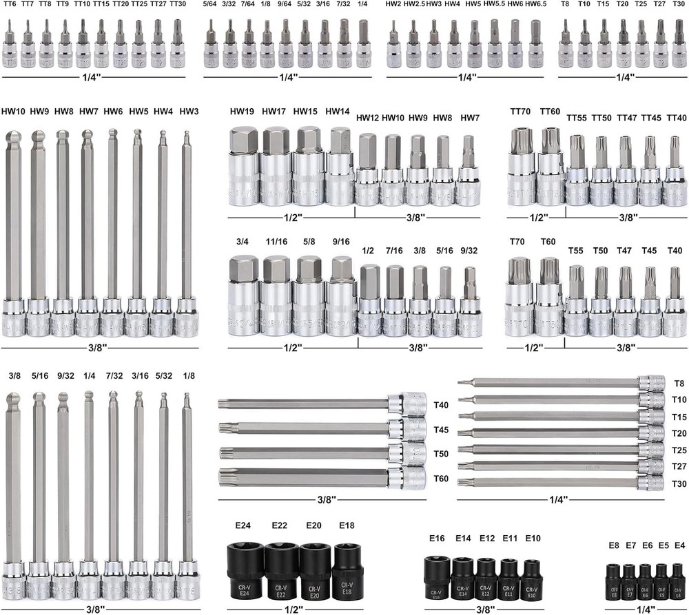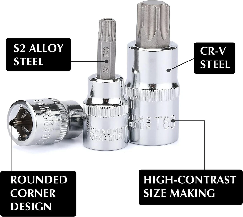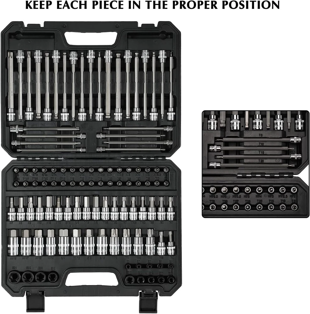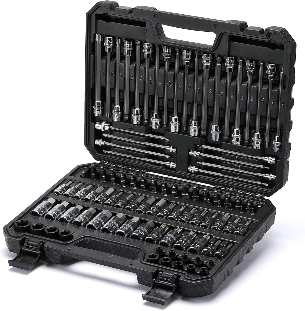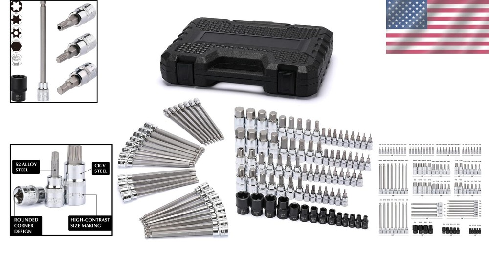 Comprehensive Bit Socket Set 107-Piece: Hex/Torx Drive with Case Included ‹ › ‹ › ‹ › ‹ › ‹ › ‹ › ‹ › ‹ › ‹ › Comprehensive Bit Socket Set 107-Piece Hex/Torx Drive with Case Included Features: Quality Construction: Socket base made of heat-treated Chrome-Vanadium Steel and bits crafted from S2 Alloy Steel, ensuring professional-grade durability. Versatile Set: Includes 107 pieces featuring a combination of 1/4", 3/8", and 1/2" drive Hex, Torx, tamper-proof Torx, E-trox, and long ball end hex bits for ultimate versatility. Innovative Design: Rounded corner design increases contact surface area, protecting your tools from excessive wear and prolonging their life. Easy Size Identification: High contrast and specific size markings allow for quick and effortless size selection. Sturdy Storage Case: Comes with a well-designed storage case that ensures each piece remains organized and easily accessible, keeping your workspace tidy. Meets ANSI Standards: Complies with or exceeds ANSI performance standards for quality assurance and reliability. Benefits: Experience unmatched durability with professional-grade materials. A wide array of bits means you're prepared for virtually any task. Rounded corners protect your tools and enhance longevity. Distinct markings simplify the selection process and save time. Keep your tools organized in a well-constructed case for easy transport. Why Choose Our Comprehensive Bit Socket Set? This Comprehensive Bit Socket Set is the ultimate solution for both DIY enthusiasts and professional tradespeople alike. Crafted with high-quality materials, it offers unparalleled durability that can endure the rigors of daily use. With a versatile selection of bits and a sturdy case, this set is not just a toolset; it’s an investment in quality that empowers you to tackle every project with confidence. Elevate your toolkit today with our 107-Piece Bit Socket Set - order now and experience the difference in quality and performance! Shipping Free & Fast Shipping - We offer free shipping to most of the USA with a normal delivery time of 3-7 days. However, due to the current situation, additional delivery time (up to 3 weeks) may be required for some items. Alternative Carriers - We may use alternative carriers (e.g. USPS, FedEx, UPS, etc.) to ensure your package arrives safely and on time. Due to the use of multiple carriers, we are unable to provide a tracking number automatically. Handling Time - Orders are processed and shipped within 1-2 business days of receiving cleared payment. Shipping Restrictions - Shipping to Alaska, Hawaii, Puerto Rico, Guam, and other US territories may incur shipping charges or delivery restrictions. Please contact us before ordering, or your order can be refunded/cancelled. State Restrictions - There may be restrictions based on your state of purchase. For example, certain items may not be shipped to California due to state regulations. Contact for Tracking Updates - If you require tracking updates or have any concerns about the delivery of your order, please feel free to contact us, and we will be happy to assist you. Return 30-Day Hassle-Free Returns - We want you to be completely satisfied with your purchase. If you are not, you can return the item within 30 days of receiving it for a full refund or exchange. Easy Return Process - To start a return, simply contact us and we will provide you with a prepaid return shipping label and detailed instructions. Restocking Fee - There are no restocking fees for returns. However, the buyer is responsible for return shipping costs if the return is not due to a seller's error. Refund Processing Time - Refunds will be processed within 5 business days of receiving the returned item in its condition. Payment We accept all major credit cards, PayPal, and Apple Pay for your convenience. Your payment information is secure and encrypted to ensure a safe and seamless transaction. Please complete your payment within 3 days of purchase to avoid any delays in shipping. Feedback Your feedback is extremely important to us. We strive to provide the best products and customer service possible. If you are satisfied with your purchase, please take a moment to leave us a positive review. If you have any concerns or issues with your order, please contact us before leaving negative feedback. We are committed to resolving any problems and ensuring your satisfaction. Contact Us If you have any questions or concerns, please feel free to out to our customer support team. You can contact us through the eBay messaging system. We are available Monday to Friday, 9:00 am to 5:00 pm EST, and we will do our best to respond to your inquiry within 24 hours. Buy it now and enjoy a pleasant shopping experience! Manufacturer Part Number: Socket Bit Set Unit Quantity: 14.39 Tools Included: Bit Socket Set System of Measurement: Metric,SAE Size: 1/4in.,3/8in.,1/2in. Socket Type: Standard Drive Type: Torx Drive Size: 3/8in. Surface Finish: Chrome Number of Pieces: 107 Unit Type: lb