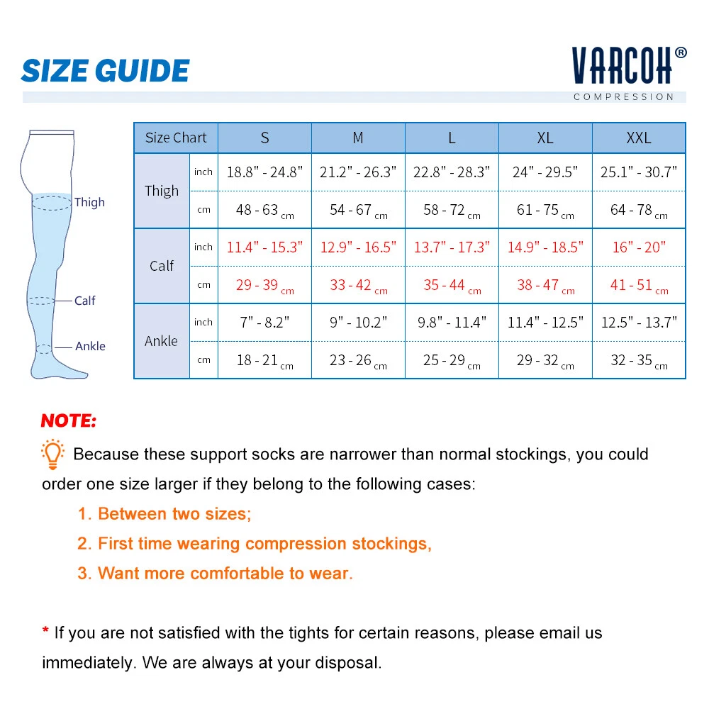 Store Categories Store Categories Other Compression Pantyhose Men's 30-40 mmHg Stockings Medical,Nursing,Nurses Flight Product Description 30-40 mmHg Compression This stocking provides 30-40 mmHg of gradient compression and should be worn under a doctor’s supervision. This level helps relieve severe varicosities, severe edema (swelling), and chronic venous insufficiency. It helps during healing after surgical and sclerotherapy procedures and helps prevent venous ulcerations. This level also helps relieve superficial thrombophlebitis. 30-40 mmHg Very Firm Gradient Compression Indication Guide: ▸ Moderate varicose veins with mild to moderate swelling (also during pregnancy) ▸ Post-procedure of larger veins to maintain treatment success ▸ Prevention, management and treatment of DVT or Post-Thrombotic Syndrome ▸ Superficial phlebitis ▸ Mild lymphedema after decongestant therapy to maintain reduction ▸ Orthostatic/postural hypotension ▸ Post-fracture, post-traumatic edema Feature: Brand: VARCOH ® Series: Medical Gender: Unisex | Women | Men Compression Level: 30-40 mmHg Fabric: 70% Nylon, 30% Spandex Colors: Beige, Black Sizes: S – 2XL Age group: Adult Package Includes: 1 Pair Suitable for sports, training, travel, fitness, office personnel, aircraft passengers, rehabilitation. All in all, a veritable necessity for anyone working long hours standing on their feet, or those heavily invested in athletics and a fitness lifestyle. Great gift for your loved one or friend. 100% money-back guarantee. Finest product and service guarantee. Your satisfaction and health is our goal. Enjoy your shopping. Shipping Size Chart Return / Exchange Washing FAQ Shipping View All Hide Free Shipping and Fast Delivery - VARCOH ® Free Shipping on All U.S. Orders We offer free standard shipping on all orders within the U.S., including Puerto Rico, other US Territories. No minimum order is required! By default, your order will be shipped by USPS Standard Shipping ( USPS First Class ® ). Allow 3~10 Business Days to receive your order within the continental U.S. For orders to Puerto Rico , other US Territories , and Military APO's , please allow 7~15 Business Days to receive your order. PLEASE NOTE: We ship Monday - Friday. 1. We have 3 warehouses in U.S. a. Rowland Hghts, CA 91748 b. Houston, TX 77090 c. Hebron, KY 41048 Your package will be shipped from the warehouse closest to your order address. If the nearest warehouse is out of stock, it will be shipped from one of the other 2 warehouses. 2. Items are generally dispatched within 1 business days after payment is cleared. If you do not receive it within 14 business days, please contact us via eBay message. Size Chart View All Hide Compression Size Chart and Measuring - VARCOH ® Measurement Small Medium Large X-Large XX-Large cG ( Thigh ) inch: 18.8" - 24.8" cm: 48 - 63 inch: 21.2" - 26.3" cm: 54 - 67 inch: 22.8" - 28.3" cm: 58 - 72 inch: 24" - 29.5" cm: 61 - 75 inch: 25.1" - 30.7" cm: 64 - 78 cC ( Calf ) inch: 11.4" - 15.3" cm: 29 - 39 inch: 12.9" - 16.5" cm: 33 - 42 inch: 13.7" - 17.3" cm: 35 - 44 inch: 14.9" - 18.5" cm: 38 - 47 inch: 16" - 20" cm: 41 - 51 cB ( Ankle ) inch: 7" - 8.2" cm: 18 - 21 inch: 9" - 10.2" cm: 23 - 26 inch: 9.8" - 11.4" cm: 25 - 29 inch: 11.4" - 12.5" cm: 29 - 32 inch: 12.5" - 13.7" cm: 32 - 35 This size chart applies to all Varcoh ® brand compression products. ▲ Please swipe right on the size table. >>> SIZE NOTE: Because these support socks are narrower than normal stockings, you could order one size larger if they belong to the following cases. 1. Between two sizes. 2. First time wearing compression socks or pantyhose. 3. Want more comfortable to wear. If you don't know how to choose the size, please contact us. How To Measure Your Legs For Compression Socks? Compression therapy refers to the use of specialized garments for the management of chronic venous disease and lymphedema. The compression pressure reduces swelling by moving excess fluid back into the capillaries which helps prevent the fluid from leaking. The garments also reduce the ability of superficial veins from expanding and overfilling with blood. Calf sleeve, compression socks, and pantyhose meet your specific needs. However, in order to relieve cramps and prevent swelling it ’s crucial that you choose the right size. How to measure ankle, calf and thigh? 1. Do your first thing in the morning before your legs start to swell. Otherwise, you may choose a size that is too large. Note: If you or your doctor don't measure your legs until one day later, you can raise, bandage or pump your legs to reduce swelling. 2. Ankle Measurement: Measure the circumference of your ankle by placing the measuring tape at the narrowest part of the ankle and wrapping it around to make a circle. This should always be your first measurement. 3. Calf Measurement: Find the widest part of your calf and measure the circumference. 4. Thigh Measurement: Find the widest part of your thigh, right under your buttocks and measure the circumference. 5. Leg Length: Measure the distance from your buttocks to the floor. Return / Exchange View All Hide 30-Day Returns and Exchanges Policy - VARCOH ® How To Return Or Exchange We have high quality control standard to make sure all the products we ship in perfect conditions, however, a return or an exchange request is unavoidable. If for some reason you are not 100% satisfied with your purchase, we will gladly help you return your item. We suggest to inspect your package upon arrival. In the rare case there is a damaged item, missing item or an incorrect item in package, please contact us immediately, so we can correct any problems. Return / Exchange Guidelines: To make return / exchange service as easy as possible, please follow the guidelines as below: 1. Please contact us before submitting an eBay return request or case. 2. All returned products must be in their original condition, unworn, unwashed. 3. Please return through your local p