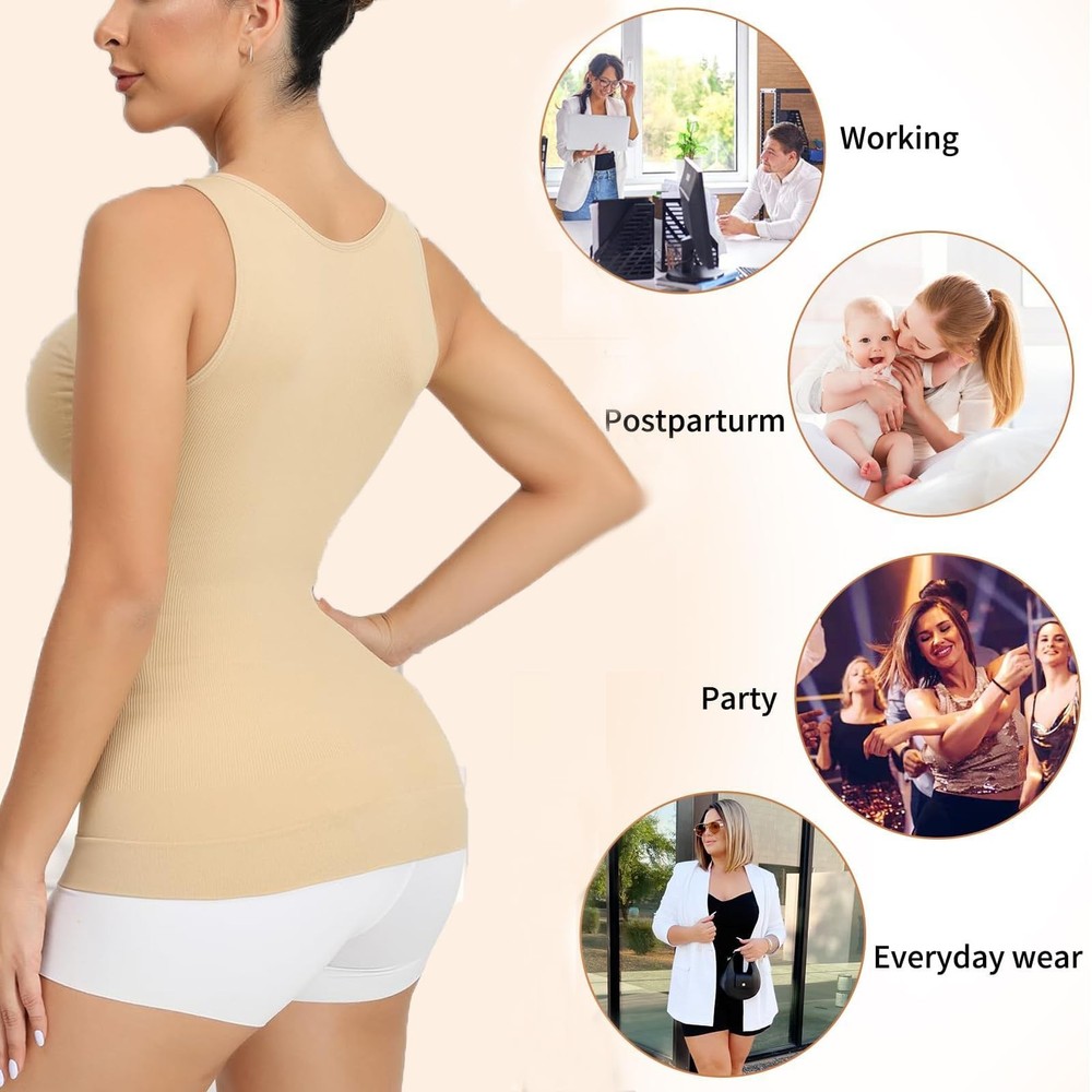 Select a tummy control shapewear tank top that corresponds to your measurements. Refer to the sizing chart provided by the manufacturer to ensure an accurate fit. 【Removable Cami Shaper With Built In Bra】compression tanks for women suitable for different size busts, comfy fit without moving/ folding or pad lines. and have good support. The removable pads provide slightly support and snug your breast with no compression, You can also remove the pads and wear your own bra as your choice. and you can remove it when you washing. 【Breathable & Comfortable Fabric】shapewear tank top is made of 96% nylon 16% Spandex, soft, breathable and not sticky, sufficient stretch to fit people of different body types, without rubbing the skin super comfy for all-day wear. 【Shape Around Your Body Curves】Womens shapewear tank top with built in bra and Lace wide shoulder straps that they don't dig in. The charming V-neck design helps to improve your neckline, highlight your charming collarbone, enhance your temperament greatly. Double-layer strengthened hem reduce the bottom rolling up when you move. 【No Compression In Bust Area】shapewear tank tops for women the control starts under the bust area. No worry about compressing your breasts. you can choose to wear your own bra or go without one. This shapewear cami offers a snug fit for your breasts without causing excessive compression. It ensures comfort while properly lifting and enhancing your bust. 【Seamless Shapewear Tank Top Wear Correctly】Body contour high compression tank Stretchy camisoles should always be put on feet first and then gently tugged up to the chest. fit. The slimming cami suitable for any occasion, as party, evening, date, work, daily life ect, and prefect to worn with shorts, jeans, pants, skirts, high heels, boots. You will look better and feel more confident to wear it for formal occasions, work or daily life.