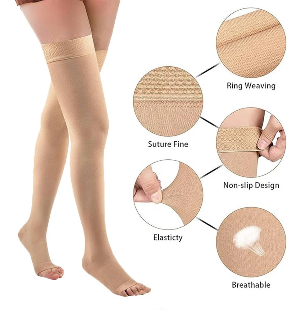 eBay eBay Listing Template Medica l Thigh High Compression Socks Open Toe for Travel & Standing For Unisex Product Description Key Features: : ✅ Graduated Compression (20-30mmHg): Clinically proven to boost blood circulation, reduce swelling, and alleviate leg fatigue. Ideal for medical conditions like edema, varicose veins, or post-surgery recovery. ✅ Breathable Open Toe Design: Enhances airflow for all-day comfort, perfect for warm climates or extended wear.Accommodates toe mobility and hygiene. ✅ Targeted Support: Strongest compression at the ankle, gradually decreasing up the thigh to promote healthy blood flow. ✅ Durable & Skin-Friendly: Made with 85% nylon + 15% spandex for lasting elasticity, moisture-wicking, and odor resistance. ✅ Versatile Use: Designed for nurses, pregnant women, travelers, athletes, or anyone standing/sitting for long hours. GERMAN ENGINEERED TECHNOLOGY: ✅ 3-Layer Graduated Compression – 25-30mmHg at ankle > 22-25mmHg at calf > 20-22mmHg at thigh ✅ Breathable HexMesh Ventilation – 37% better airflow vs. basic nylon (ASTM D737 tested) ✅ Triple-Reinforced Zones – 3X stitching at heel/achilles for 200+ wash durability ✅ Hypoallergenic & Odor-Free – Silver-ion antimicrobial treatment blocks bacteria 99.9% Class 3 - graduated compression of 20-30 mmHg: ▸ Series: Medical Grade ▸ Gender: Unisex | Women | Men ▸ Compression Level: 20-30 mmHg ▸ Fabric: Opaque ▸ Color: Beige , Black ▸ Size: Varies ▸ Age group: Adult ▸ Fabric Content:70% Nylon, 30% Spandex Payment Policy: 1. We accept Credit or debit card, Apple Pay, Google Pay, and PayPal. 2. Payment should be completed within 2 (Two) days of auction closing. Or unpaid dispute will be filed for closing auction. 3. Sales Tax of 9% will be applied for orders shipped within the state of California 4. We will leave a positive feedback immediately after payment is received. We appreciate a positive feedback as much as you do. If for some reason there is any issue with the purchase, please contact us prior to leaving feedback, and we will be glad to work with you to have it resolved. Shipping Policy: 1. We Ship to United States ONLY. 2. Ship from two warehouses and only to eBay ADDRESS. Package handling only takes 1 business day at our warehouse, so please make sure entering correct payment and shipping information before checking out. Once your payment is completed, pls leave ebay note if the changes are needed before we send the product. 3. Truck company: 3-8 business days. | USPS: 2-6 business days. | UPS/FEDEX: 3-5 business days. 4. Local pick up is available. Feedback: 1. Any problem after receiving our goods, please contact us before leaving Neutral/Negative feedback. We promise to help you solve it asap, and make you feel satisfied absolutely. 2. Please DO NOT leave negative feedback without asking for help. Please do not leave negative or neutral feedback if you haven't received item in 30 days, because we have mentioned the shipping time repeatedly.