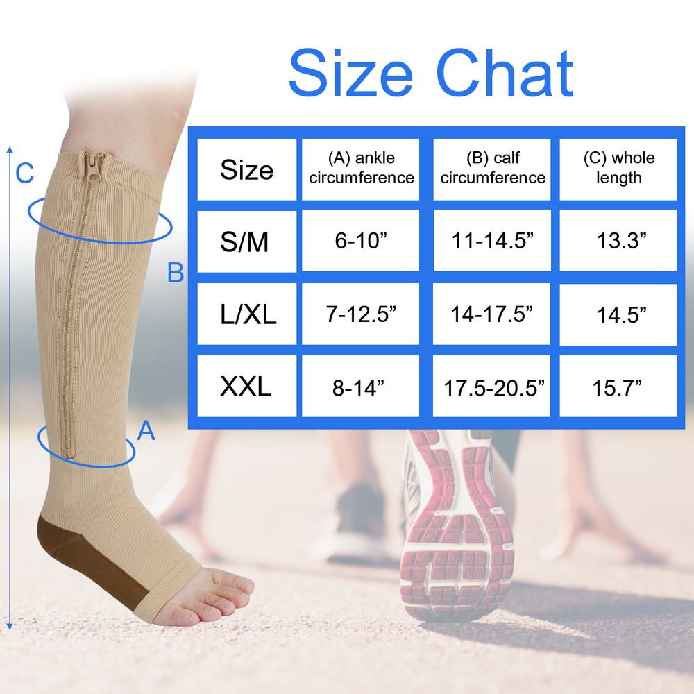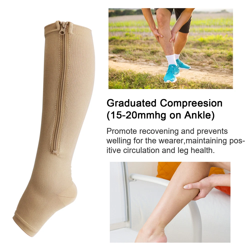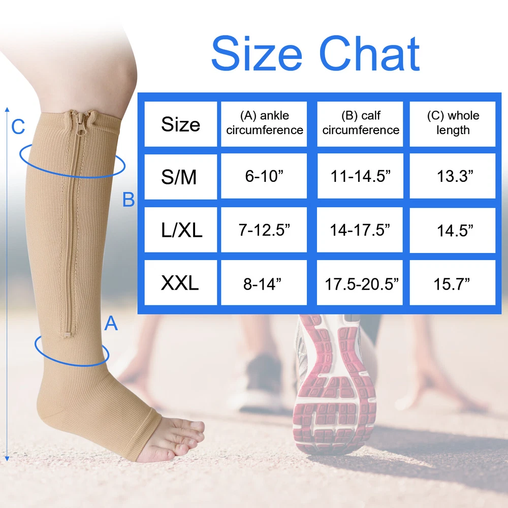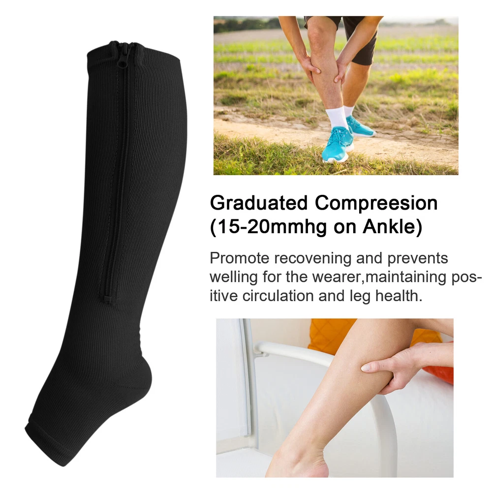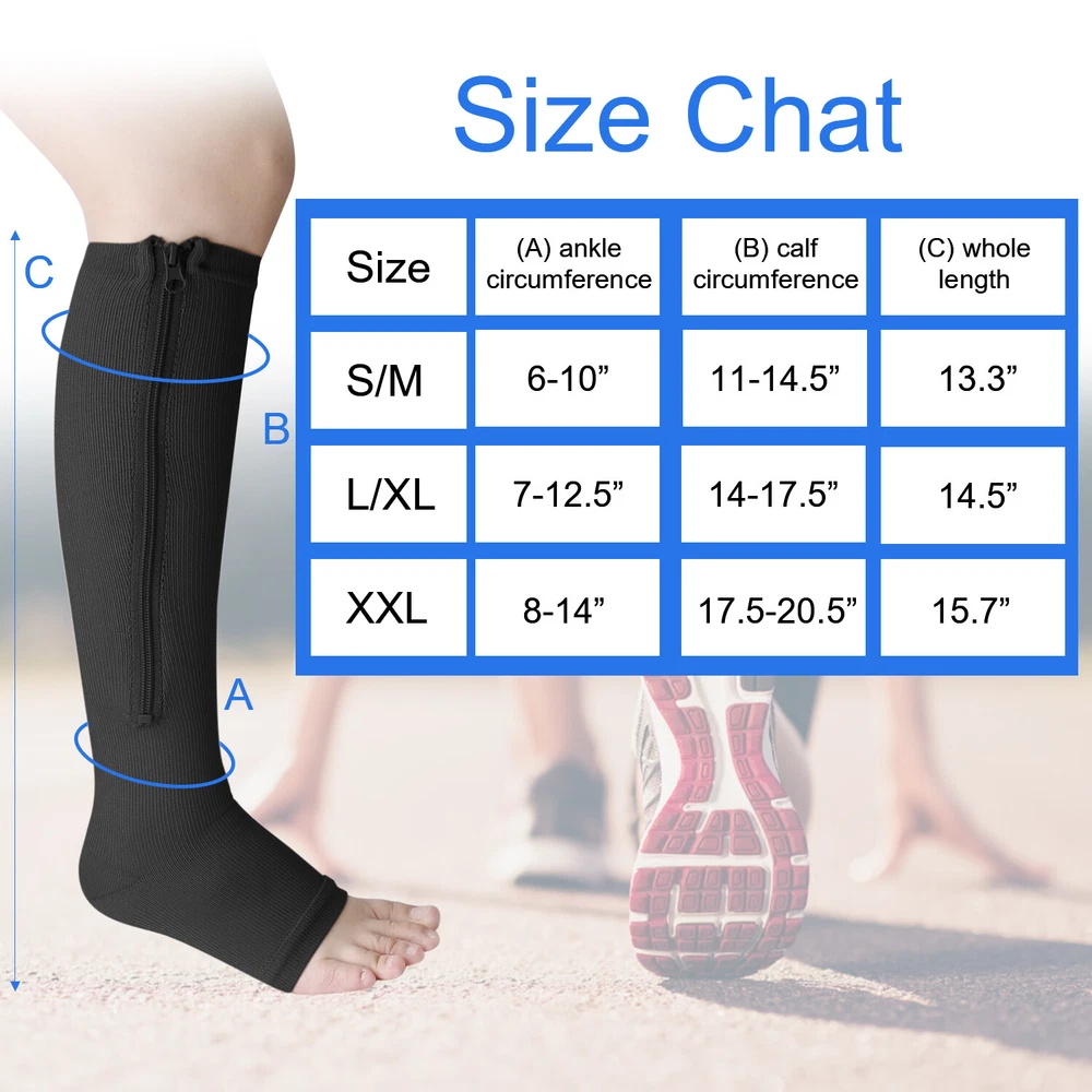 Features: Our knee high compression socks are made of a high-quality mixture of 25% spandex and 75% nylon, can provide long-lasting and durable use. High-performance fabrics made of breathable and moisture-absorbing materials can maintain an optimal temperature and provide greater comfort. These zipper compression socks can give the legs and ankle 15-20 mmHg compression pressure, it enhances blood circulation effectively, helps reduce leg fatigue, foot pain and ankle swelling. Therapeutic compression hosiery promotes blood circulation and helps relieve tired, aching, fatigued legs. Ideal for treatment of varicose and spider veins, diabetic support, long flights, nurses, maternity, and general swelling or inflammation of the legs and feet. The graduated compression provides maximum compression at the ankle with a progressive reduction through the calf promoting blood flow back to the heart. It helps reduce and prevent swelling for the wearer, maintaining positive circulation and leg health. Package include: 1 pair socks Notice: 1.Due to the different monitor and light effect, the actual color maybe a slight different from the picture color. 2.Please allow 2-3cm differs due to manual measurement.