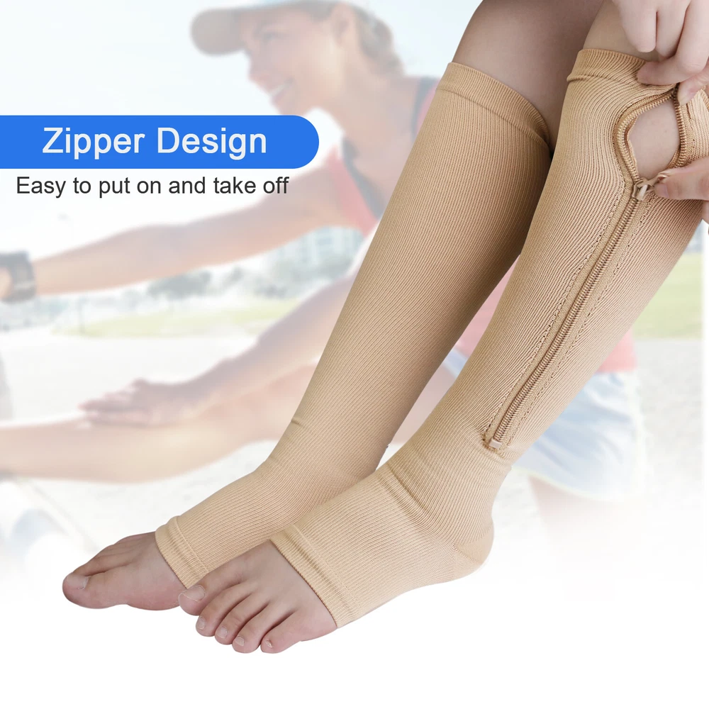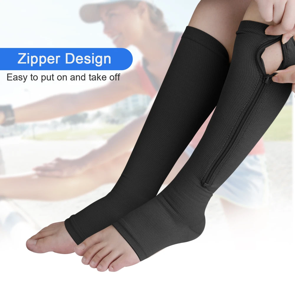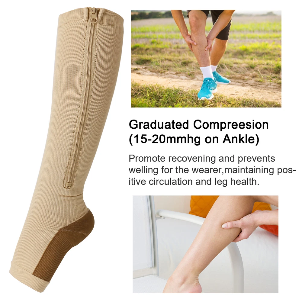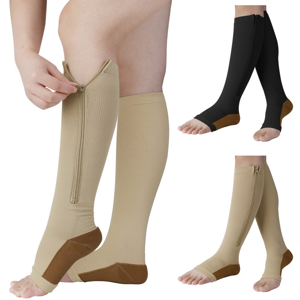 Features: Our knee high compression socks are made of a high-quality mixture of 25% spandex and 75% nylon, can provide long-lasting and durable use. High-performance fabrics made of breathable and moisture-absorbing materials can maintain an optimal temperature and provide greater comfort. These zipper compression socks can give the legs and ankle 15-20 mmHg compression pressure, it enhances blood circulation effectively, helps reduce leg fatigue, foot pain and ankle swelling. Therapeutic compression hosiery promotes blood circulation and helps relieve tired, aching, fatigued legs. Ideal for treatment of varicose and spider veins, diabetic support, long flights, nurses, maternity, and general swelling or inflammation of the legs and feet. The graduated compression provides maximum compression at the ankle with a progressive reduction through the calf promoting blood flow back to the heart. It helps reduce and prevent swelling for the wearer, maintaining positive circulation and leg health. Package include: 1 pair socks Notice: 1.Due to the different monitor and light effect, the actual color maybe a slight different from the picture color. 2.Please allow 2-3cm differs due to manual measurement.