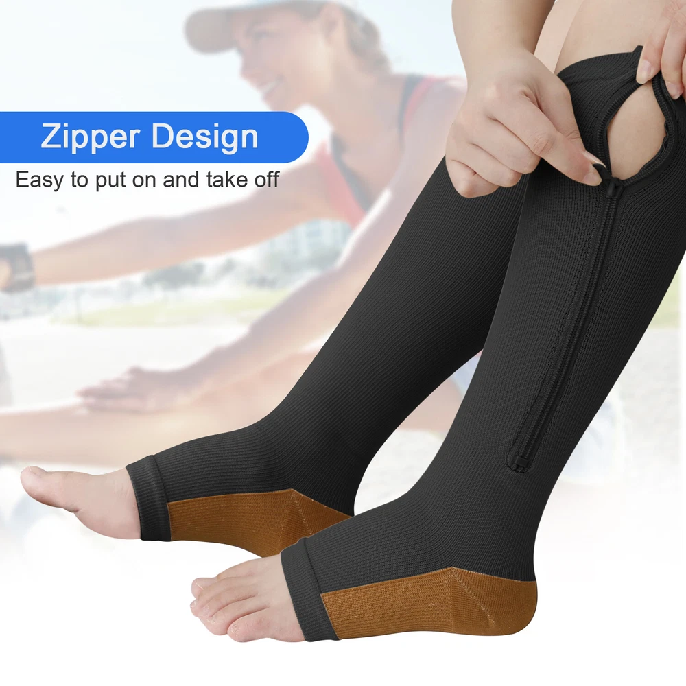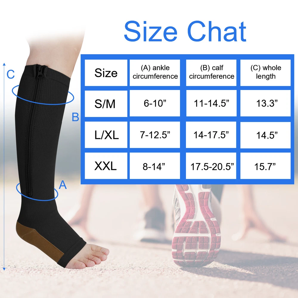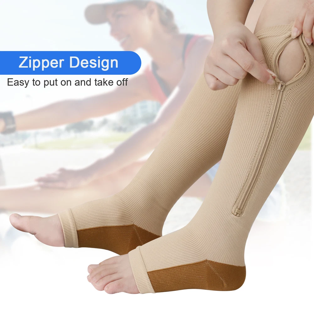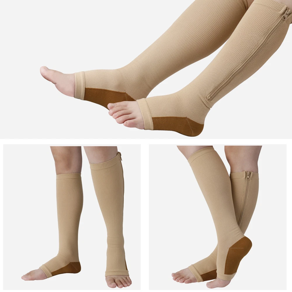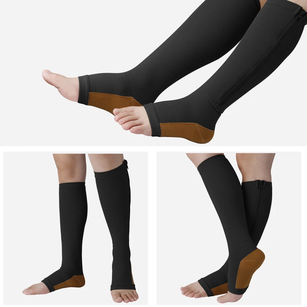Features: Our knee high compression socks are made of a high-quality mixture of 25% spandex and 75% nylon, can provide long-lasting and durable use. High-performance fabrics made of breathable and moisture-absorbing materials can maintain an optimal temperature and provide greater comfort. These zipper compression socks can give the legs and ankle 15-20 mmHg compression pressure, it enhances blood circulation effectively, helps reduce leg fatigue, foot pain and ankle swelling. Therapeutic compression hosiery promotes blood circulation and helps relieve tired, aching, fatigued legs. Ideal for treatment of varicose and spider veins, diabetic support, long flights, nurses, maternity, and general swelling or inflammation of the legs and feet. The graduated compression provides maximum compression at the ankle with a progressive reduction through the calf promoting blood flow back to the heart. It helps reduce and prevent swelling for the wearer, maintaining positive circulation and leg health. Package include: 1 pair socks Notice: 1.Due to the different monitor and light effect, the actual color maybe a slight different from the picture color. 2.Please allow 2-3cm differs due to manual measurement.