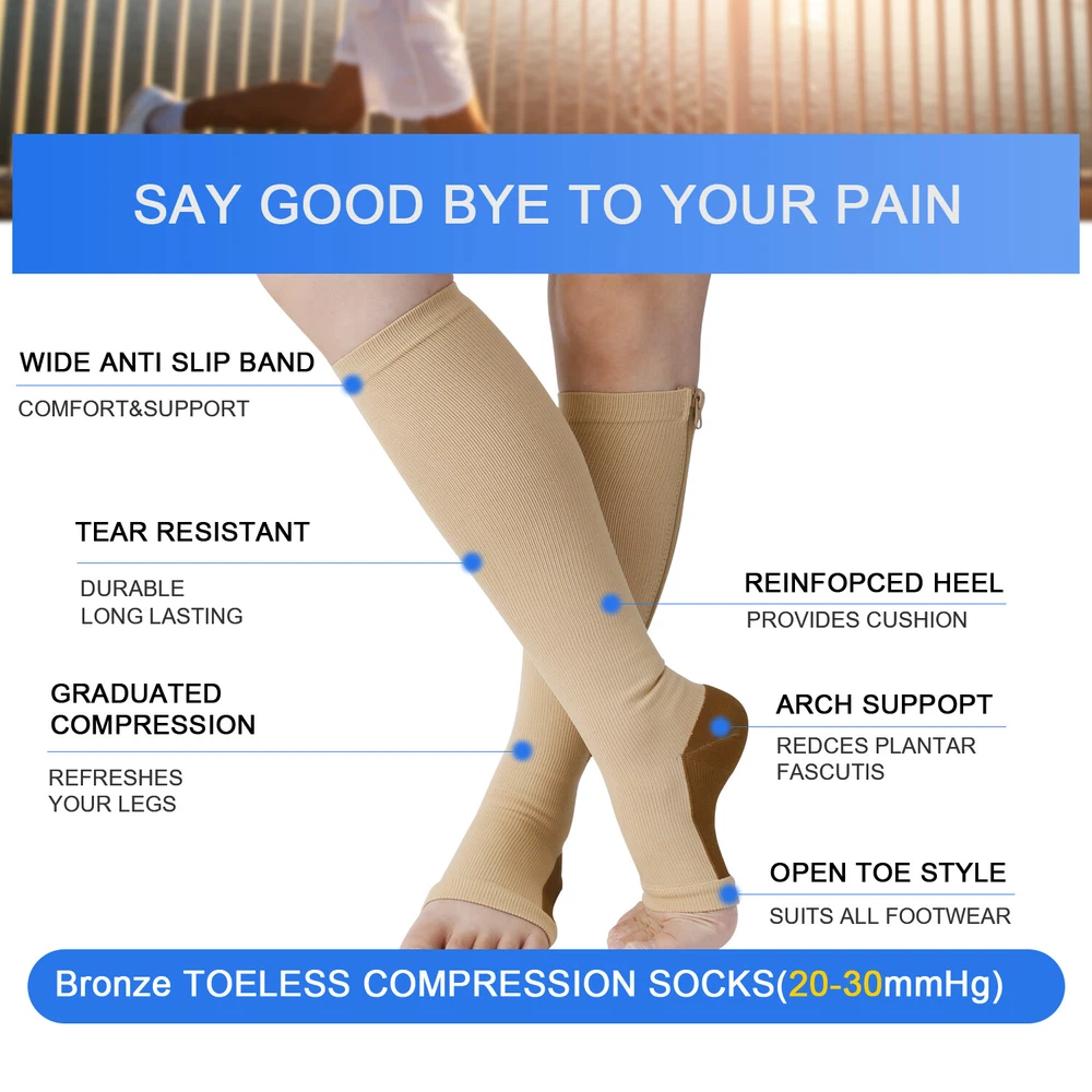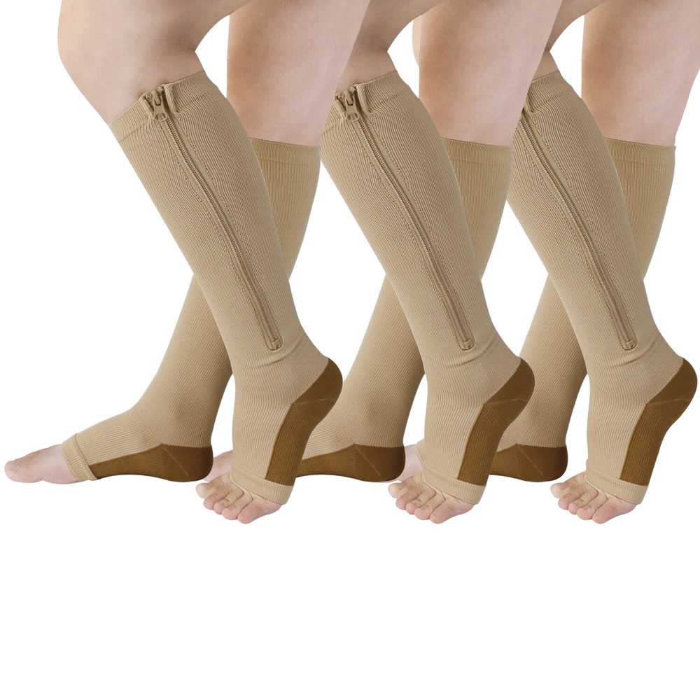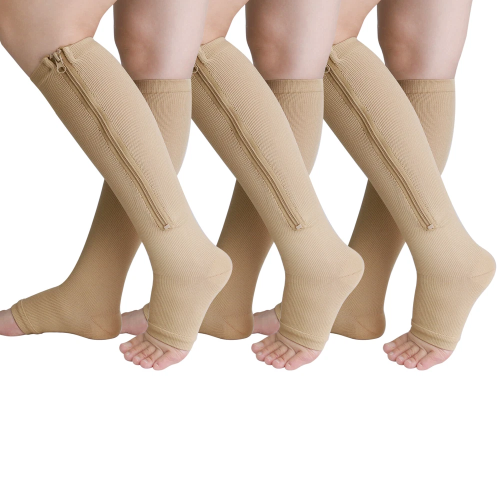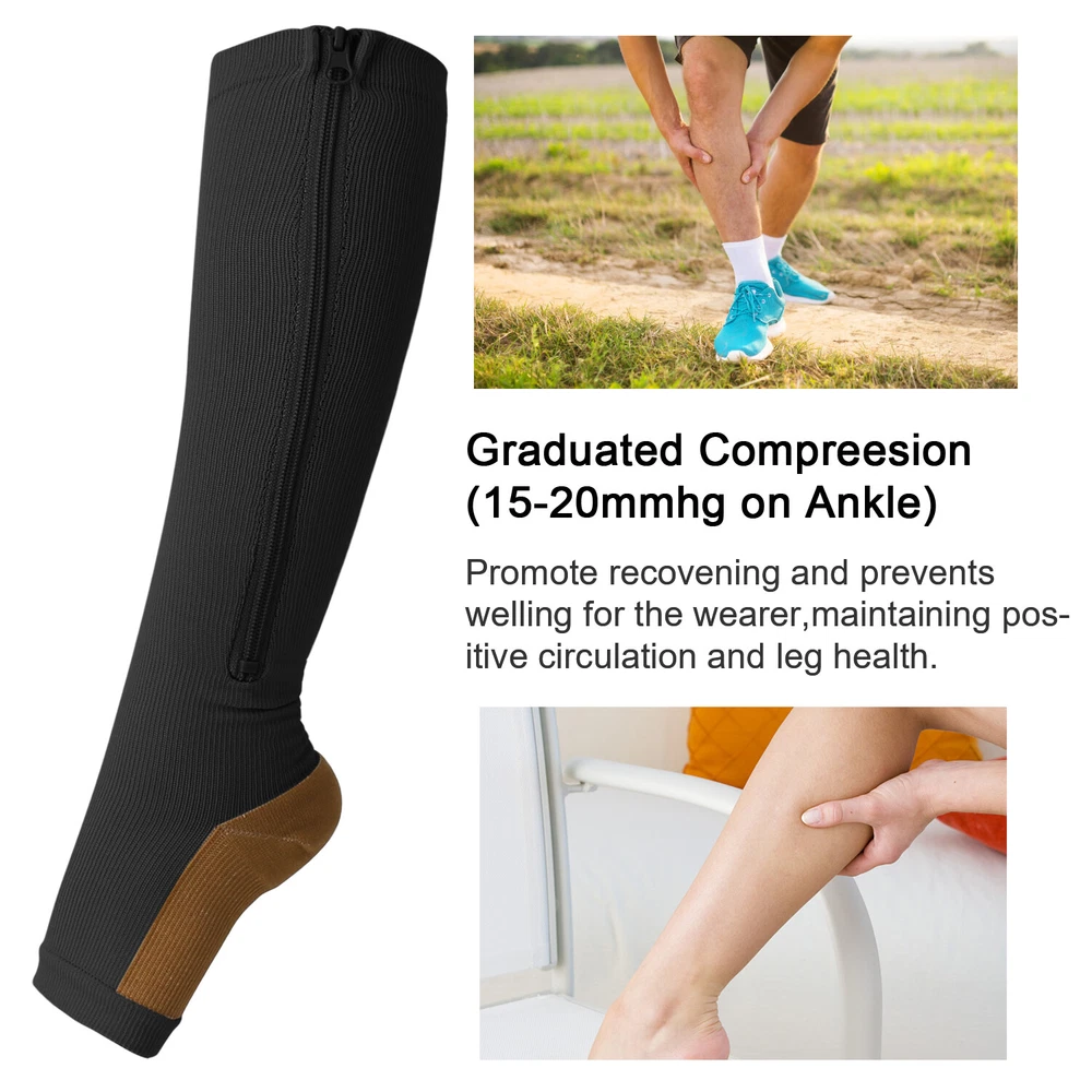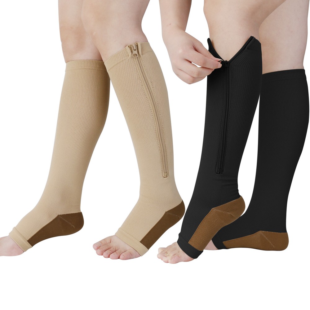 Features: Our knee high compression socks are made of a high-quality mixture of 25% spandex and 75% nylon, can provide long-lasting and durable use. High-performance fabrics made of breathable and moisture-absorbing materials can maintain an optimal temperature and provide greater comfort. These zipper compression socks can give the legs and ankle 15-20 mmHg compression pressure, it enhances blood circulation effectively, helps reduce leg fatigue, foot pain and ankle swelling. Therapeutic compression hosiery promotes blood circulation and helps relieve tired, aching, fatigued legs. Ideal for treatment of varicose and spider veins, diabetic support, long flights, nurses, maternity, and general swelling or inflammation of the legs and feet. The graduated compression provides maximum compression at the ankle with a progressive reduction through the calf promoting blood flow back to the heart. It helps reduce and prevent swelling for the wearer, maintaining positive circulation and leg health. Package include: 1 pair socks Notice: 1.Due to the different monitor and light effect, the actual color maybe a slight different from the picture color. 2.Please allow 2-3cm differs due to manual measurement.