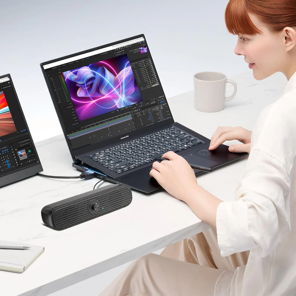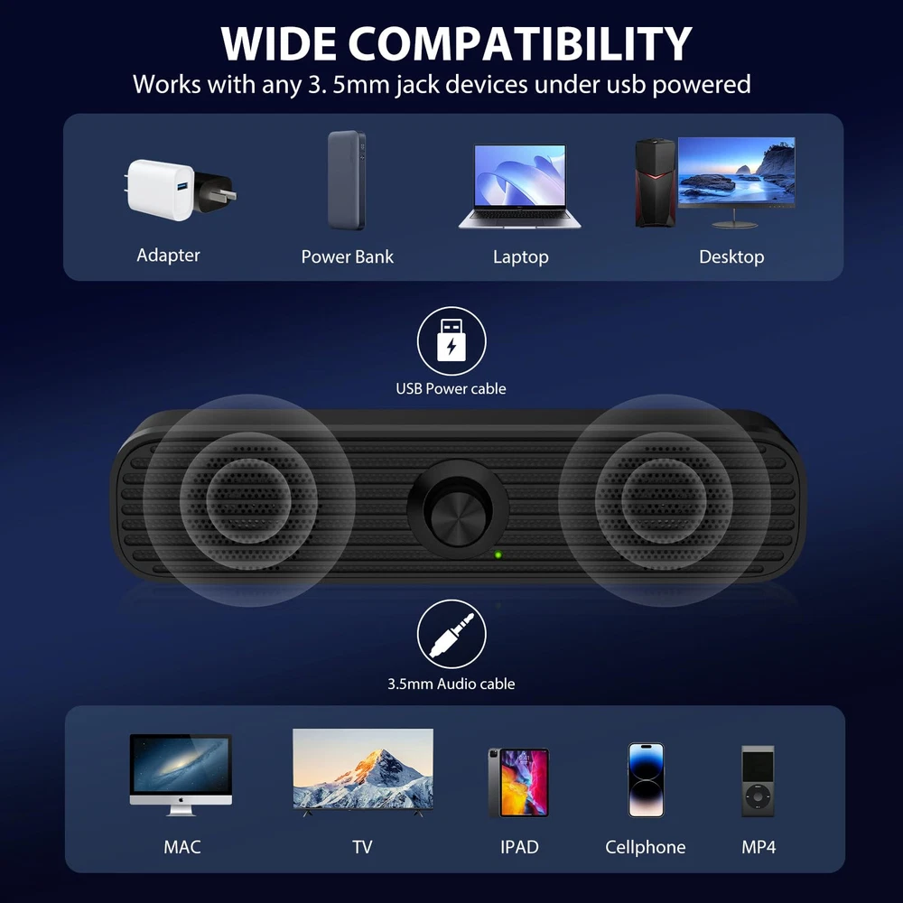 Wide Compatibility: The Computer Speakers can work with any devices that has a standard 3.5mm AUX audio jack, any brands or models of Windows(7/8/10/11) or Linux PCs, MacOS laptops, desktop monitors, laptops, tablets, cellphones, MP3, MP4. Warm Tips: The speaker is not compatible with some products, please check whether your device has an AUX port before purchase.The USB charging cable and 3.5mm audio cable must be inserted at the same time to work. Enhanced Stereo Sound: Built-in dual 3W stereo speakers of the desktop speakers can deliver you loud and crystal clear voice sound, deep bouncy bass and all the details you want to hear clearly, providing immersive Hi-Fi audio listening and immersive gaming experience. The USB wired speaker is perfect for you to enjoy wonderful movies, videos, music and games. Rotary Volume Control Knob: With the front rotary knob of the PC speakers, you can steplessly adjust the volume level as you wish. No matter loud and immersive action movie or quiet and peaceful music, the desk speakers can always satisfy your needs. No need to find out the volume setting on your device and no complicate operations, just rotate and enjoy. Mini and Space-saving for Desk: The USB speaker size is only 26 x 6 x 6.3 cm/ 10.2 x 2.4 x 2.5 in, it can fit into any corner on your desk, table, shelf or other narrow space under your desktop monitor or PC. Under the laptop speakers are anti-slip silicone pads to prevent unwanted scratches from your furniture or electronics. Elegant and delicate design, simple but classic to match your room style. Plug and Play: Just connect the speaker with your powered device or DC power adapter via USB-A cable, then plug the 3.5mm audio cable into the 3.5mm AUX jack, rotate the volume knob to moderate volume level. For some device you might need to switch the audio output to the speaker. Then the computer speakers for desktop pc are ready to play stereo music for you. The two USB-A and audio cables are connected as one for neat organization, also you can divide them as you like. Warm Tips: Using this computer speaker requires your device to have a 3.5mm AUX audio output port. The USB charging cable and 3.5mm audio cable must be inserted at the same time to work