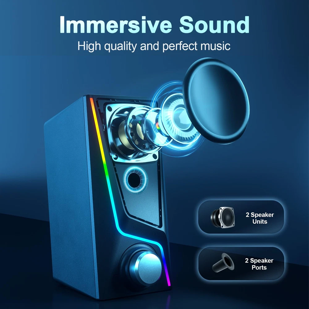【Dynamic 2.1 Channel Audio】: Elevate your audio experience with 28W computer speakers with subwoofer, providing distortion-free Hi-Fi sound for enhancing music, movies, and gaming journey with two large speakers. 【Boosted Bass Performance】: Enjoy the deep, resonant bass from the 2.1 speaker system. The wired subwoofer's 4 inch speaker unit and downward-facing design maximizes ground reflection, enriching the low-end frequencies for a fuller sound. 【Sleek Touch Control Illumination】: Customize your audio ambiance with touch control lighting for desktop speakers, featuring symphony, flow, breathing and 3 solid colors, providing a bespoke auditory experience at the tip of your fingers. 【Easy Controls and Compact Size】:These computer speakers for desktop pc offer a convenient volume knob and compact design for easy setup and space-saving. The dimensions are 7"W*3.23"H*4.93"D of the speaker and 7.8"W*5.75"H* 4.76"D of the subwoofer. 【User-friendly Plug and Play】: Simply connect these PC speakers with subwoofer to your PC, laptop, monitor, or tablet using the included USB/USB-C and 3.5mm audio cables (No Bluetooth). No driver is needed, allowing you to dive into your audio experience immediately.