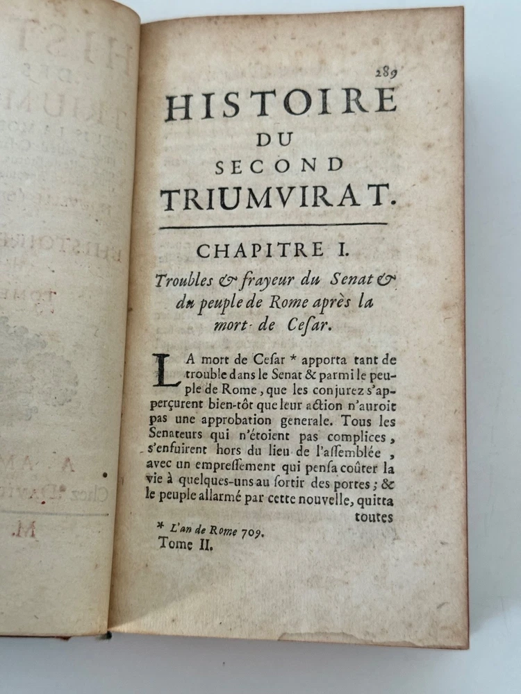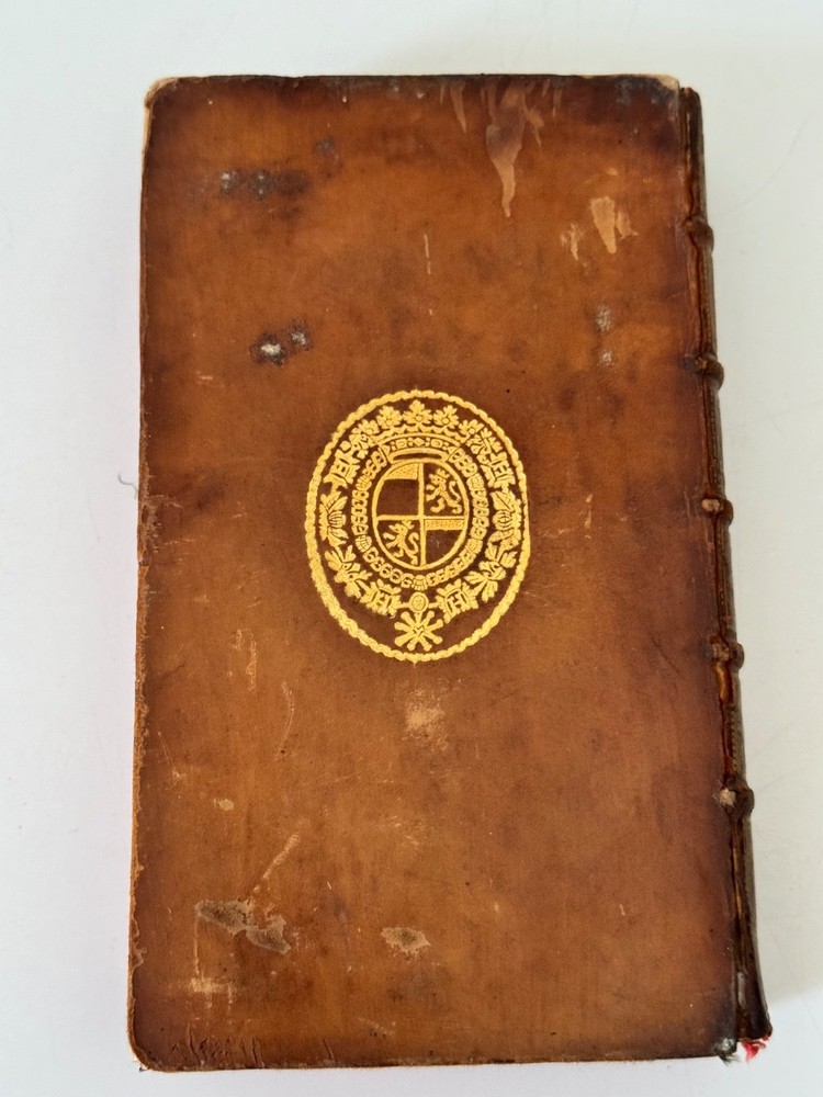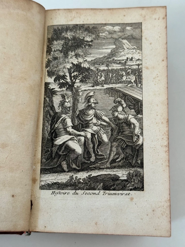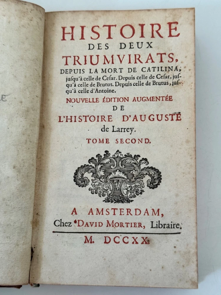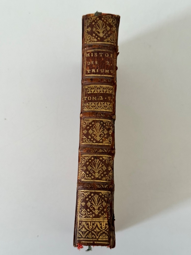 Comtes de Vintimille - Reliure armoriée française d’époque, portant les armes des comtes de Vintimille, grande famille - 1720 Histoire des deux Triumvirats… Amsterdam, David Mortier, 1720. Tome second (et troisième). In-12, plein veau brun de l’époque, dos à nerfs orné, pièces de titre, tranches rouges, grand fer armorié doré frappé au centre des plats (armoiries écartelées des comtes de Vintimille, couronne comtale et collier d’ordre). Belle édition Mortier, typique des impressions hollandaises du début du XVIIIᵉ. Exemplaire dans sa reliure armoriée française d’époque, portant les armes des comtes de Vintimille, grande famille provençale (écartelé aux lions affrontés, couronne comtale, riche collier d’ordre). Fer large et finement poussé, d’une grande qualité de frappe. Reliure frottée, petits manques au dos, mais ensemble solide. Intérieur sain, titre imprimé en rouge et noir.
