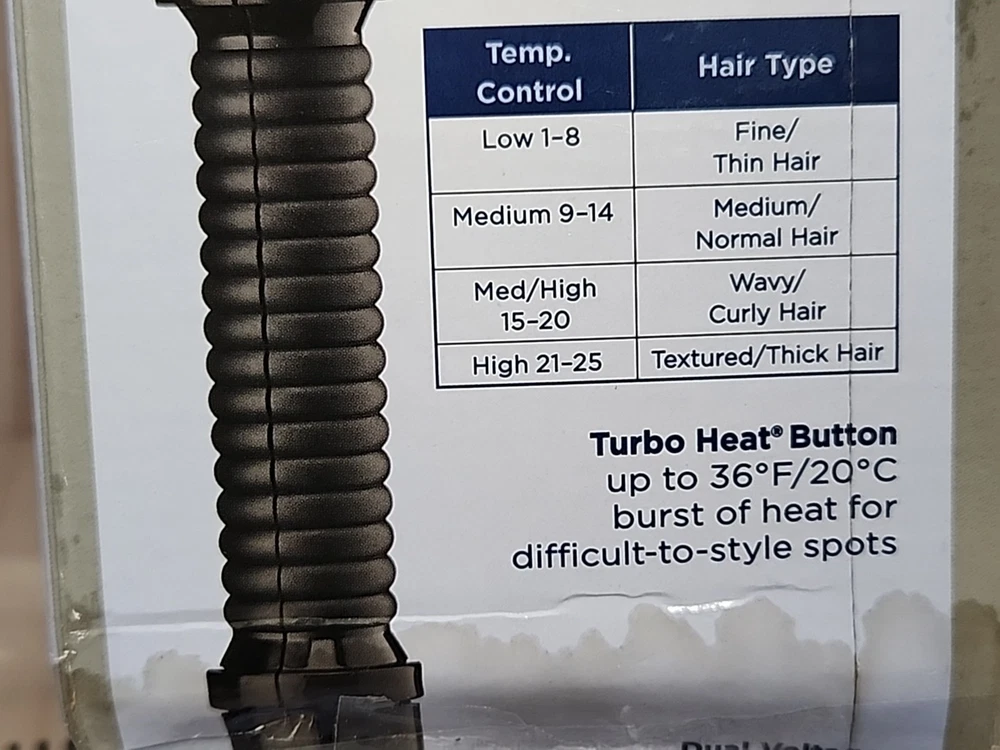 gtin13: 074108328786 Barrel Size: 3/4 in. Type: Hair Curling Irons Country/Region of Manufacture: China Seller Notes: “new open box, outside box damage” Power Source: Electric Features: Instant Heat, Auto Shut-Off UPC: 074108328786 Number of Temperature Settings: 25 MPN: Does Not Apply Style: Hair Curling Irons Model: Conair Turbo Hair Type: All Hair Types Brand: Conair Color: Black