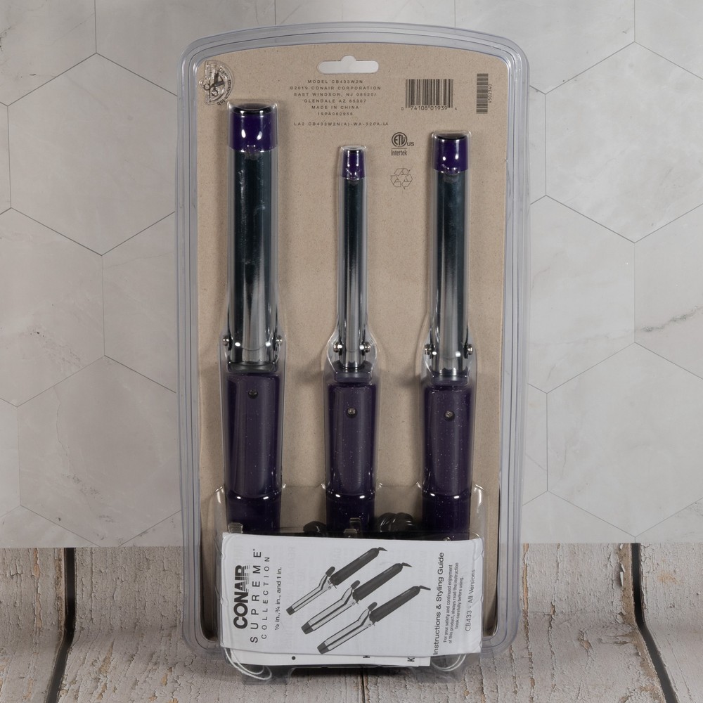 Enjoy salon-quality curls at home with these Conair Supreme Triple Value Pack Curling Irons. The 1/2" barrel creates tight curls, the 3/4" iron creates small curls and the 1" barrel is ideal for classic curls. Includes a 1/2" curling iron, a 3/4" curling iron and a 1" curling iron. Titanium plates offer durability. Each iron features an indicator light for safe use. Built-in counter rests promote safe handling.
