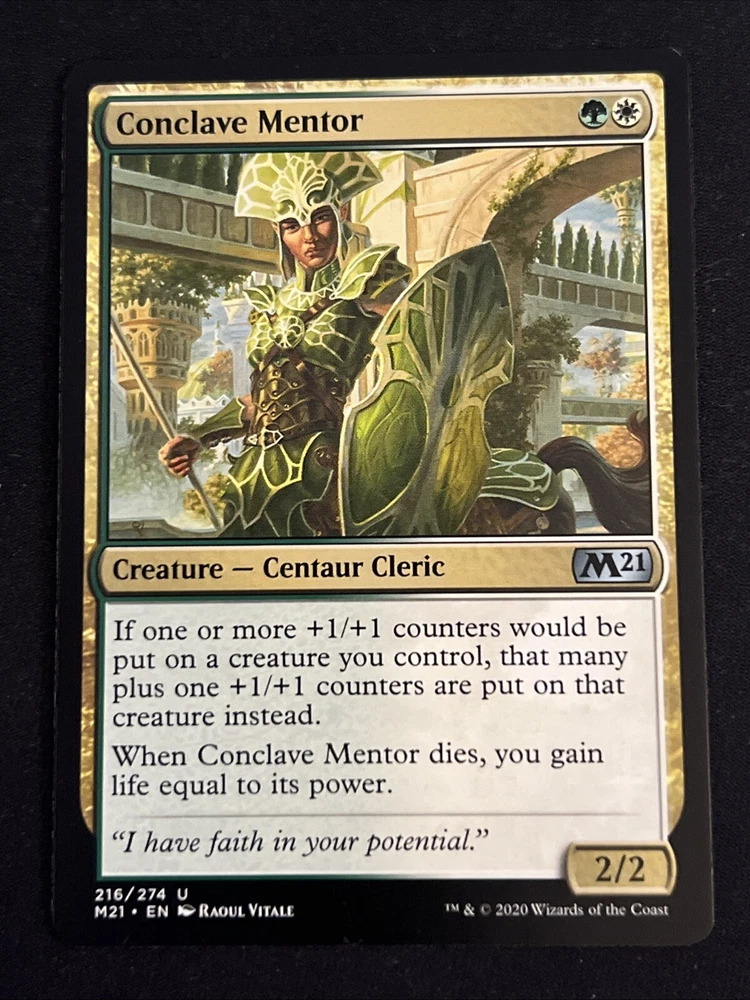When Conclave Mentor dies, you gain life equal to its power.Illustrator:Raoul VitaleRarity:UncommonManufacturer:Wizards of the CoastAttribute/MTG:Color:White, GreenAdditional Description:Conclave MentorCreature/Monster Type:Cleric, CentaurLanguage:EnglishCard Name:Conclave MentorDefense/Toughness:2brand:Wizards of the Coast