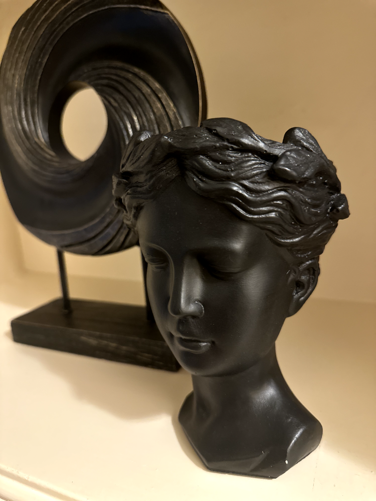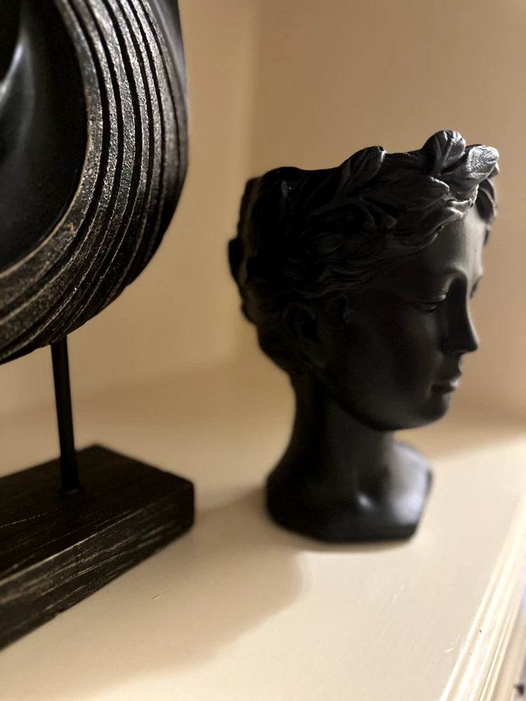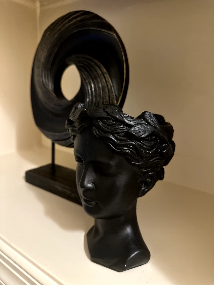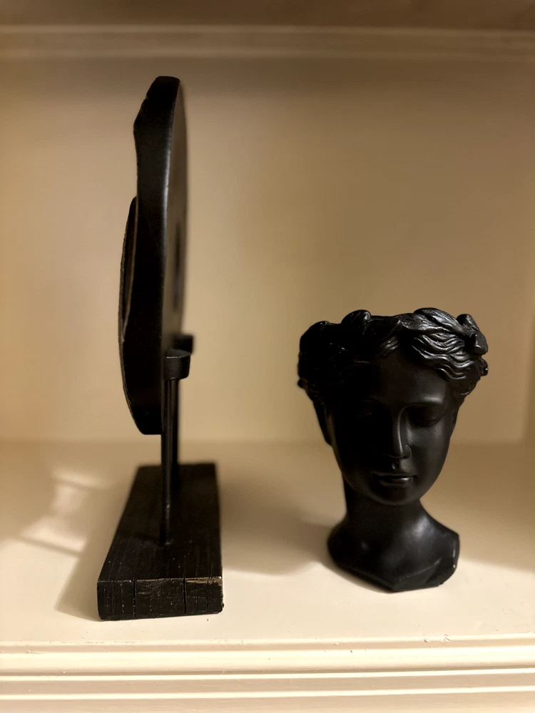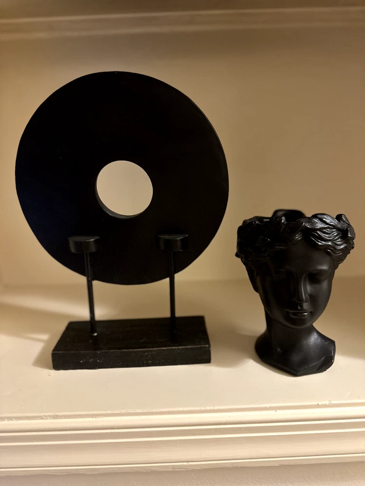 Roman Goddess Venus Planter This concrete Venus statue planter is uniquely designed as a Greco-Roman era statue. The bust head is finished with black paint to enhance the antique look. Makes a great piece to display small plants, herbs, and succulents. This item is handmade and was purchased off Etsy for $70. Overall: 6" W x 5.25" D x 7.25" H Planting Area: 3.75" W x 4" D x 2.75" H Decorative Medallion on Stand - Black & Gold Features a captivating pattern, bringing a modern and artistic element to any room. Whether displayed on a shelf, mantel, or entryway table, this decorative plate is sure to complement a variety of decor styles. Overall: 7.75" W x 3" D x 13.75" H