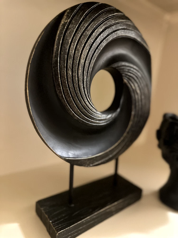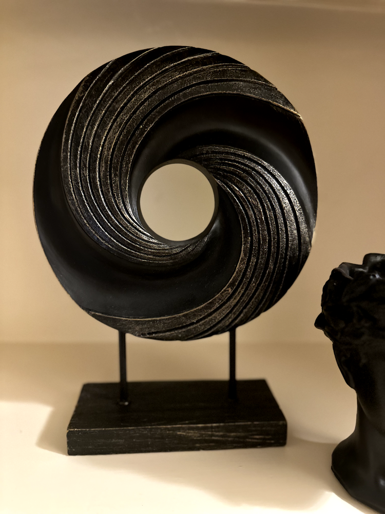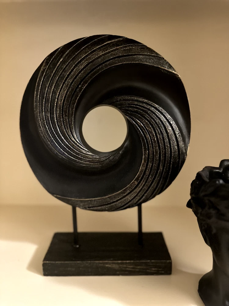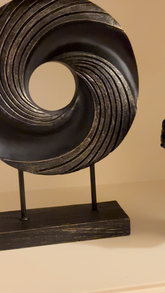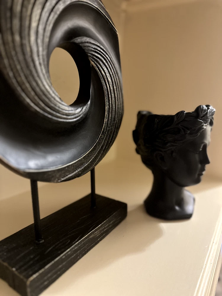 Roman Goddess Venus Planter This concrete Venus statue planter is uniquely designed as a Greco-Roman era statue. The bust head is finished with black paint to enhance the antique look. Makes a great piece to display small plants, herbs, and succulents. This item is handmade and was purchased off Etsy for $70. Overall: 6" W x 5.25" D x 7.25" H Planting Area: 3.75" W x 4" D x 2.75" H Decorative Medallion on Stand - Black & Gold Features a captivating pattern, bringing a modern and artistic element to any room. Whether displayed on a shelf, mantel, or entryway table, this decorative plate is sure to complement a variety of decor styles. Overall: 7.75" W x 3" D x 13.75" H