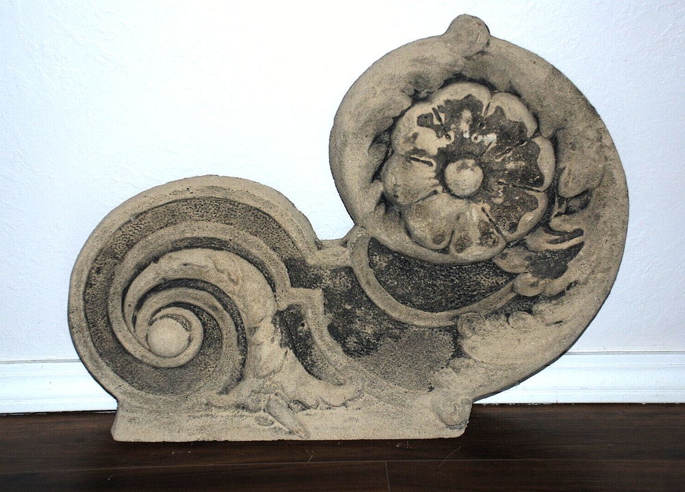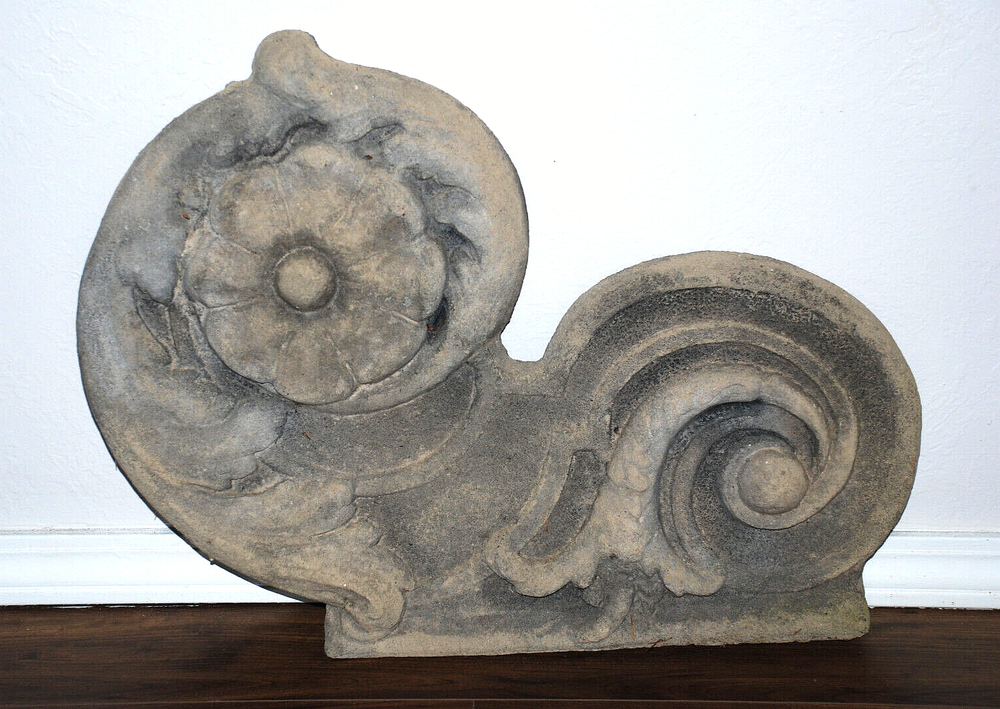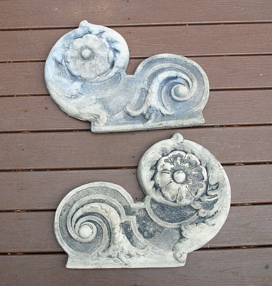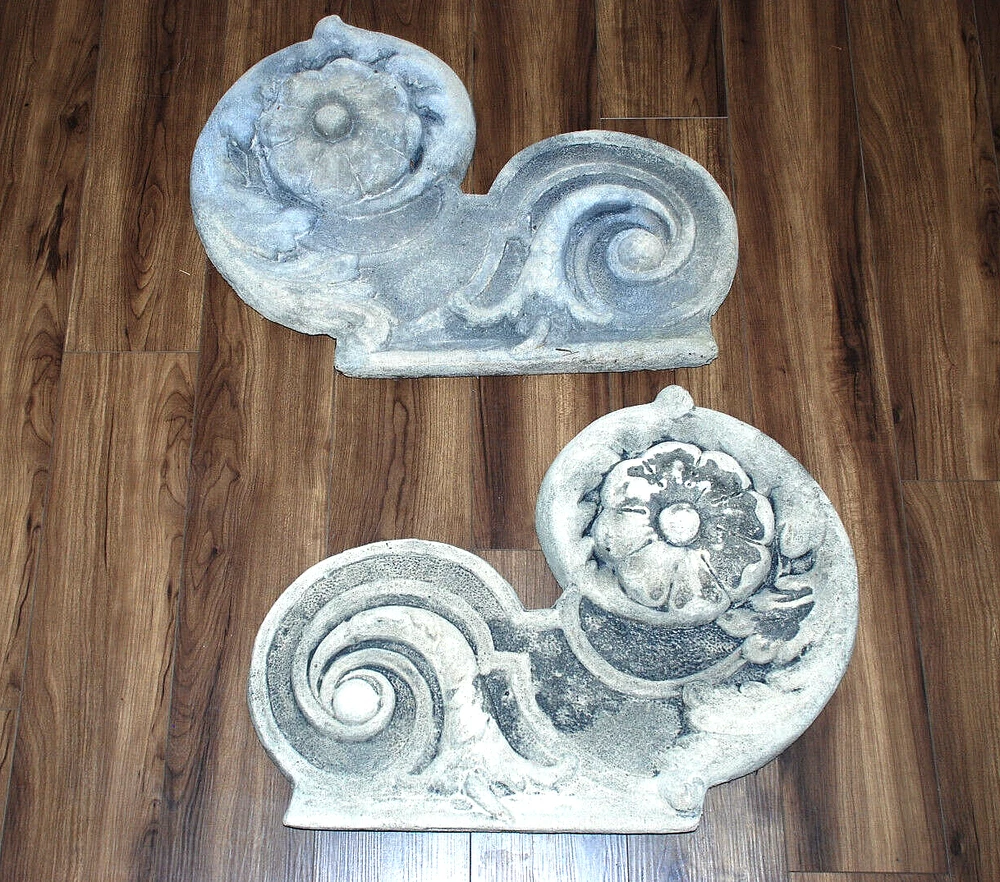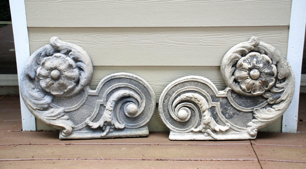 Vintage Concrete Stone Outdoor Garden Lawn Yard Decor Statue Art Scrolls Flower . They each measure 18 1/2" tall by 23 1/3" wide by 1 1/2 to 1 3/4" thick. Add a touch of elegance and durability to your yard, garden or outdoor space with these concrete stone outdoor garden yard decor. Crafted from high-quality, weather-resistant concrete, these decorative pieces are built to withstand the elements while enhancing the aesthetic of your garden, lawn, or yard. Its natural stone appearance blends seamlessly with various landscaping styles, from modern to rustic, offering a timeless charm. Whether used as a focal point or as part of a larger arrangement, these fun durable art decor scrolls will bring lasting beauty to your outdoor environment for years to come. Perfect for gardens, patios, walkways, or as a unique gift for a garden enthusiast. They are in very nice pre owned weathered condition with no cracks. They are very solid and heavy. Local pick-up only.