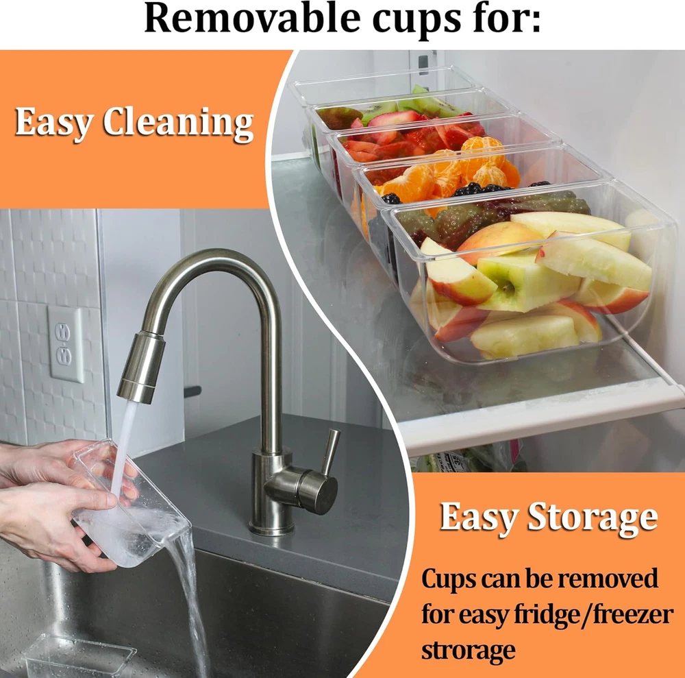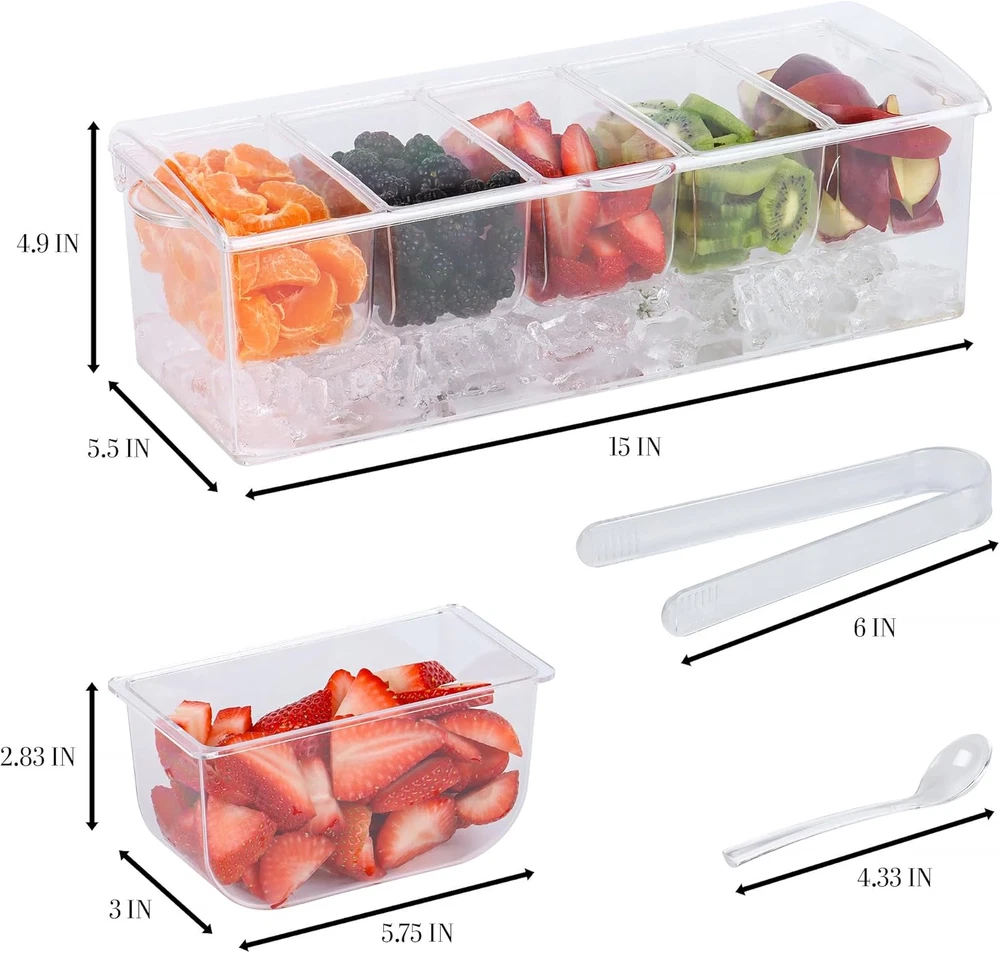 Condiment Caddy with 5 Removable Containers 2.5Cup Tongs/Spoon Set Great Garnish ICE COLD FRESHNESS: Keep your food fresh with the Joey'z condiment organizer! The lower compartment of the condiments organizer holds ice to keep toppings, sauces, dips, vegetables or fruits fresh and succulent for hours. The condiment tray's lid insulates the container, keeping your food cool, covered, protected, and fresh! The serving tray's NON-GLASS SHATERPROOF design makes ideal for pool decks, beach parties, and other barefoot settings. 5 REMOVABLE COMPARTMENTS: Our condiment container has 5 removable 2.5 cup containers allowing you to serve a full array of toppings, vegetables, dips, candy, and more! Individual compartments can be removed for quick refilling, easy cleaning, and easy fridge storage. MULTIPURPOSE: This versatile condiment dispenser is perfect for family gatherings, picnics, tailgates, BBQs, and indoor/outdoor/birthday party food display. It serves as a convenient hot dog or pizza toppings station, a stylish bar garnish caddy, a vegetable and fruit tray, and a taco bar serving set. Its clear, sleek design compliments any pool bar, buffet, mimosa bar or prep deck. MADE TO SERVE: Crafted from durable BPA FREE, PHTHALATE FREE food safe and freezer safe PS plastic, our bar caddy is made to to fulfill your serving needs. It also INCLUDES three (3) serving spoons, and three (3) serving tongs , providing everything you need to serve! LARGE CAPACITY: Measuring 15"x5.5"x5", the large capacity of our chilled serving tray allows you to stock it with a full day's worth of condiments. The individual cups measure 5.5"x3"x3" and are large enough to fit sliced vegetables, cut fruit, ACCESSORIES INCLUDED: Includes three (3) serving spoons, and three (3) serving tongs Product Description Ice Chilled Condiment Caddy Introducing our innovative Chilled Condiment Caddy, a great solution for keeping your favorite condiments fresh and ready to serve at any gathering or event. Crafted with convenience and versatility in mind, this caddy features a clever design that ensures your condiments stay chilled for hours. At the base, a spacious ice compartment provides a reliable cooling effect, maintaining optimal temperatures without compromising on flavor. Many Uses Our caddy features 5 cups for condiments like mustard, ketchup, relish, mayo, & sriracha. It's perfect for toppings like onions, jalapeños, pickles, and tomatoes, as well as garnishes such as cilantro, cheese, bacon bits, & croutons. Need snacks? Fill the cups with nuts, olives, pretzels, or candies. Whether it's a barbecue, picnic, or party, our caddy ensures everyone can customize their dishes. Serving Utensils Included! Our Chilled Condiment Caddy comes with three serving spoons and three tongs, offering added convenience for serving toppings and garnishes alongside your condiments. With these included utensils, hosting a barbecue, picnic, or party becomes even more effortless, allowing your guests to customize their dishes with ease. Includes: Condiment Caddy w/ 5 Removable Cups 3 Serving Spoons 3 Serving Tongs Great For: Serving Chilled Fruits, Vegetables & Crudités Salad Bar Toppings & Condiments Picnic Caddy Condiments BBQ Caddy for Ketchup, Mustard and Hotdog & Hamburger Toppings Dips, Sauces & Dressings Bar Accessories & Snacks Mimosa Bar Supplies Taco Bar Serving Set for a Party Innovative Ice Chamber Having the ability to place the contents of our Chilled Condiment Caddy on ice offers numerous benefits for your gatherings and events. By keeping condiments, toppings, and garnishes cool and fresh, you ensure that they maintain their optimal flavor and texture throughout the duration of your gathering. This not only enhances the overall dining experience for your guests but also reduces the risk of spoilage, ensuring food safety. Additionally, the chilled condiment caddy provides a refreshing touch to dishes, particularly on hot days, adding to the enjoyment of outdoor events such as barbecues or picnics. With our chilled condiment caddy, you can host with confidence, knowing that your condiments and accompaniments are always at their best. Non-glass Shatterproof Design Great for the Pool Side Our Chilled Condiment Caddy offers distinct advantages by being crafted from PS acrylic rather than glass, particularly for use around pool areas. The lightweight and durable nature of PS acrylic ensures easy handling and transport, reducing the risk of breakage and potential accidents, making it ideal for outdoor settings. Unlike glass, PS acrylic is shatter-resistant, providing peace of mind when used around poolside environments where safety is paramount. Additionally, PS acrylic maintains excellent clarity and transparency, offering an elegant presentation for your condiments and accompaniments while withstanding exposure to outdoor elements. Its resistance to discoloration and UV damage further ensures long-lasting durability, making our caddy a reliable choice for poolside gatherings and outdoor entertaining. Plus, it's BPA and phthalate-free, ensuring your health and safety are prioritized alongside convenience and style. Its Not Just for Condiments With its multifunctional design, our Chilled Condiment Caddy is the ultimate versatile accessory for any gathering. Beyond its primary purpose of serving condiments and toppings, this caddy offers a myriad of practical uses. Remove the cups, and it transforms into a spacious ice , ideal for keeping beverages frosty and refreshing. But its versatility doesn't stop there. You can also utilize it to keep other food items cool during transportation, ensuring they arrive fresh and ready to enjoy at picnics, barbecues, or tailgates. From serving condiments to chilling drinks and transporting snacks, our Chilled Condiment Caddy effortlessly adapts to meet your diverse needs, making it an indispensable addition to any event. Dimensions Serving Spoons and Tongs Included! Serving spoons and tongs included—ready 