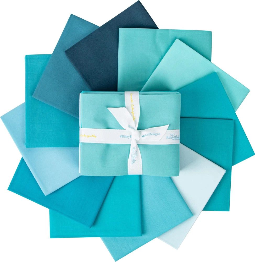 Fabric bundle of 12 18-inch by 22-inch fat quarters from the Confetti Cottons Aqua collection by . This Fat Quarter precut bundle includes 12 pieces from the Confetti Cottons collection. Colors included are Cottage, Scuba, Poolside, Mermaid's Tail, Bleached Denim, Riley Aqua, Peacock, Azure, Sky, Bear Lake, Capri, and Colonial Blue. Confetti Cottons Aqua collection from Designed by Fat Quarter Bundle includes 12 18-inch by 22-inch fat quarters 100% Cotton; premium quilt shop quality fabric