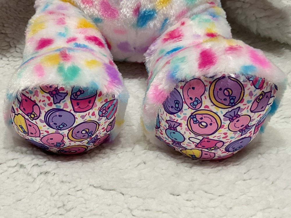 Embrace the joy and charm of this Build-A-Bear Workshop plush bear, a delightful 16-inch companion that captures the essence of a birthday bear adorned with tie-dye patterns. Crafted with a soft, plush material and featuring black eyes that add a touch of soulfulness, this multicolored bear is a testament to the whimsy and happiness that Build-A-Bear is known for. Included with the bear is a colorful t-shirt, perfect for showcasing your love for this furry friend. This adorable puppy dog, hailing from the Rainbow collection and manufactured in 2018, makes a wonderful addition to any collection or a heartwarming gift for someone special.