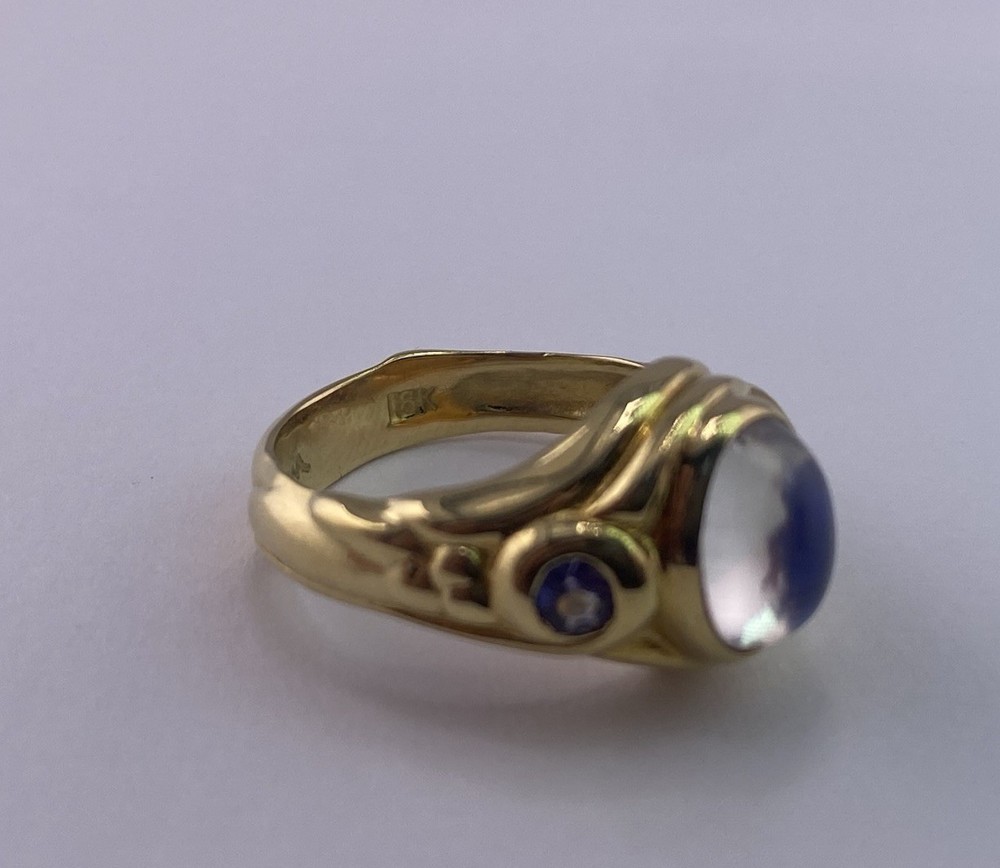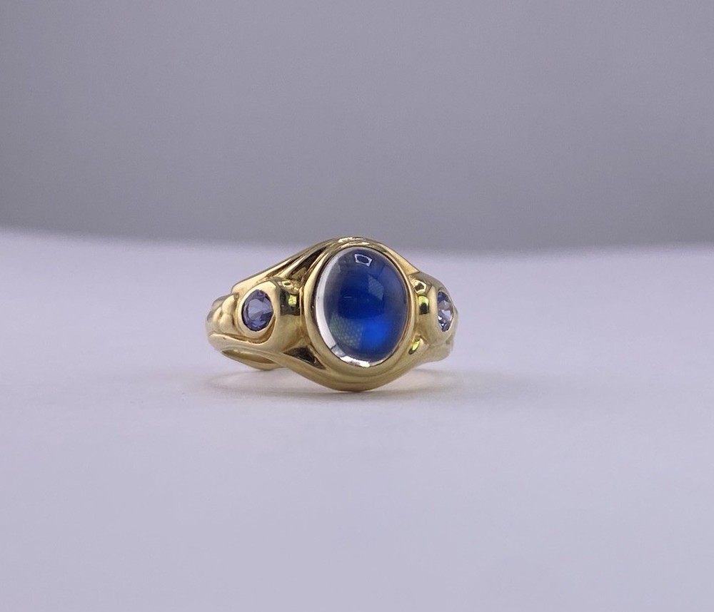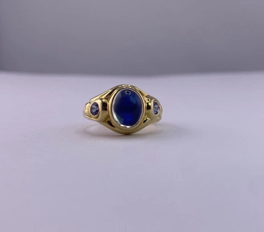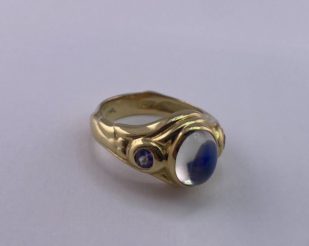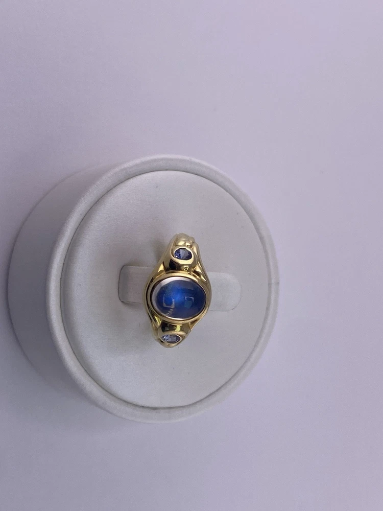 Conni Mainne 18K Gold Moonstone & Tanzanite Ring – Size 5, 7g – New Description: Elegant and timeless, this authentic Conni Mainne ring features a luminous moonstone cabochon at the center, accented by two vivid tanzanite gemstones on each side. Handcrafted in rich 18K yellow gold, this piece showcases Conni Mainne’s signature organic design style. • Designer: Conni Mainne • Main Stone: Moonstone (cabochon cut) • Accent Stones: 2 Tanzanites • Metal: 18K Yellow Gold (marked) • Weight: 7 grams • Ring Size: 5 • Condition: New • Style: Statement / Cocktail / Designer Ring A perfect addition for collectors of fine designer jewelry or anyone who loves the mystical glow of moonstone paired with vibrant tanzanite. Shipping: Carefully packaged and shipped with tracking and insurance.