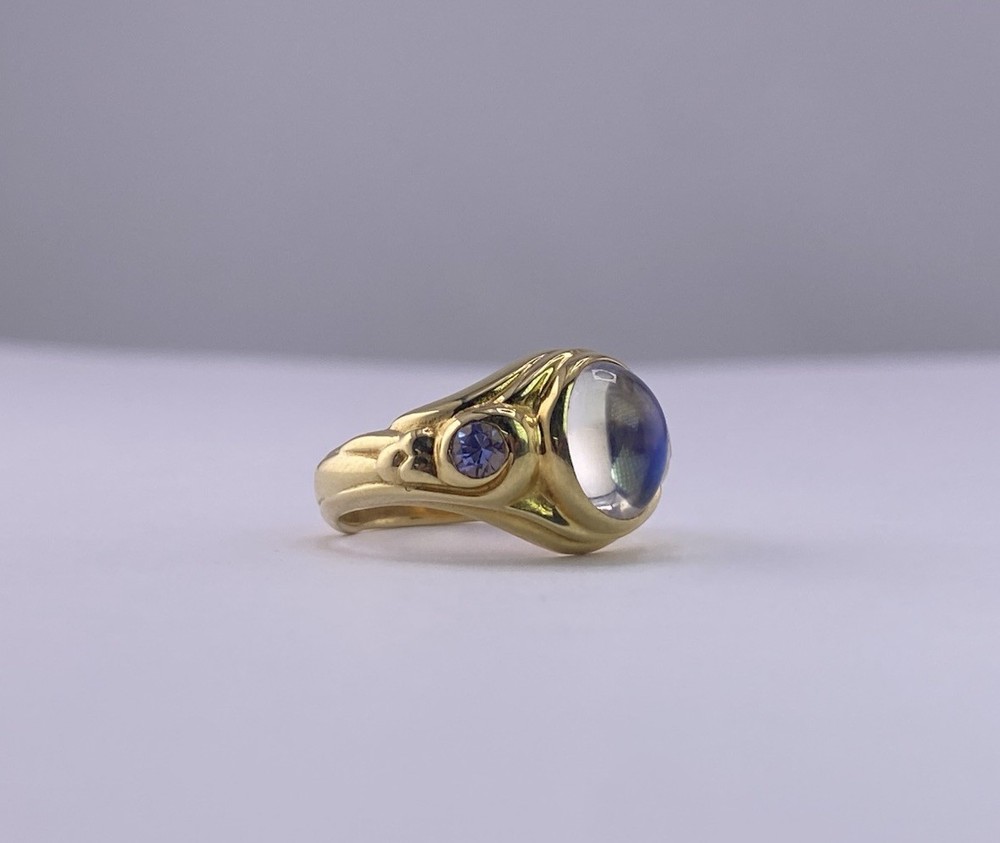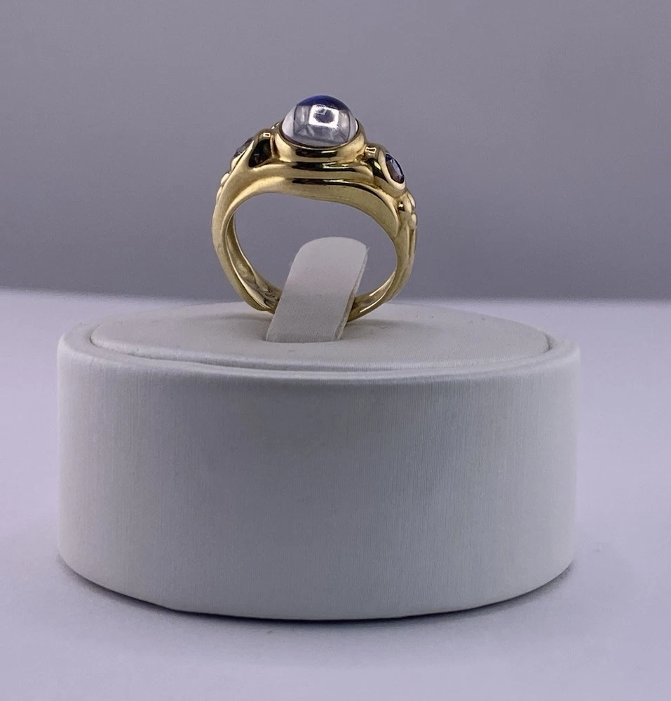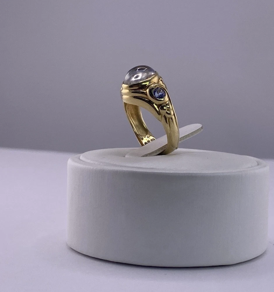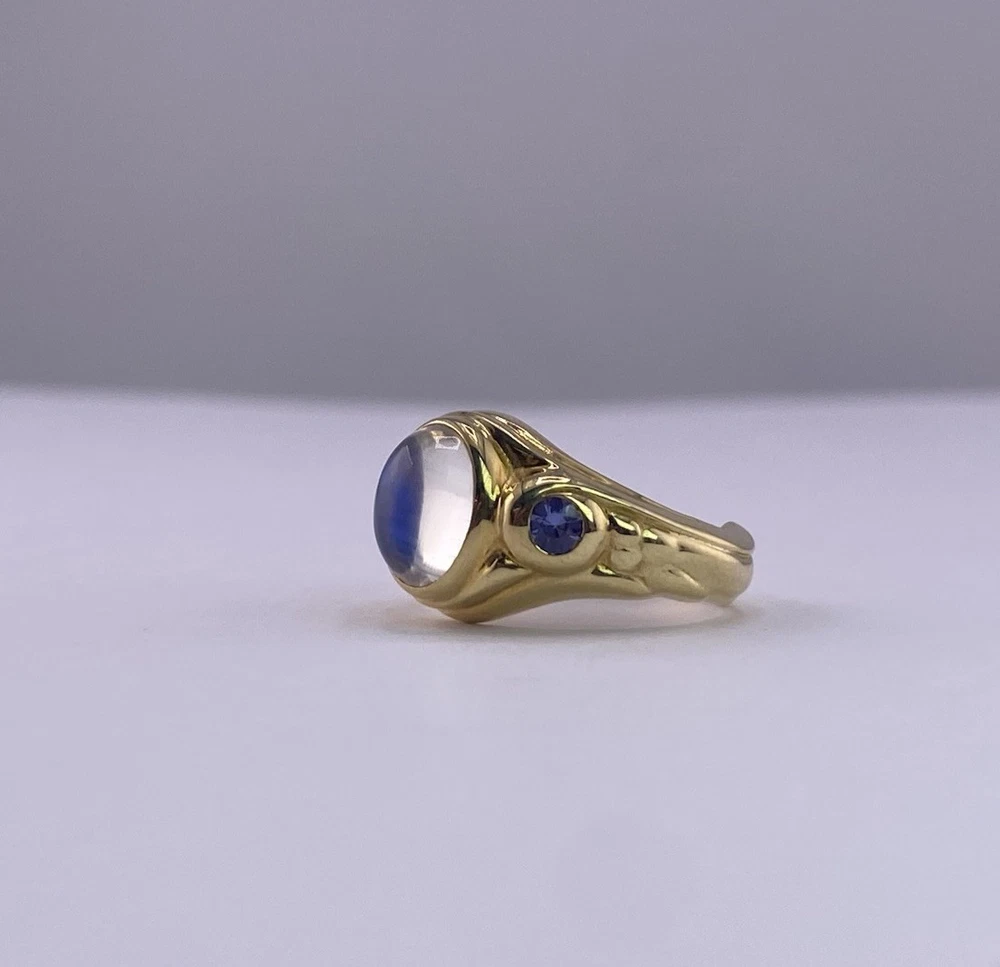 Conni Mainne 18K Gold Moonstone & Tanzanite Ring – Size 5, 7g – New Description: Elegant and timeless, this authentic Conni Mainne ring features a luminous moonstone cabochon at the center, accented by two vivid tanzanite gemstones on each side. Handcrafted in rich 18K yellow gold, this piece showcases Conni Mainne’s signature organic design style. • Designer: Conni Mainne • Main Stone: Moonstone (cabochon cut) • Accent Stones: 2 Tanzanites • Metal: 18K Yellow Gold (marked) • Weight: 7 grams • Ring Size: 5 • Condition: New • Style: Statement / Cocktail / Designer Ring A perfect addition for collectors of fine designer jewelry or anyone who loves the mystical glow of moonstone paired with vibrant tanzanite. Shipping: Carefully packaged and shipped with tracking and insurance.