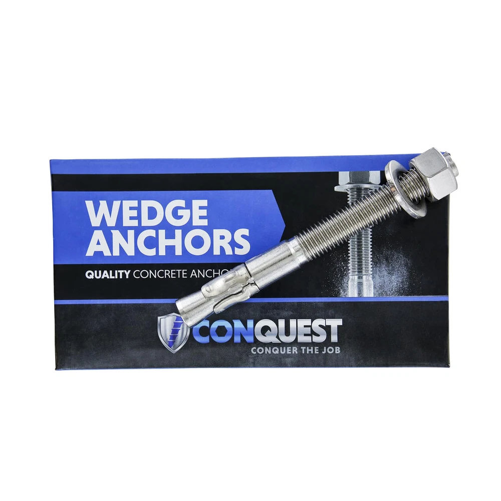 [DIMENSIONS] Diameter: 3/4" | Length: 7" | Thread Type: Coarse (standard) | Thread Length: 4" | Quantity: 10 Pieces | Material: 18-8 (Type 304) Stainless Steel [CORROSION RESISTANT] 100% 18-8 (Type 304) Stainless Steel provides the highest form of corrosion resistance. Ideal for outdoor or non-chloride environments [APPLICATION] Conquest wedge anchors are high quality concrete anchors designed for use in uncracked concrete. These hardened steel anchors are commonly used for installing racking, machinery, car lifts and other fixtures [DESIGN] Chamfered top designed to prevent mushrooming during installation [INSTALLATION] Hole size is nominal diameter of anchor size