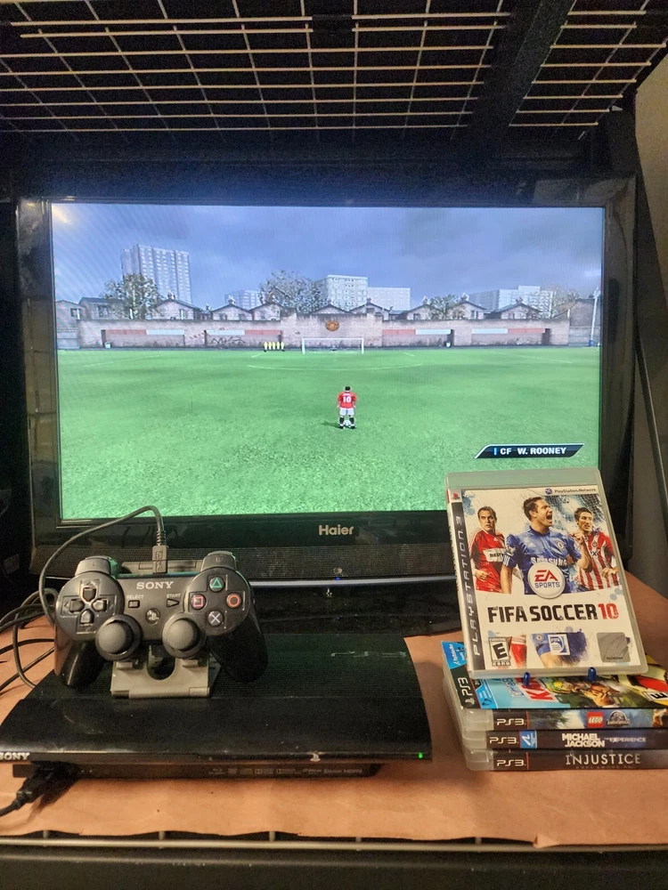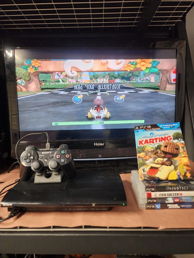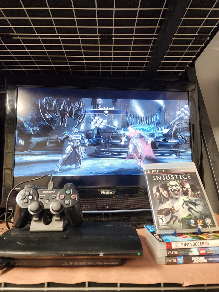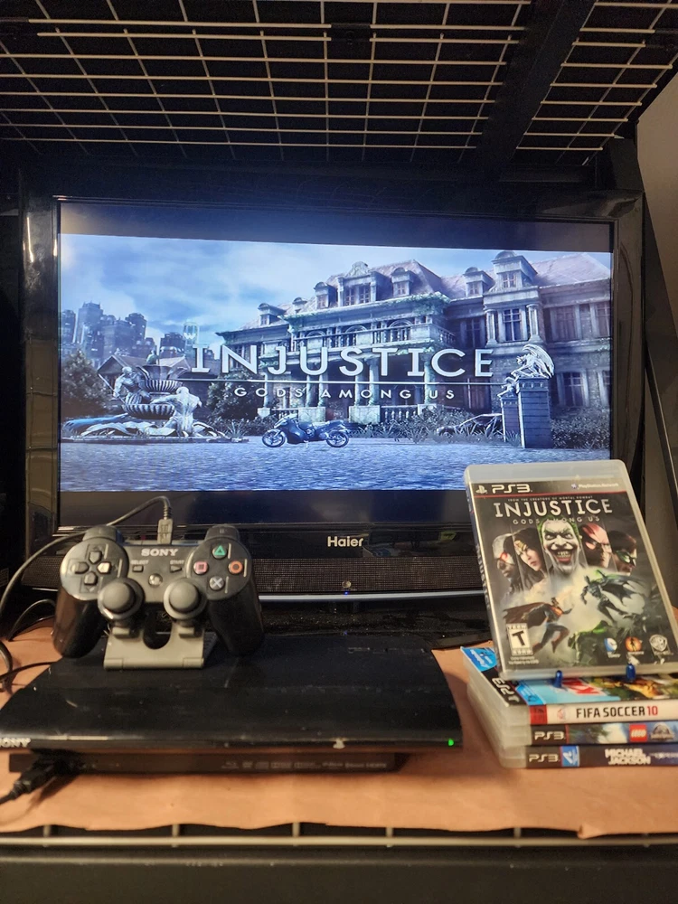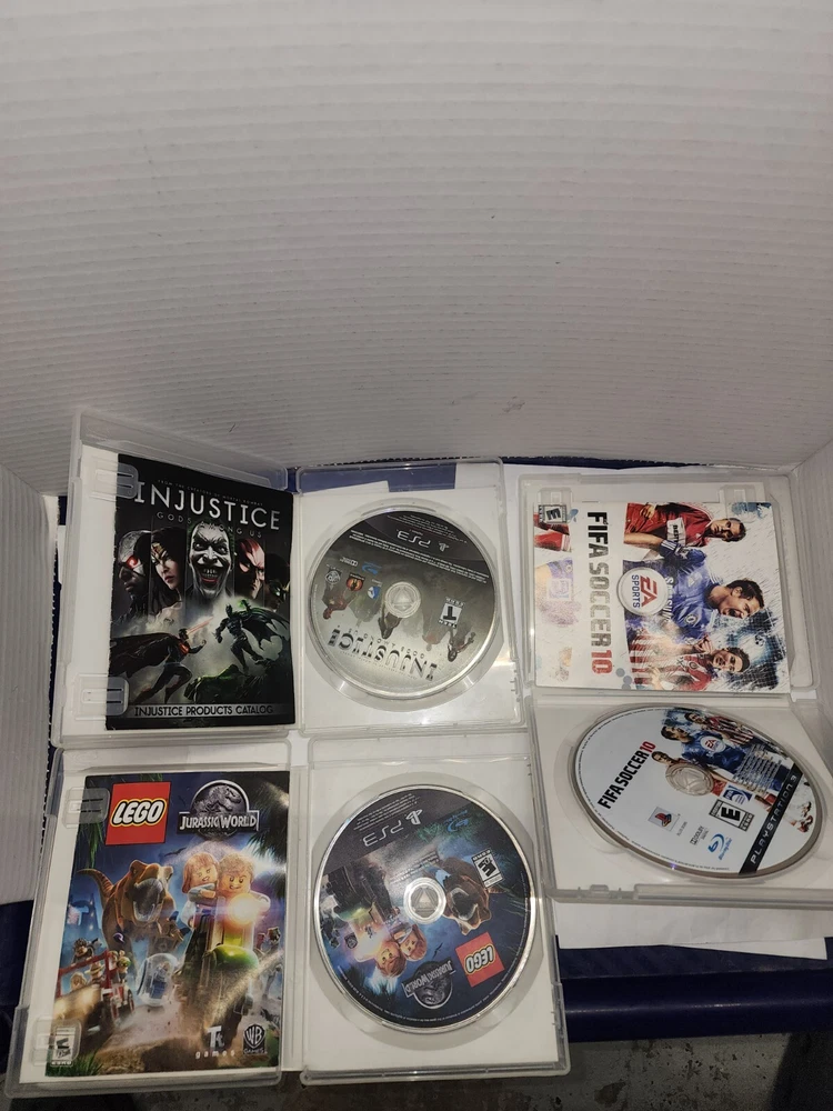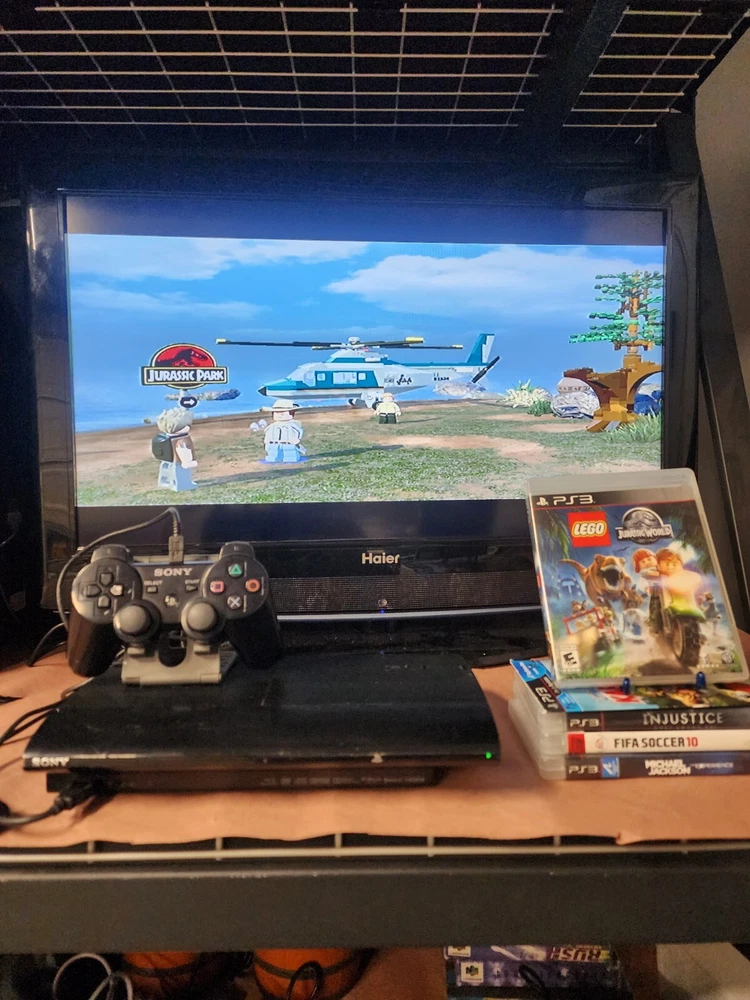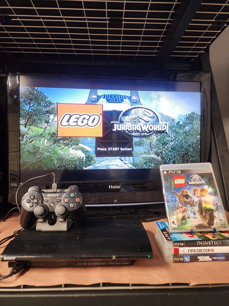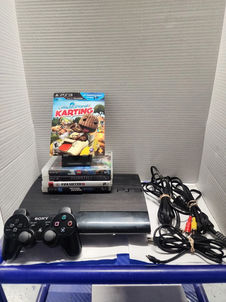 Ps2 super slim console Come with Power supply Av cable Original ps3 Controller Cable to charge ps3 controller Come with 5 games 1 little big planet Karting 2 michael jackson, the experience with manual 3 fifa soccer 2010 with manual 4 injustice gods among us with manual 5 jurassic world lego with manual Everything has been tested Everything works great