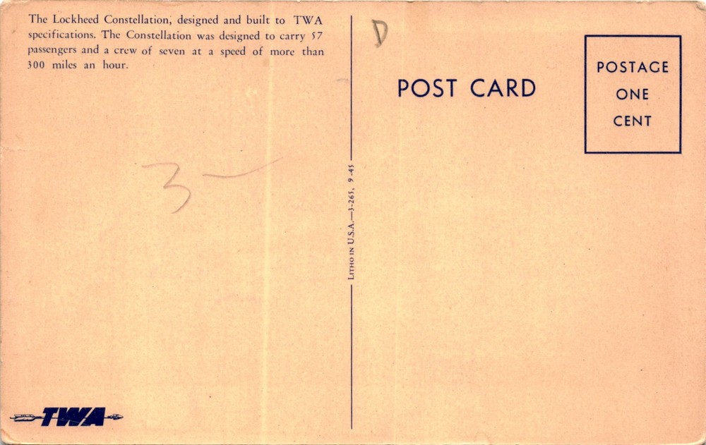 MAKE AN OFFER. THE MORE YOU BUY THE BETTER DEAL I WILL ACCEPT This postcard features a color photo of the Lockheed Constellation, a famous aircraft that was designed and built to Trans World Airlines (TWA) specifications. The Constellation was known for its ability to carry 57 passengers and a crew of seven at a high speed of over 300 miles per hour.
