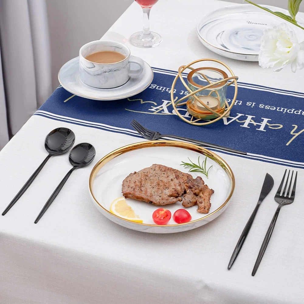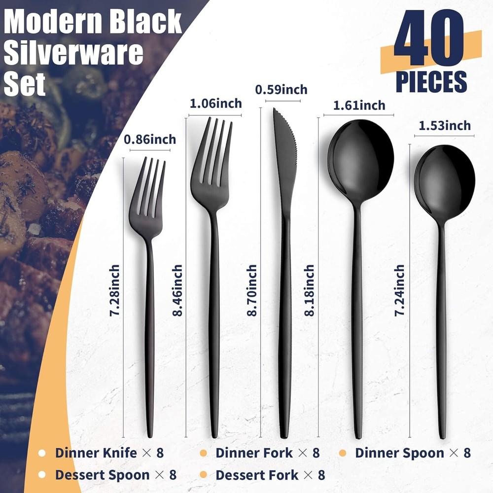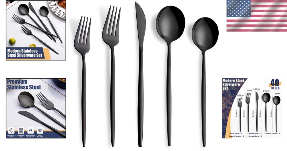 Contemporary 40-Piece Silverware Set for Home and Restaurant - Service for 8 ‹ › ‹ › ‹ › ‹ › ‹ › ‹ › ‹ › ‹ › ‹ › Contemporary 40-Piece Silverware Set Elevate your dining experience with this exquisite silverware set, thoughtfully curated for both home and restaurant use. Service for 8 ensures you are always ready for gatherings, whether intimate or grand. Product Highlights: Complete Set for 8: Includes 8 dinner knives, 8 dinner forks, 8 dinner spoons, 8 dessert forks, and 8 dessert spoons. Versatile Applications: Perfect for any occasion, from formal dinners to casual gatherings. Ideal for homes, restaurants, hotels, weddings, camping, and parties. Durable & Carefree: Dishwasher safe for easy clean-up. Note: Use neutral detergent and avoid strong chemicals to ensure longevity. Thoughtful Design: Each piece is ergonomically designed, considering every detail for optimal function and balance, ensuring a superior dining experience. Exceptional Customer Service: We stand behind our product. If you are not fully satisfied, please reach out for a prompt resolution. Indulge in Elegance: Transform every meal into a celebration with our Contemporary 40-Piece Silverware Set. Crafted to perfection, this set is not just a collection of utensils but a statement of style and sophistication. The modern design complements any table setting, making it suitable for both casual and formal events. Whether you're hosting Thanksgiving dinner, enjoying a summer barbecue, or setting the table for a romantic date night, this silverware set helps you serve with elegance. Make a lasting impression on your guests and create unforgettable memories around the table. Don’t wait to enhance your dining experience. ADD TO CART NOW and revel in the luxury of fine dining daily! Shipping Free & Fast Shipping - We offer free shipping to most of the USA with a normal delivery time of 3-7 days. However, due to the current situation, additional delivery time (up to 3 weeks) may be required for some items. Alternative Carriers - We may use alternative carriers (e.g. USPS, FedEx, UPS, etc.) to ensure your package arrives safely and on time. Due to the use of multiple carriers, we are unable to provide a tracking number automatically. Handling Time - Orders are processed and shipped within 1-2 business days of receiving cleared payment. Shipping Restrictions - Shipping to Alaska, Hawaii, Puerto Rico, Guam, and other US territories may incur shipping charges or delivery restrictions. Please contact us before ordering, or your order can be refunded/cancelled. State Restrictions - There may be restrictions based on your state of purchase. For example, certain items may not be shipped to California due to state regulations. Contact for Tracking Updates - If you require tracking updates or have any concerns about the delivery of your order, please feel free to contact us, and we will be happy to assist you. Return 30-Day Hassle-Free Returns - We want you to be completely satisfied with your purchase. If you are not, you can return the item within 30 days of receiving it for a full refund or exchange. Easy Return Process - To start a return, simply contact us and we will provide you with a prepaid return shipping label and detailed instructions. Restocking Fee - There are no restocking fees for returns. However, the buyer is responsible for return shipping costs if the return is not due to a seller's error. Refund Processing Time - Refunds will be processed within 5 business days of receiving the returned item in its original condition. Payment We accept all major credit cards, PayPal, and Apple Pay for your convenience. Your payment information is secure and encrypted to ensure a safe and seamless transaction. Please complete your payment within 3 days of purchase to avoid any delays in shipping. Feedback Your feedback is extremely important to us. We strive to provide the best products and customer service possible. If you are satisfied with your purchase, please take a moment to leave us a positive review. If you have any concerns or issues with your order, please contact us before leaving negative feedback. We are committed to resolving any problems and ensuring your satisfaction. Contact Us If you have any questions or concerns, please feel free to reach out to our customer support team. You can contact us through the eBay messaging system. We are available Monday to Friday, 9:00 am to 5:00 pm EST, and we will do our best to respond to your inquiry within 24 hours. Buy it now and enjoy a pleasant shopping experience! UPC: Not Set Unit Quantity: 40 Material: Stainless Steel Department: Adults Set Includes: Fork,Dinner Knife,Dinner Fork,Dinner Spoon,Dessert Fork,Dessert Spoon Character: Not Set Features: Dishwasher Safe,Rust Resistant Type: Set Brand: Unbranded Number of Items in Set: 40 Service For: 8 Color: Black Handle Material: Stainless Steel Country/Region of Manufacture: Not Set MPN: Not Set Finish: Mirror Satin Style: Modern Handle Pattern: Not Set Occasion: Wedding Character Family: Not Set Wood Tone: Not Set Item Weight: 3.2 ounces Manufacturer Warranty: Not Set Model: Not Set Unit Type: oz Care Instructions: Dishwasher Safe Personalize: Not Set