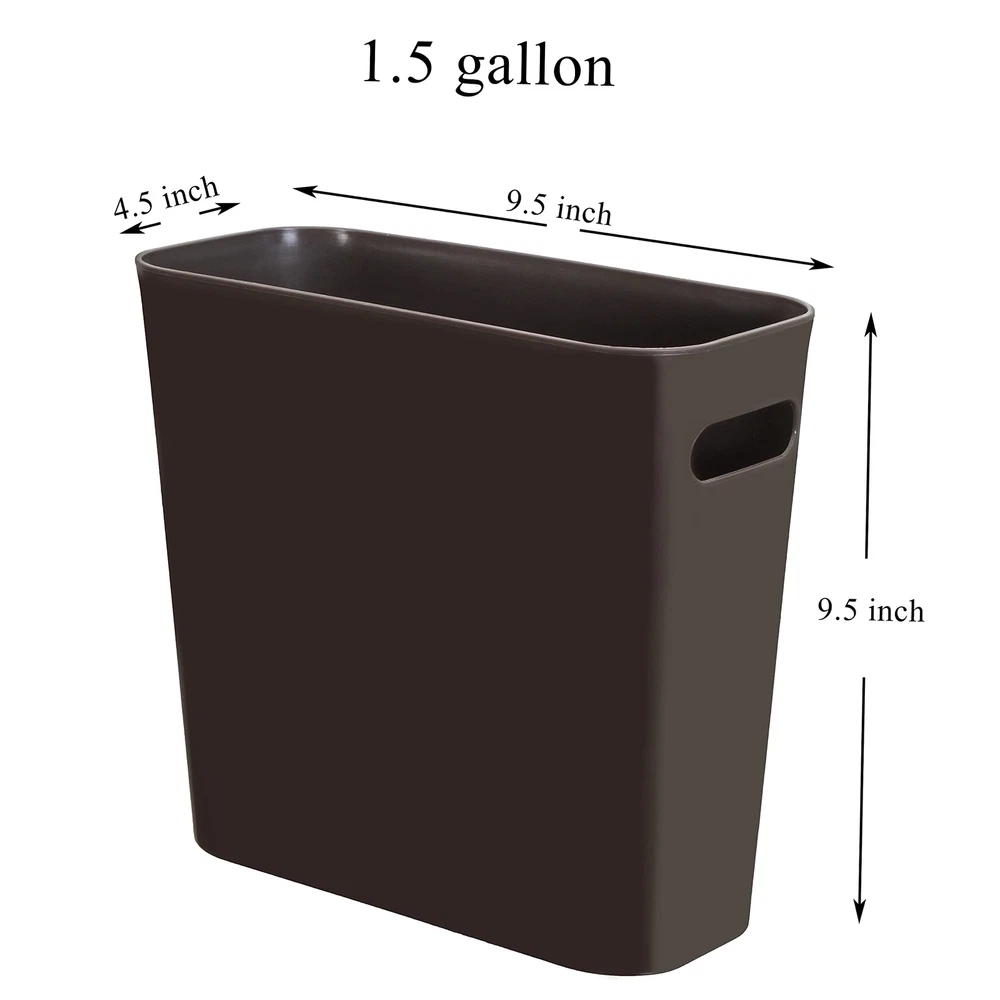1.5 Gallon Plastic Slim Trash Can Garbage Container Bin with Handles for Office Features: Trash Bin Best Value –The rectangular can is conveniently into a small space or next to the door. The small plastic trash bin can save your space. Dark Brown Color. Functional and Versatile- 9.5 inch in height small plastic trash wastebasket with handles is perfect size in your home office, living room, study room, kitchen, and bathroom. High Quality – Made of durable plastic. NO BPA, NO LEAD. Easy to Clean – easy to wash and clean. Size – 1.5 Gallon. 9.5-inch length, 4.5-inch width, and 9.5-inch height. 🌻 If you need more quantity than shown available - just send me a message and I'll increase the purchased limit for you 🌻 SHIPPING We are always working hard to ensure your package arrives as soon as possible. Please understand that some factors like weather, high postal traffic, and the performance of shipping companies are outside of our control. We offer free shipping to the lower 48 states. We do not accept P.O. Boxes. Please provide a physical address. Thank you 🌻 TRANSLATE with x English Arabic Hebrew Polish Bulgarian Hindi Portuguese Catalan Hmong Daw Romanian Chinese Simplified Hungarian Russian Chinese Traditional Indonesian Slovak Czech Italian Slovenian Danish Japanese Spanish Dutch Klingon Swedish English Korean Thai Estonian Latvian Turkish Finnish Lithuanian Ukrainian French Malay Urdu German Maltese Vietnamese Greek Norwegian Welsh Haitian Creole Persian