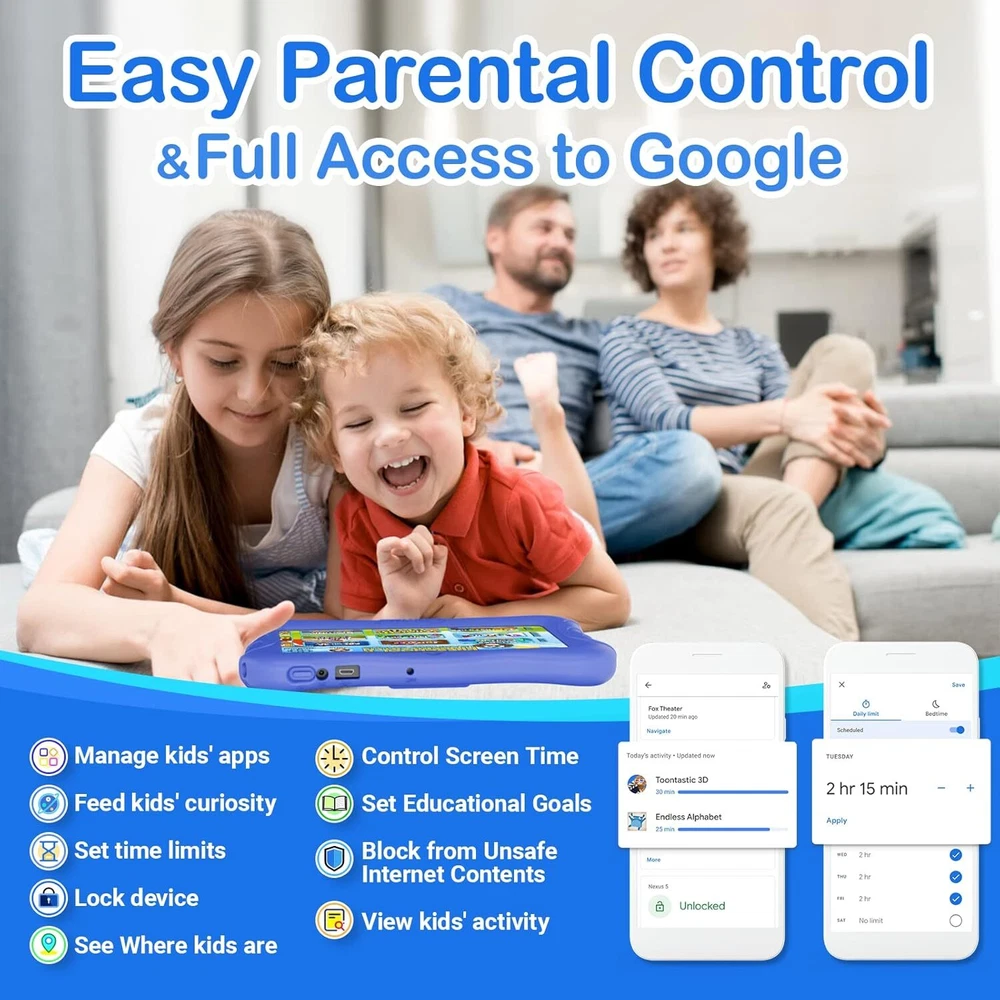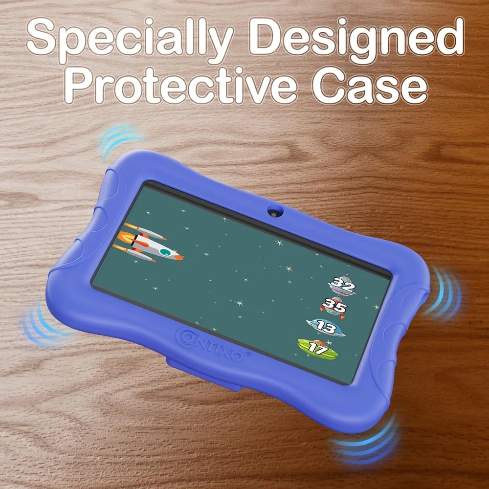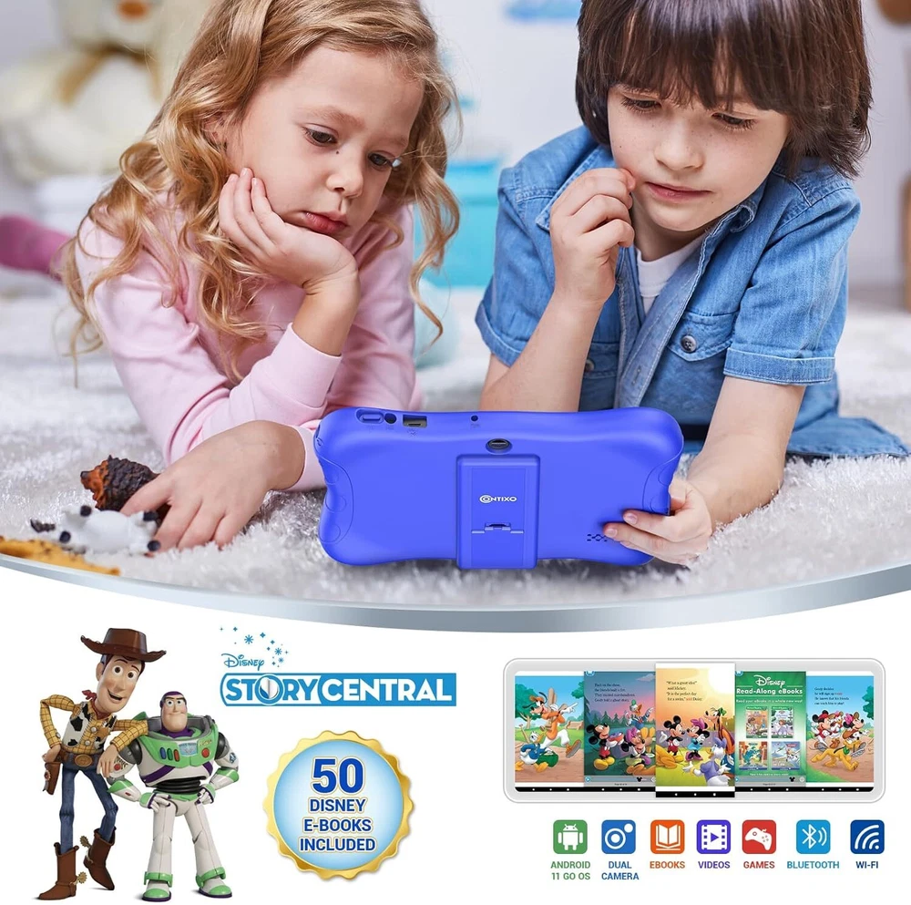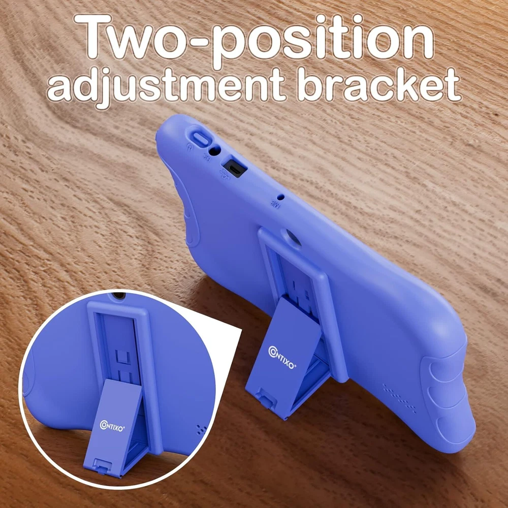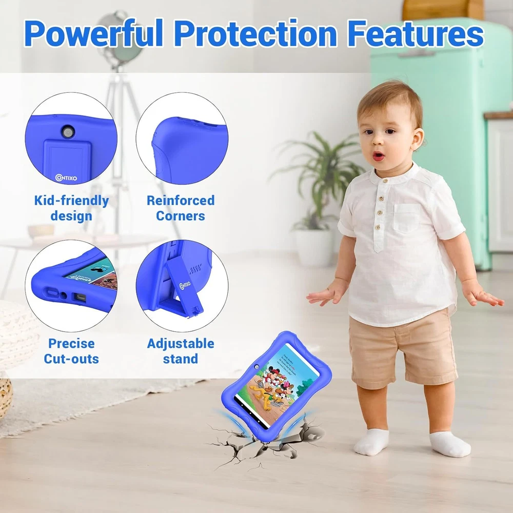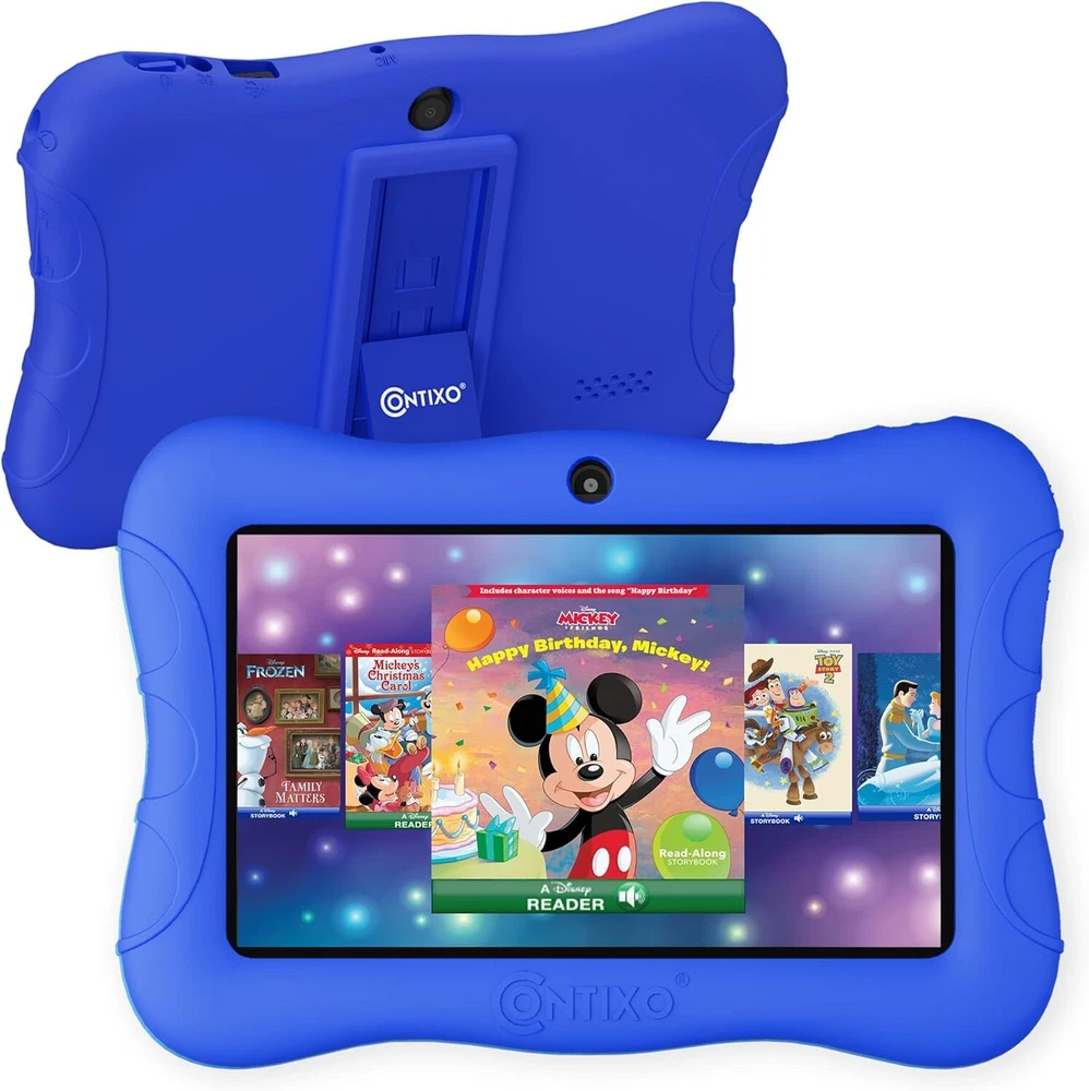 Contixo 7" Kids Tablet - 32GB Android Learning 2GB+32GB, Dark Blue Product Details Brand: Contixo Model Name: V9-3-32 Memory Storage Capacity: 32 GB Screen Size: 7 Inches Display Resolution Maximum: 1024 x 600 Pixels KID-FRIENDLY 7-INCH DISPLAY - High-definition 7” IPS screen with vibrant colors, designed for ages 3-10. Built to spark creativity and enhance learning while ensuring durability with a kid-proof case. PRE-INSTALLED DISNEY E-BOOKS - Features 50+ Disney digital audio eBooks, including beloved classics like "Frozen" and "Toy Story," for engaging storytelling and fun learning. POWERFUL AND DURABLE - Powered by a Quad-Core 1.6GHz processor and Android 11 OS with 32GB storage, expandable to 128GB. Includes a rugged protective case with a kickstand and pre-applied screen protectors PARENTAL CONTROLS - Easily manage apps, screen time, and browsing with Google Family Link. Create a safe, age-appropriate environment for your child’s digital activities. LONG BATTERY LIFE & PORTABILITY - Equipped with a 3100mAh rechargeable battery, offering up to 4.5 hours of uninterrupted learning and entertainment. Perfect for travel, school, or play at home.