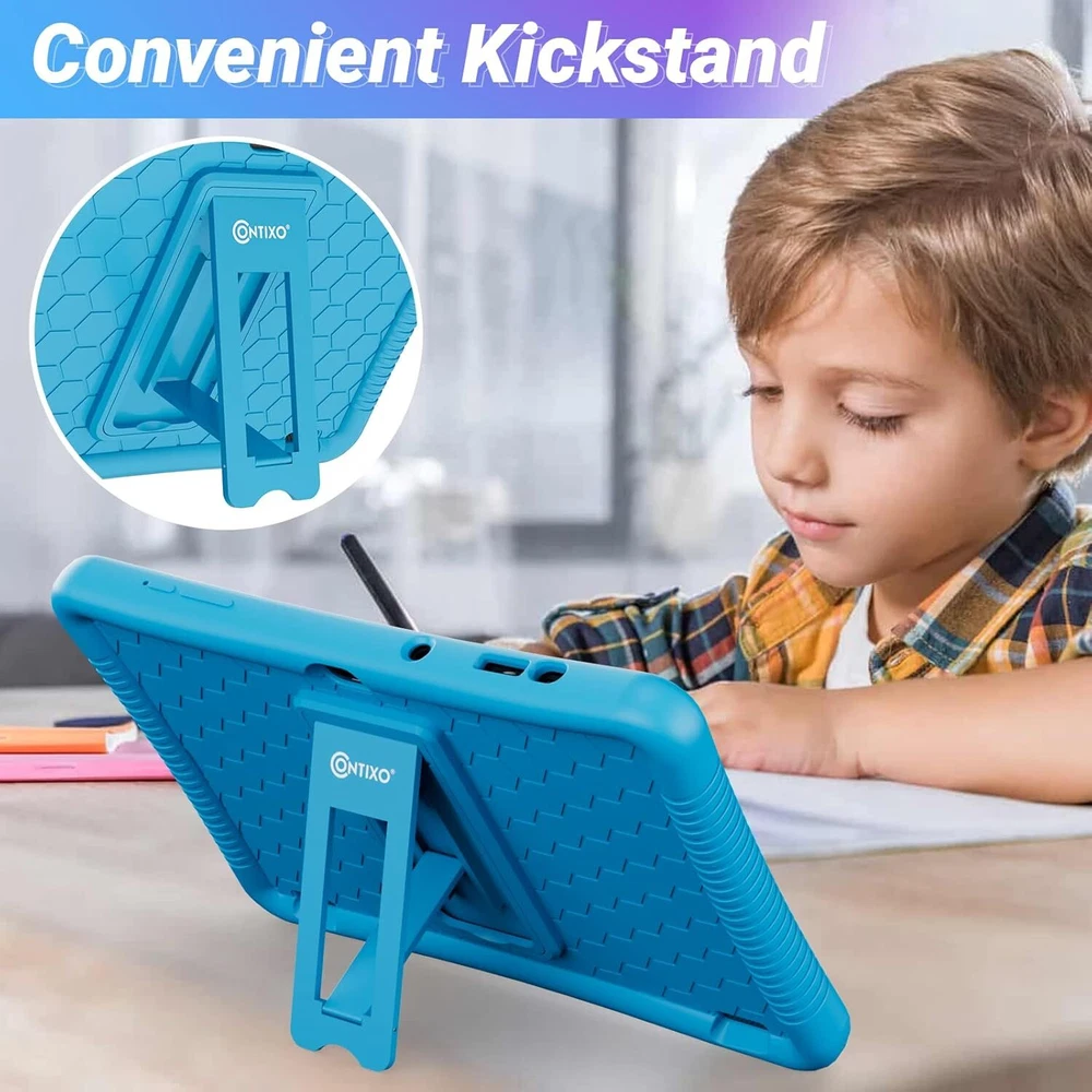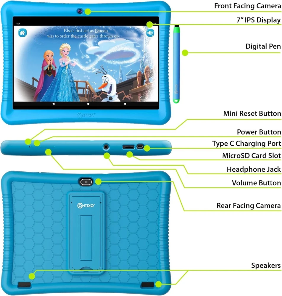 Contixo Kids Tablet K102, 10-inch HD, Toddler with Camera, Blue Product Details Standing screen display size: 10 Inches Screen Resolution: 1280 x 800 pixels Max Screen Resolution: 1280 x 800 Pixels Processor: 1.6 GHz RAM: 2 GB Hard Drive: 32 GB Chipset Brand: Allwinner Wireless Type: 802.11a Average Battery Life (in hours): 10 Hours Brand: Contixo Model Name: Touch Memory Storage Capacity: 64 GB Screen Size: 10 Inches Display Resolution Maximum: 1280 x 800 Pixels 80+ Disney eBooks and Videos ($350 Value): Includes 80 exciting eBooks featuring beloved Disney characters, promoting fun and engaging reading for kids.Pay a single Kids Tablet and Parents can download popular android apps or choose 1000 + games, apps, videos, and music from Google Play Stores. Easy Parental Control & Full Access to Google: Kids Place allows you to control screen time and kid friendly contents. Filter feature can ensure your kids see filtered websites, apps, video channels etc. This app has no ads and no in-app purchases without your permission. Contixo K102 is also a fully functional Android Tablet. With GMS Certified, you have full access to the latest Google Service such as Gmail, YouTube, Disney + and many more apps and contents. Easier for Kids Hands & Tough: Contixo K102 Kids Tablet with kid-proof case is easy for young children from aged 3+ to hold. Each side and edges are specifically designed to stay slightly above from the screen to protect the Contixo K102 Kids Tablet from the occasional “oops” moments. The Built in kick-stand enables hands free video watching. The Stylus is designed for Kids aged 3+. Little hands will have an easy time using and controlling this tablet. A perfect WiFi Android Tablet for Online Learning: Contixo K102 Plus kids tablet features WiFi connectivity and full range of Google Services. You can download massive educational Apps from the Google Play Store such as Khan Academy for Kids, Duolingo, ABC Mouse, etc. The Contixo Academy will provide the endless age-appropriate contents, ensure safe engagement when you are busy working. An ultimate Learning Academy Partner for every Home. Faster CPU, More Storage and Longer Lasting Battery: This perfect Wi-Fi Android tablet equipped with a 1.5 GHz Quad Core Processor and 2 GB RAM enables quick app launches, smooth videos, and 10 hours mix use tablet time. 32GB on-board storage can be expanded up to 128GB via microSD card slot.
