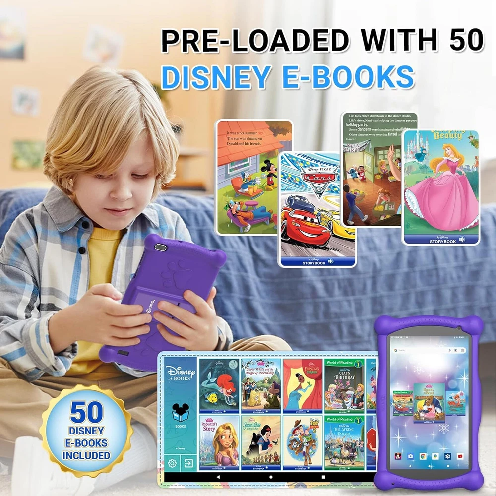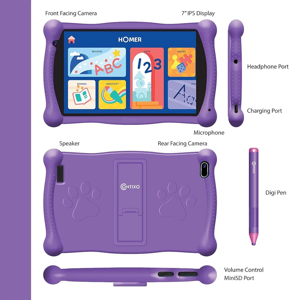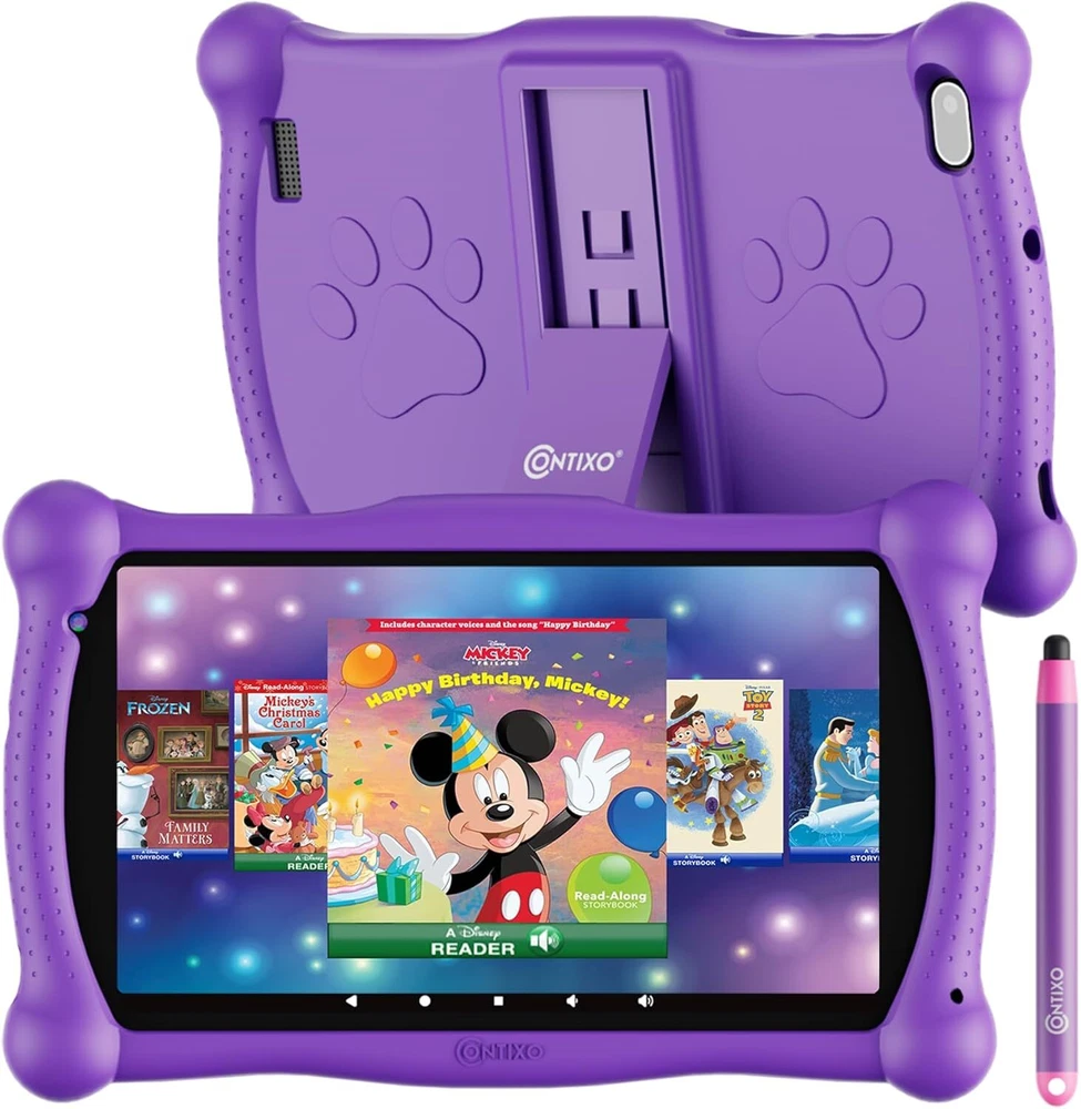 Contixo Kids Tablet V10, 7-inch HD, Ages 3-7, Toddler with Purple Product Details Standing screen display size: 7 Inches Screen Resolution: 1024x600 Max Screen Resolution: 1024x600 Pixels Processor: 1.5 GHz RAM: 2 GB Hard Drive: 32 GB Chipset Brand: Allwinner Wireless Type: 802.11a Average Battery Life (in hours): 10 Hours Brand: Contixo Model Name: V10 Memory Storage Capacity: 32 GB Screen Size: 7 Inches Display Resolution Maximum: 1024x600 Pixels 【Disney Storybooks Pre-loaded】Save up to $200.00: With 50+ Disney Storybooks apps pre-installed, No wifi needed, your loved ones and you can enjoy a kid-friendly and Android based tablet. Pay a single Kids Tablet and Parents can download popular android apps or choose 1000 + games, apps, videos, and music from Google Play Stores. 【Easy Parental Control & Full Access to Google】 Kids Place allows you to control screen time and kid friendly contents. Filter feature can ensure your kids see filtered websites, apps, video channels etc. This app has no ads and no in-app purchases without your permission. Contixo V10 is also a fully functional Android Tablet. With GMS Certified, you have full access to the latest Google Service such as Gmail, YouTube, Disney + and many more apps and contents. 【Easier for Kids Hands & Tough】 Contixo V10 Kids Tablet with kid-proof case is easy for young children from aged 3+ to hold. Each side and edges are specifically designed to stay slightly above from the screen to protect the Contixo V10 Kids Tablet from the occasional “oops” moments. The Built in kick-stand enables hands free video watching. The Stylus is designed for Kids aged 3+. Little hands will have an easy time using and controlling this tablet. 【A perfect WiFi Android Tablet for Online Learning】 Contixo V10 kids tablet features WiFi connectivity and full range of Google Services. You can download massive educational Apps from the Google Play Store such as Khan Academy for Kids, Duolingo, ABC Mouse, etc. The Contixo Disney Storybooks will provide the endless age-appropriate contents, ensure safe engagement when you are busy working. An ultimate Learning Academy Partner for every Home. 【Faster CPU, More Storage and Longer Lasting Battery】 This perfect Wi-Fi Android tablet equipped with a 1.6 GHz Quad Core Processor and 2 GB RAM enables quick app launches, smooth videos, and 10 hours mix use tablet time. 32GB on-board storage can be expanded up to 128GB via microSD card slot.