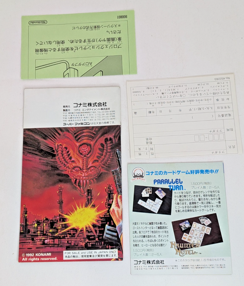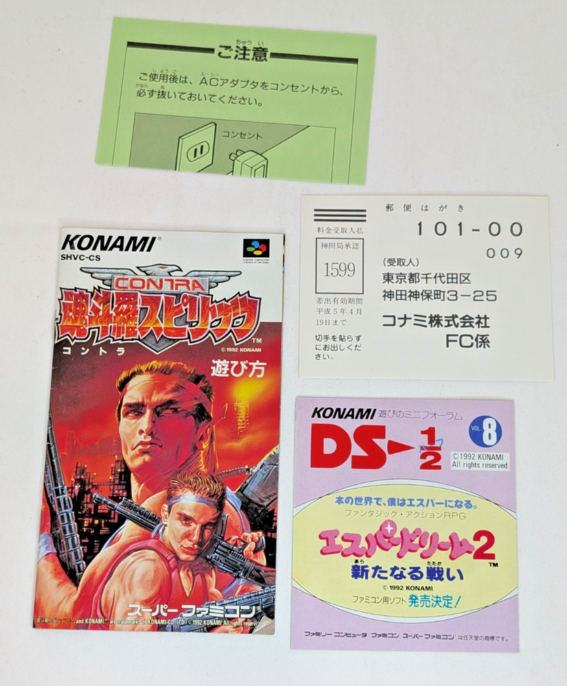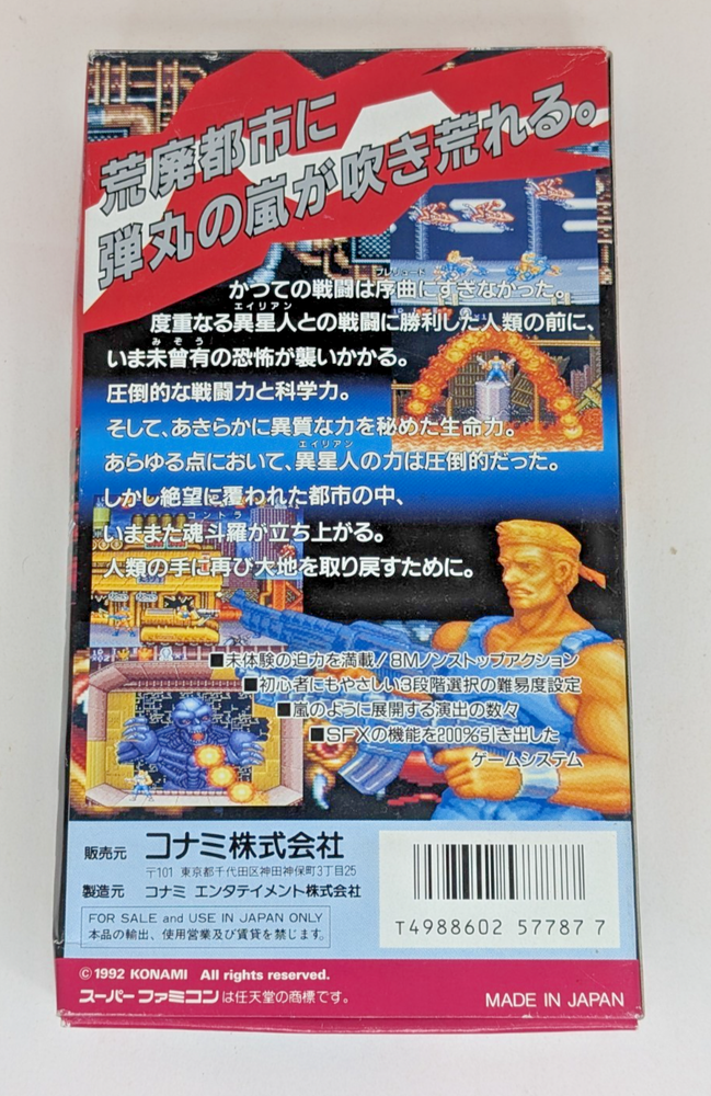 eBay Template Contra Spirits Nintendo Super Famicom SFC CIB *US Seller* HE Price: $ 95.00 Please READ before your purchase. . Title: Contra Spirits Game Console: Super Famicom Compatibility: * This is the Japanese NTSC-J game. You will only be able to play this game on a Super Famicom or a region-free system. Please check the compatibility before buying. Thank You. Condition: Good * The game that is shown in the pictures is the game you will get. * We test and clean every single game to make sure it is in working condition. * There is some wear and a possibility of de-yellowing on the cartridges, which is normal for Super Famicom cartridges Shipping: *We are a US-based seller. We package and handle with care. If you have any questions, feel free to ask Additional Notes: * This game will be in Japanese(Some games have English text in them, but most games do not). Menus and text dialogues can be translated by using Google Translate or another translation tool. You may also like: Battle Pinball Japanese 3DO CIB *US Seller* HE UFO A Day In The Life Japanese PlayStation PS1 CIB With Obi *US Seller* HE Zero Tsukihami No Kamen Nintendo JP Wii CIB *US Seller* HE Hellfire Pc Engine PCE CIB *US Seller* HE