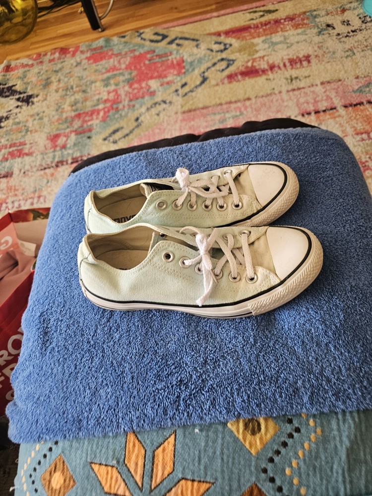 The product is a pair of Converse All Star sneakers for women in a size 7, featuring a blue color with a star theme. These sneakers are a classic choice for casual and athletic wear, known for their comfortable and stylish design.