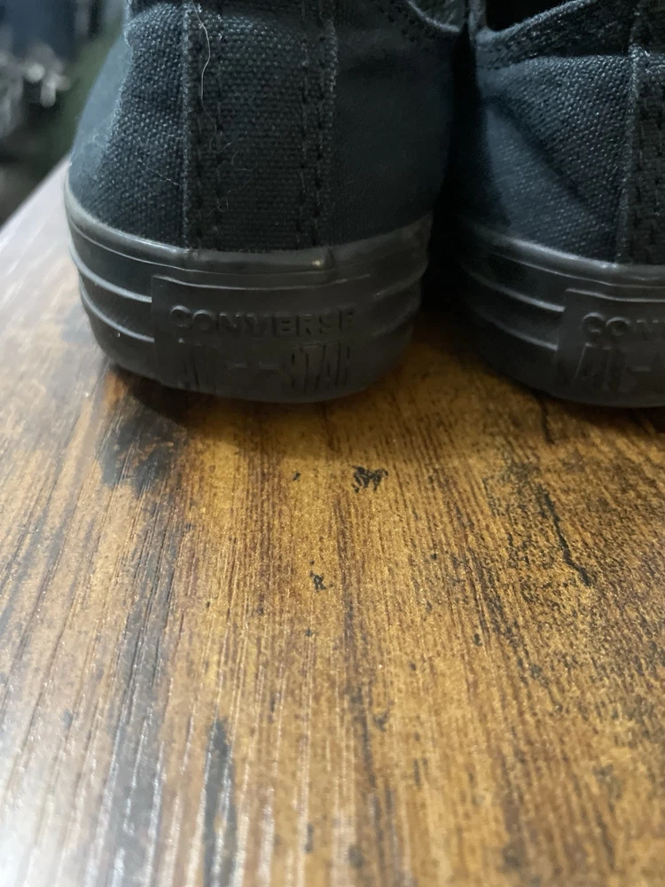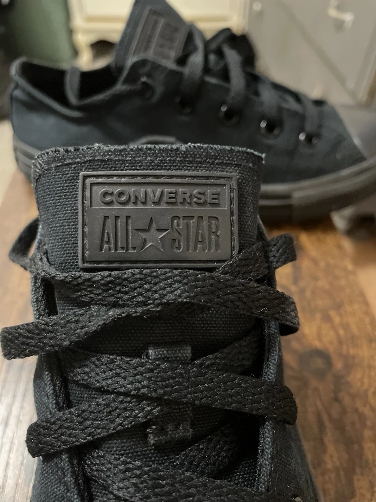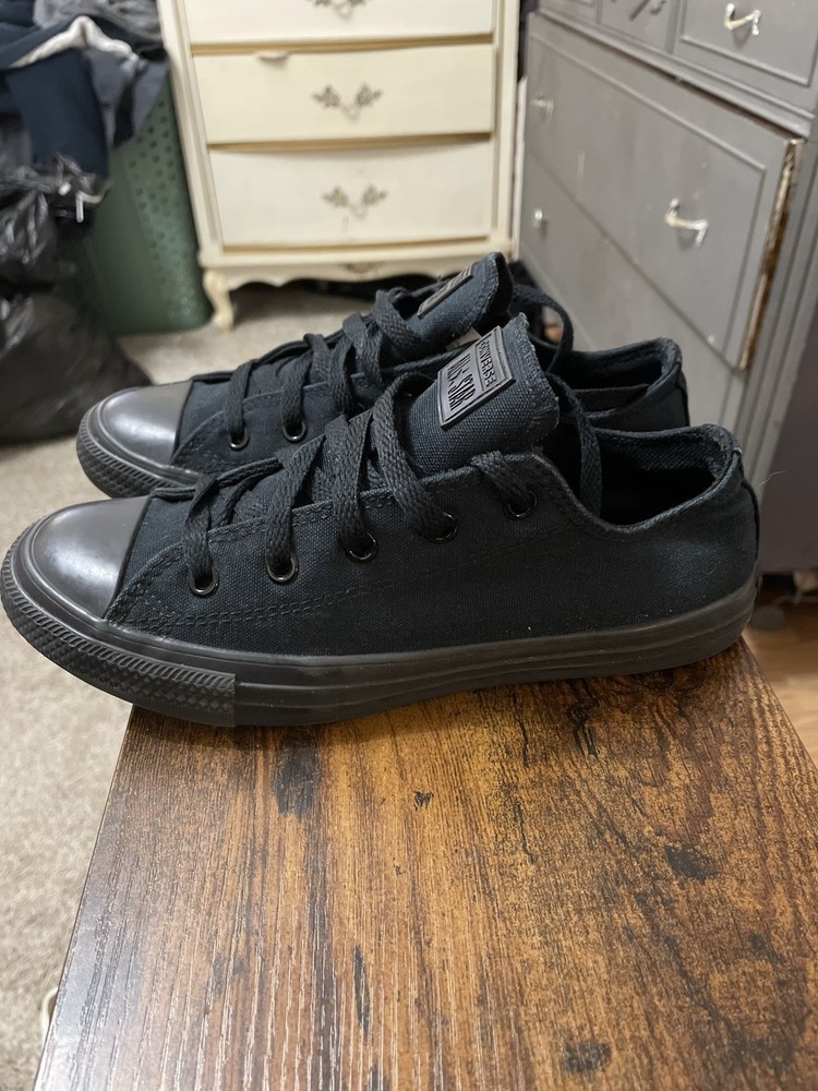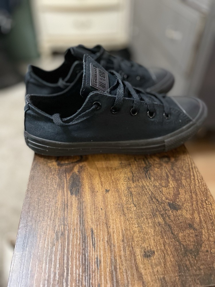 The product is a pair of Converse All Stars All Black Youth Size 3 Low Top Sneakers. These lace-up sneakers feature a round toe shape, flat heel, and rubber outsole for comfort and durability. The canvas fabric upper is accented with the iconic Converse logo, making them a stylish choice for casual occasions during the summer, fall, and spring seasons. This unisex kids sneaker is part of the Converse All Star product line and showcases a solid black color with a star theme, making it a versatile and classic addition to any wardrobe.