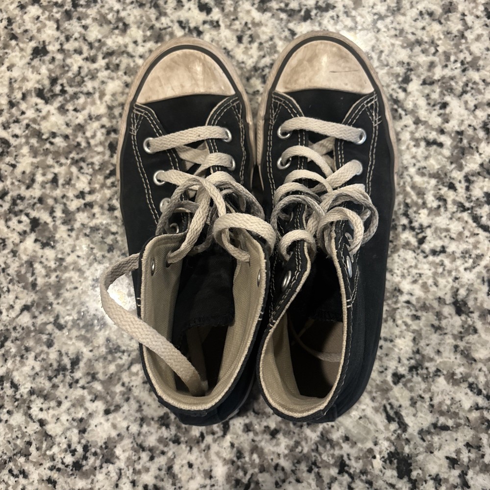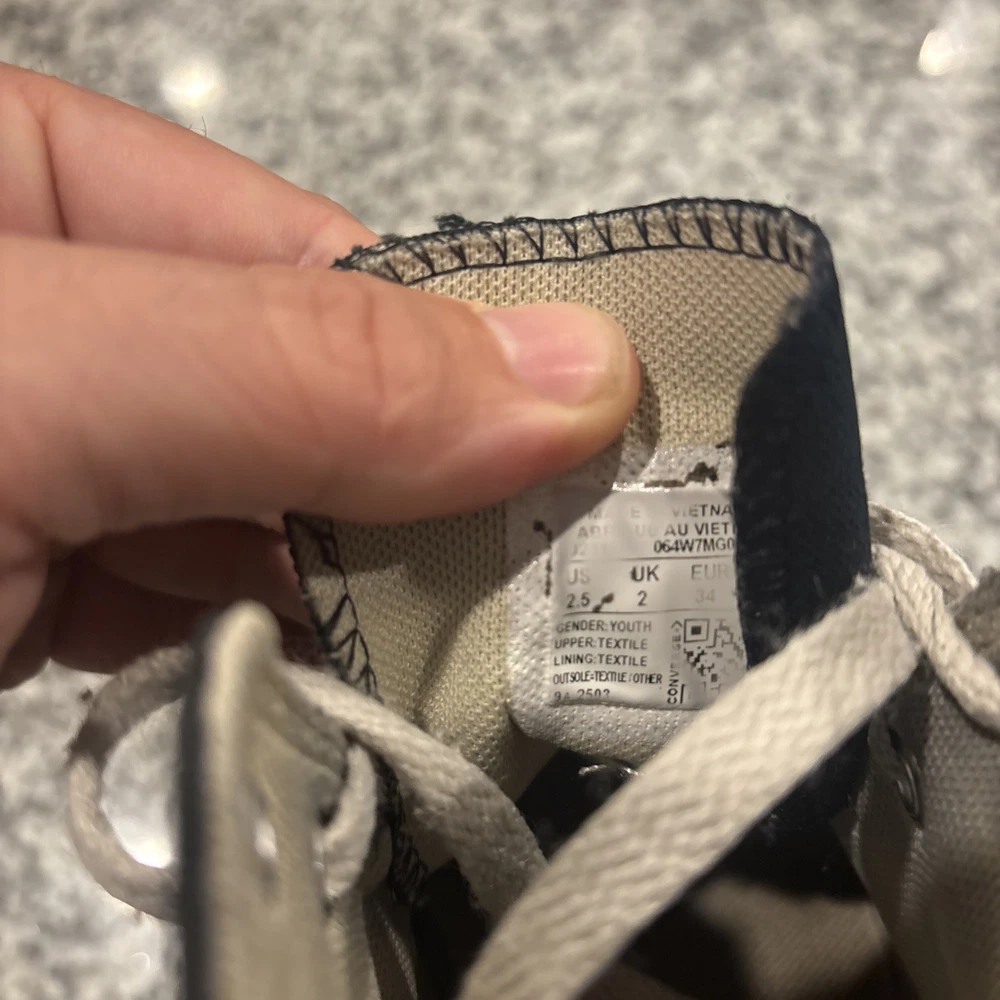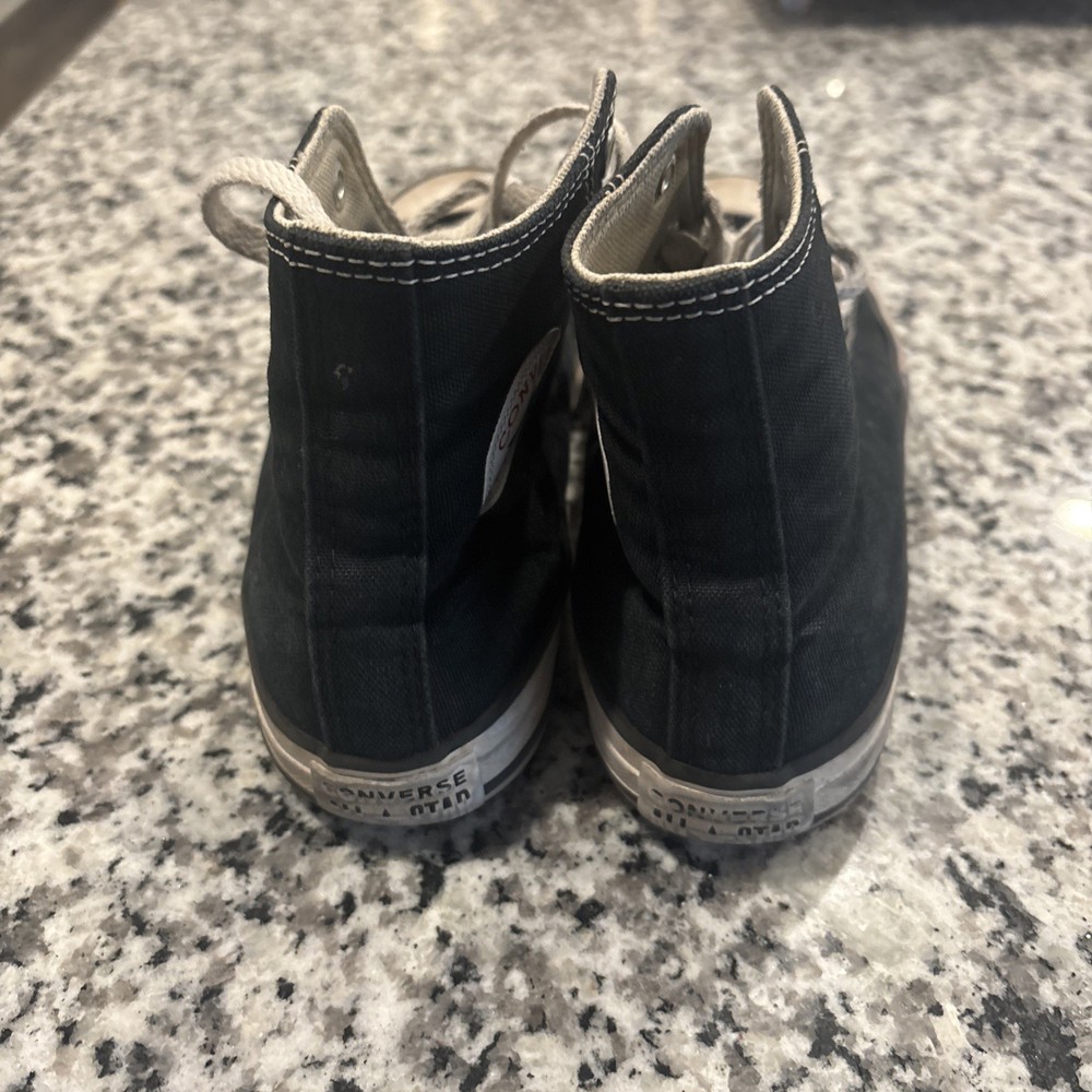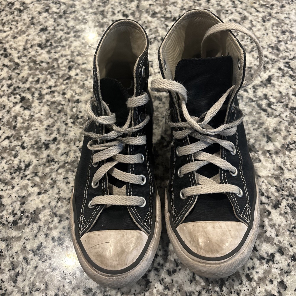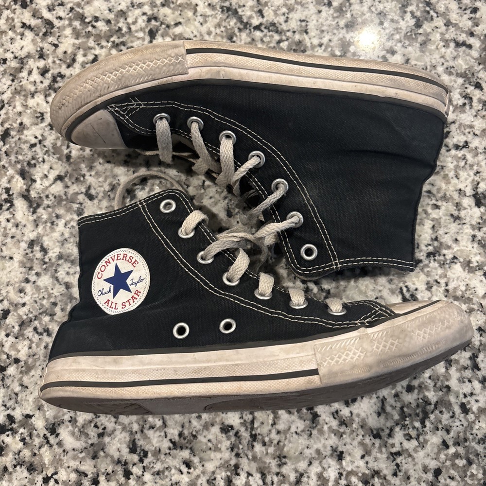 The Converse Chuck Taylor All Star High Top Sneakers in Canvas Black Youth Size 2.5 are a classic and comfortable choice for kids. Featuring a lace-up closure, flat heel, and rubber cleat, these sneakers are perfect for walking, play, and school activities. The high top style and solid black color make them versatile for all seasons, while the signature Converse logo adds a touch of accent. Made with fabric upper and insole materials, these sneakers offer a standard shoe width for a comfortable fit and a timeless look for young Converse fans.