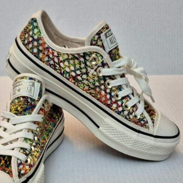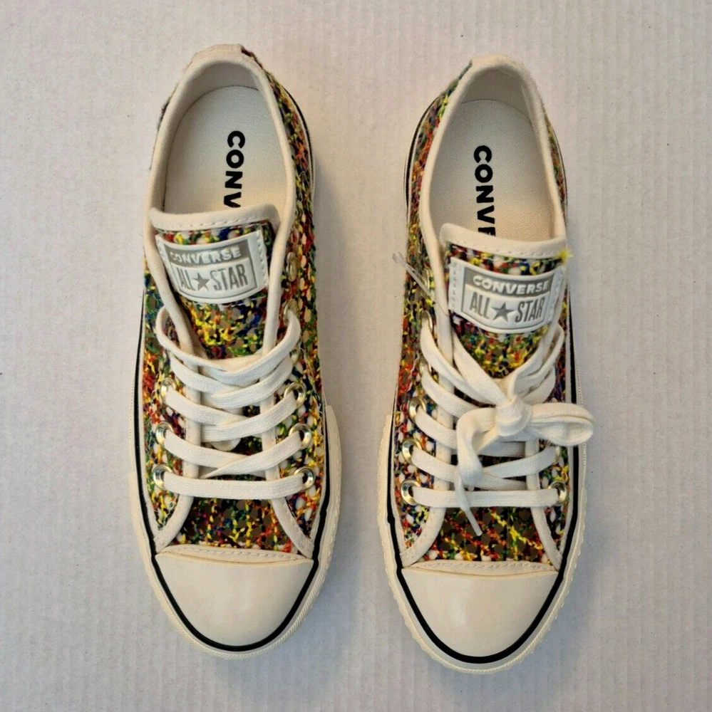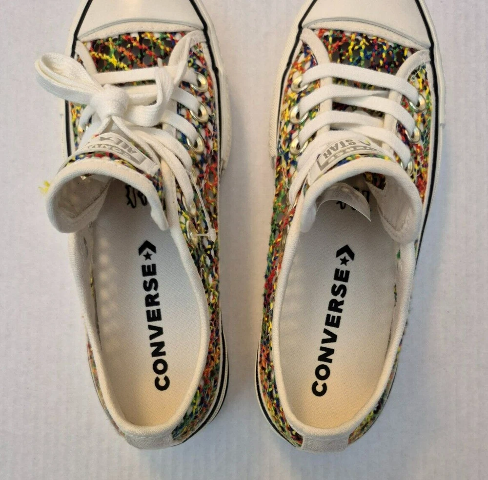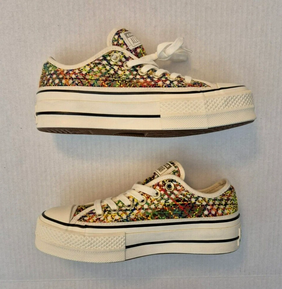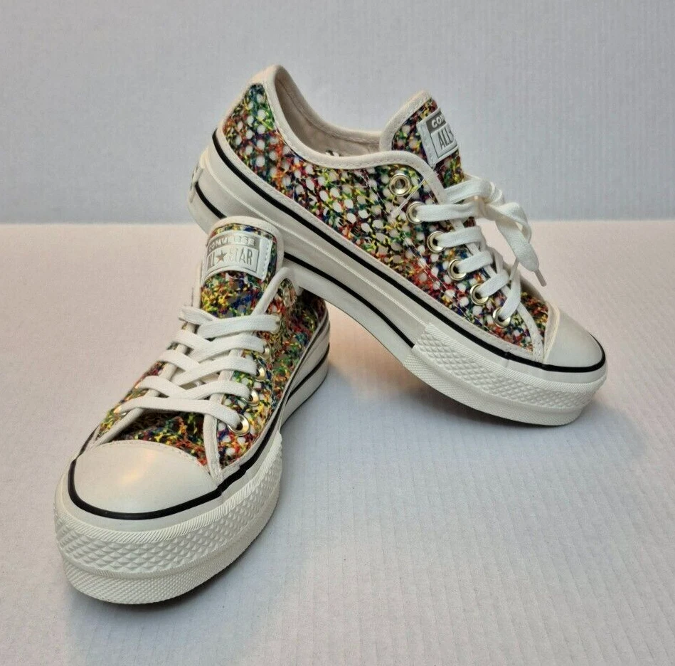 Converse Chuck Taylor All Star Lift Ox Multicolor Rainbow Platform Shoes - New Without Box Women's low-top sneakers with a lace-up closure and a unique rainbow pattern. It features a comfortable textile lining, rubber sole and a toe-cap design. This limited edition shoe is suitable for various occasions such as sportswear or casual wear. Perfect for walking, it offers breathability and a standard shoe width. Made in Vietnam, this shoe is part of the Converse Chuck Taylor All Star collection. NOTE: Please see the images to verify your purchase. Color may differ slightly due to lighting and screen quality. From a smoke-free, pet-free home. Please contact us if you need additional images or information to make your purchase. If you are happy with your transaction, please leave us a Positive Feedback. If you have any problems with your order, please contact us.