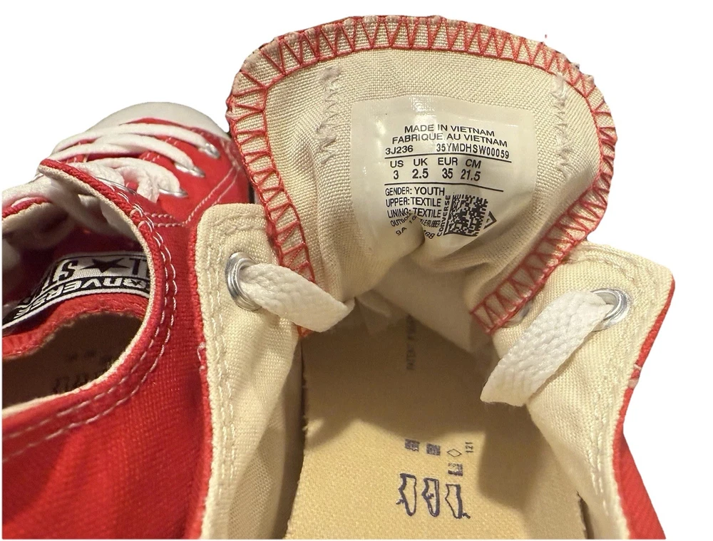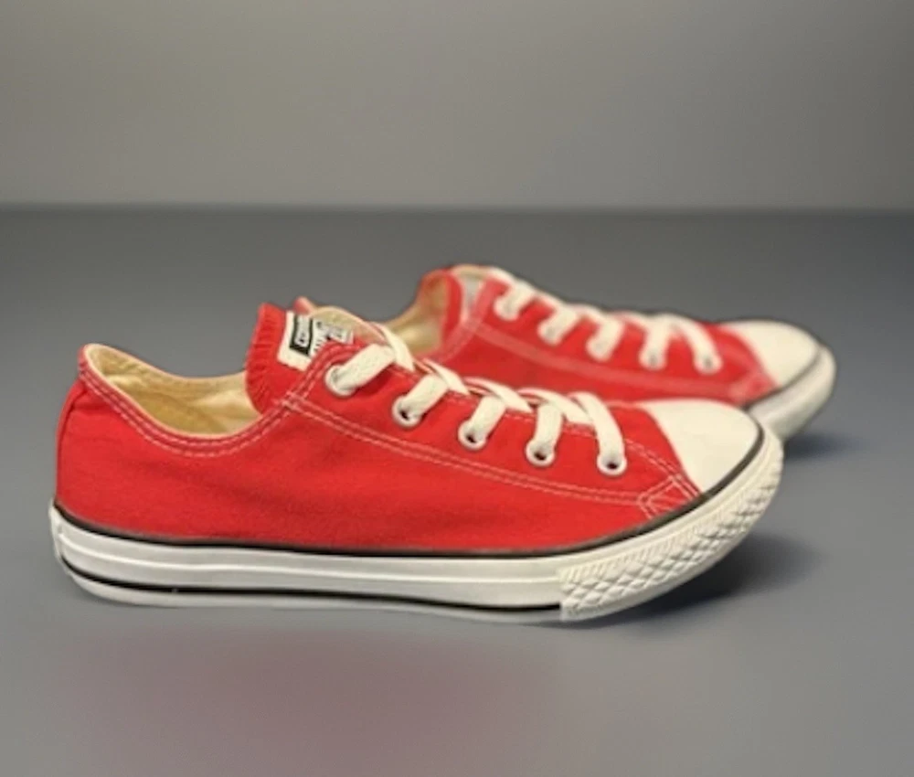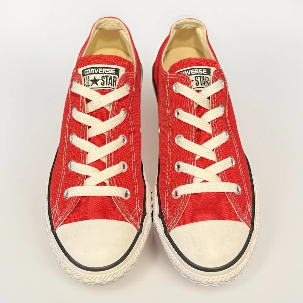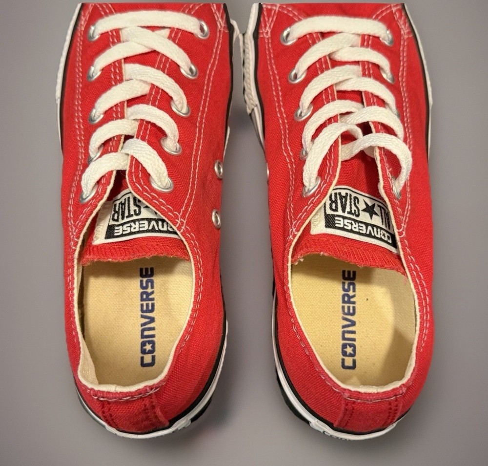 The product is a pair of Converse Chuck Taylor All Star low top sneakers in red and white, designed for casual occasions. These lace-up sneakers feature a canvas fabric type with a logo accent, perfect for school, athleisure, fun, and preppy themes. Ideal for walking and everyday wear, these unisex kids' sneakers are a stylish and comfortable choice for the summer, fall, and spring seasons. Made in Vietnam, they are a classic addition to any wardrobe, with a timeless design that has remained popular for generations.