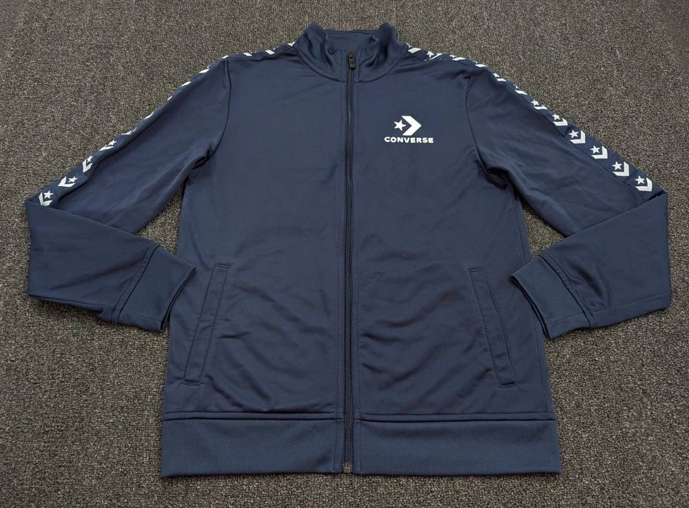 Converse Youth Full Zip Spring Track Training Jacket Navy Blue White Size XL Jacket has a rectangular stain on the front (shown in photos)
