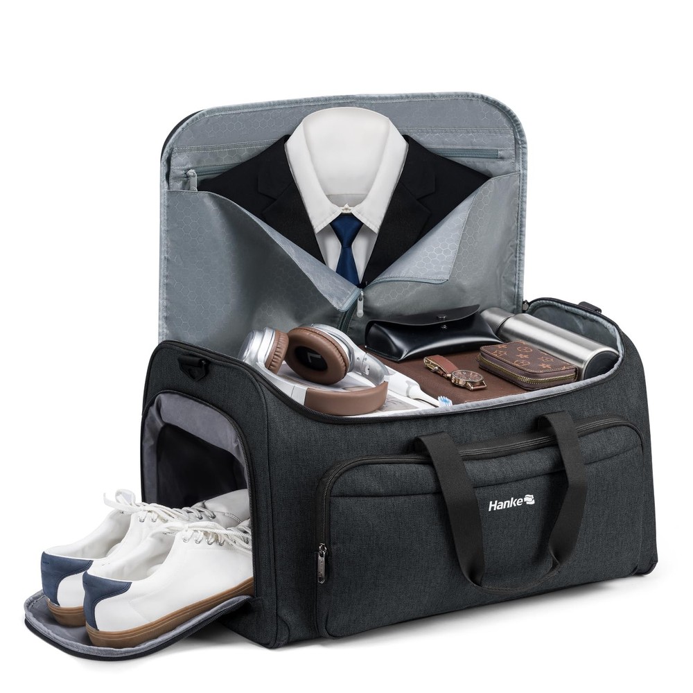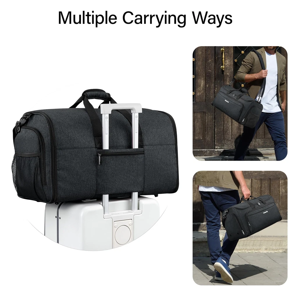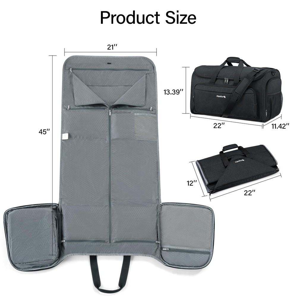 Humanized Design: Compared with others on the market, this halfday travel garment duffle bag uses one zipper design to ensure the bag is full-closed, not only more convenient for use but also keeps your items safer. Size: Our suit bag measures 22x 11.42x 13.39 inches,Weight: 2.98 pounds.Ideal for the people who go for a business trip, vacation, gym or destination wedding. Wrinkle-free:garment bags for travel was specially designed to keep your suit, dress clean, neat and wrinkle-free! There are 2 suit clips to keep your garment flat and prevent them from moving around while traveling without wrinkling your dress or suit, saving you time and effort on ironing. Separate Shoes Pouch:After assembled, this duffle bag for travel work perfect as a garment duffle bags for travel.At the left side pocket of this garment convertible weekender bag is a shoes pouch which has two vents vents.The right side pocket is designed for passport, keys and some other small items.There is also a mesh bag on the right side for some other things. More Pockets and Durable Material: Our convertible garment duffel bag has a lot of useful pockets inside, can hold suits, dresses, ties, other essentials and it is made of tear-resistant, water-resistant polyester fiber for long-lasting use.