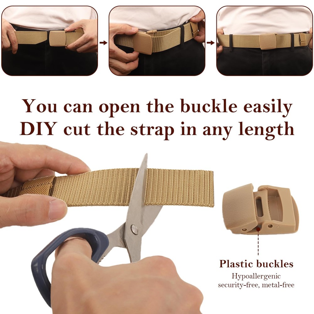 Description Description: Our Nylon Military Tactical Men Belt is more than just a belt. It's a dependable accessory built for the rigors of any environment. Whether you’re securing gear or simply need a reliable belt that keeps up with your active lifestyle, this belt is designed to meet your needs. Product Function Detailed Explanation: This tactical belt features a heavy-duty nylon strap, making it not only durable but also resistant to wear and tear. The quick-release plastic buckle allows for easy, one-handed operation—essential when quick changes are needed. It’s designed to be adjustable, fitting up to a 53.1" waist without sacrificing comfort. The versatility of this belt makes it perfect for both daily wear and specialized needs like hiking, military deployment, or outdoor work. The pack includes 3 belts, each with a robust webbing that holds up against the elements. This means no stretching, slipping, or breaking, even under strain. Its adjustable nature ensures it can be tailored to your specific fit, providing comfort and support without restricting movement. Specifications and Usage Instructions: Material: High-strength nylon Buckle: Plastic, quick-release Size: Adjustable up to 53.1 inches in length,and 1.5 Inches in width Color: Assorted for versatile use Pack: 3 Belts,1 replace buckle Usage is straightforward: slide the belt through your pants loops, adjust to fit, and secure with the buckle. The belts can be easily cleaned with a damp cloth and are quick to dry, making maintenance simple and efficient. Additional Information: Our Nylon Military Tactical Men Belt is perfect for those who value durability and functionality. However, it's important to note that while the buckle is sturdy and reliable, it should not be used as a climbing or life-saving device. Regular checks for wear and tear are recommended to ensure maximum safety and longevity. With our military belt, you're not just buying a belt; you're investing in a tool that will serve you reliably in any scenario. Equip yourself with the right gear, and never worry about your kit’s durability again. Lengthening Tactical Belt Military Belt- The nylon military tactical men belt is specially designed in 53.1'',perfectly fits up to a 45" waist below. The easily adjustable buckle ensures a snug fit for daily comfort and tactical utility. Designed for active duty or daily wear, our belt supports rigorous outdoor and military use. Durable Nylon Material- Made from high-strength nylon, this belt is designed to withstand the toughest conditions. Ideal for military personnel and outdoor enthusiasts, it promises longevity and resilience, making it a practical choice for your adventures Quick-Release Plastic Buckle- Our belts feature a sturdy, quick-release buckle for fast and easy removal. This feature is especially useful in emergency situations or when transitioning between work and leisure, enhancing your preparedness and efficiency.Also get one free plastic buckle for changing Versatile Style & Use- These tactical belts seamlessly blend functionality with style, making them suitable for military, outdoor, and casual wear. They are the perfect accessory for any outfit, enhancing both your wardrobe and readiness for any situation Pack of 3 Value- Receive three heavy-duty tactical belts at an unbeatable price, ensuring you always have a reliable belt ready. Whether you're hiking, working, or simply going about your day, these belts provide exceptional value and versatility No Hold & Non-Metallic- The tactical belt military belt nylon belt webbing belt is non-metallic buckle for easy/quick clearance at security checkpoints. Especially suitable for metal allergy to wear. Removable plastic buckles, not easy to crack and breakage