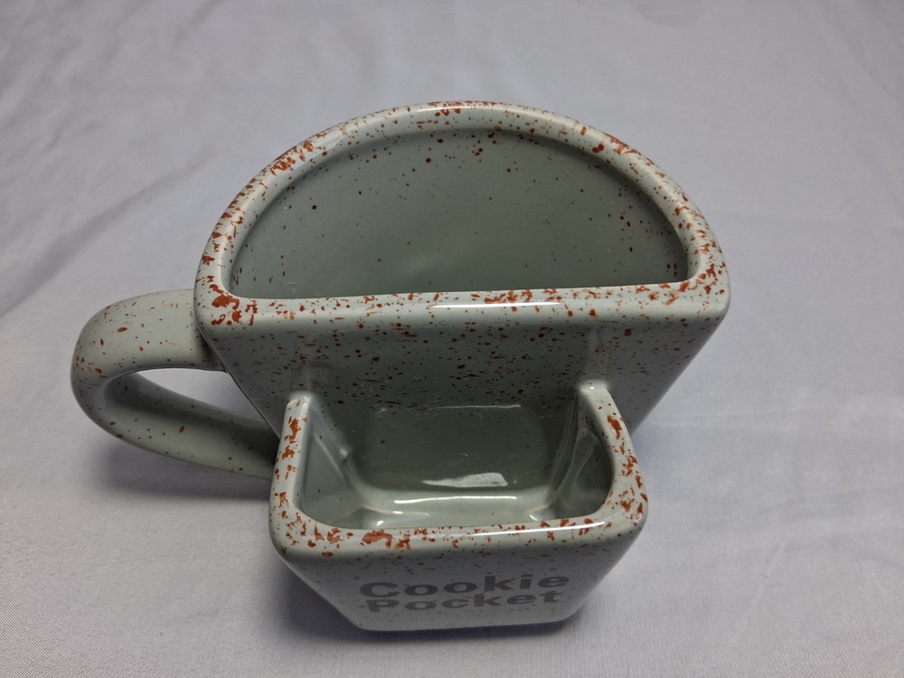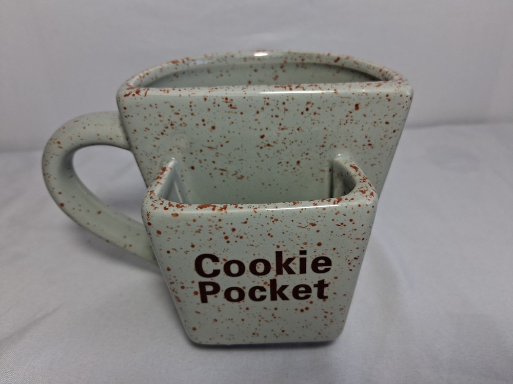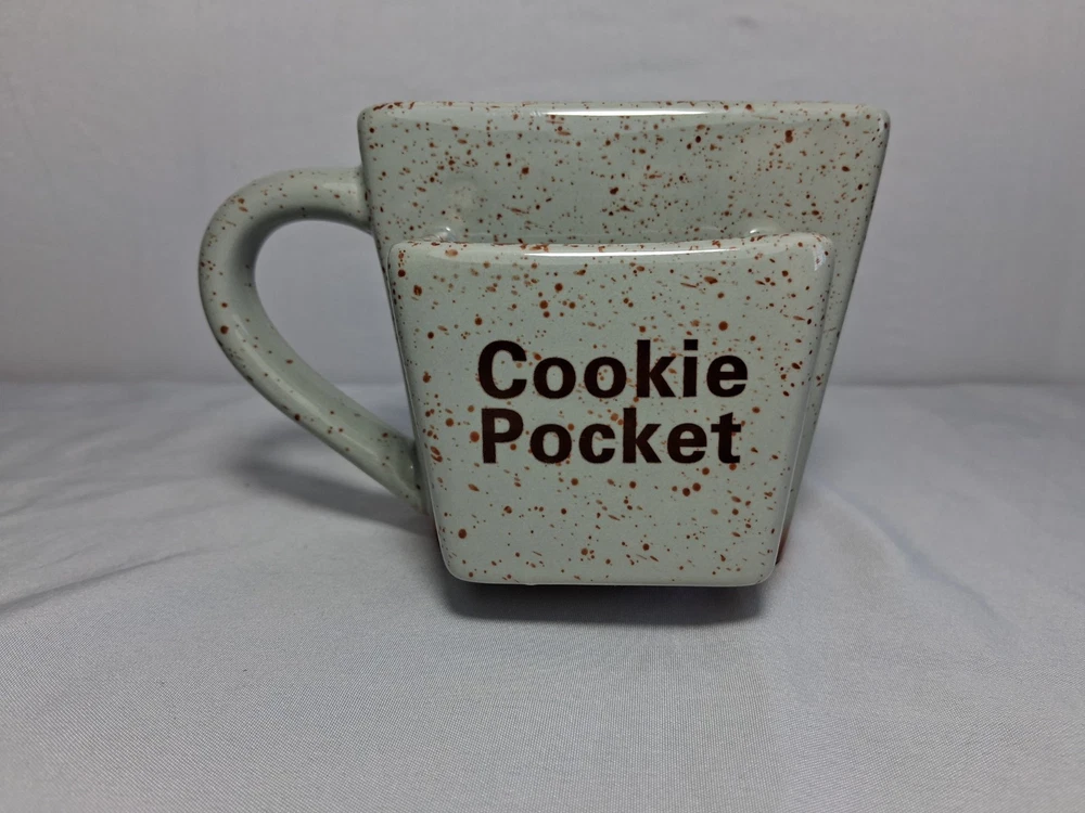 The Cookie Pocket Mug by Simple & Co is a 10-ounce high-heat-resistant ceramic coffee mug with a novelty pattern featuring a cookie character design. It is suitable for all occasions and is decorated in green color. This mug is microwave safe, dishwasher safe, and designed to hold hot beverages. The mug is part of a set that includes a tea cup, coffee cup, coffee mug, and cup, making it a versatile addition to your kitchen or dining room. The brand behind this unique and fun mug is Volar Ideas, and it is branded as AMK12137876000.