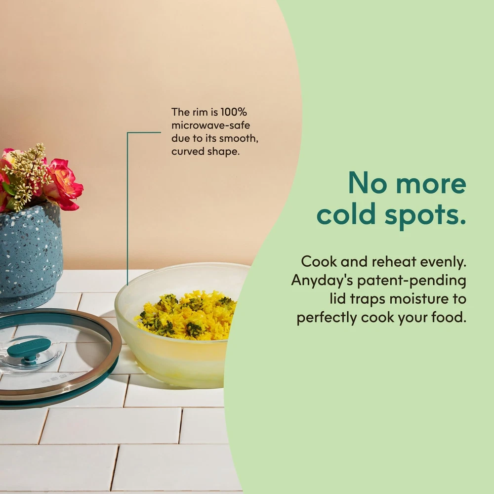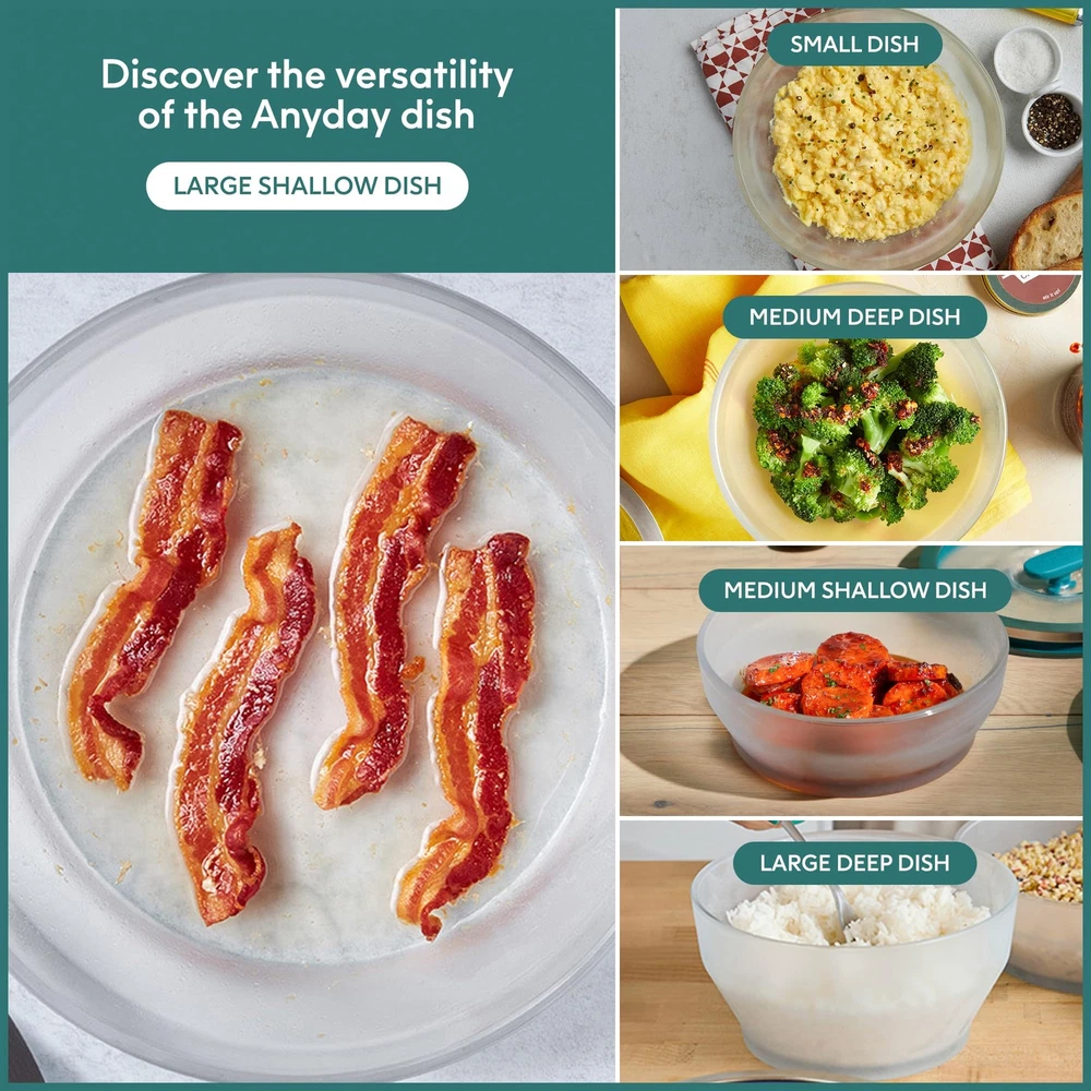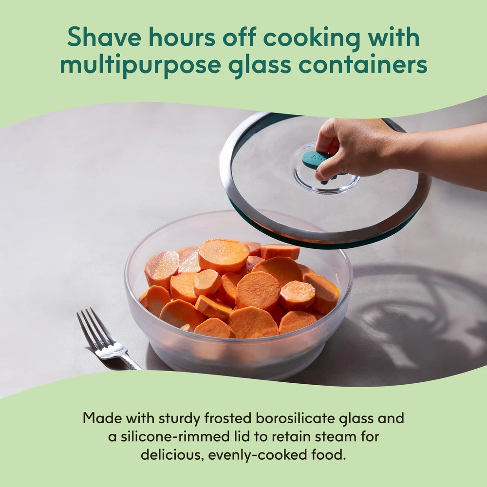 Introducing the Microwave Cookware 2-Piece Large Shallow Dish—the ultimate solution for effortless cooking! Are you tired of cold spots in your reheated meals and mundane leftovers? This stylish yet practical glass meal prep container is designed to keep your food fresher for longer while ensuring even heating. Whether you need a microwave rice cooker, microwave egg cooker, microwave bacon cooker, microwave steamer for vegetables, sturdy soup bowls, pasta bowls, or freezer storage containers, glass containers with lids do it all! Crafted from premium frosted borosilicate glass, food containers with lids combine elegance and functionality. Our robust cooking and baking dishes seamlessly transition from microwave to table to dishwasher—making your life so much easier. This set includes a Large Shallow Dish (7 cups, 8.7" x 3", 3 lbs)—perfect for poaching more than 4 eggs at a time, making up to 5 strips of perfect crispy bacon in minutes, and more. What sets cookware apart? The silicone-rimmed glass lids trap steam for moist, flavor-packed meals while effectively ventilating to prevent pressure build-up. Enjoy healthier cooking—microwave-prepared meals retain more nutrients than those cooked via traditional methods according to research from Harvard and Cornell. Enjoy delightful, nourishing dishes in record time with the help of our microwave-safe glass meal prep containers with lids. Designed for the modern kitchen, our versatile meal prep glass containers with lids are not only perfect for cooking but work wonderfully as elegant serving and food storage containers. Plus, they are dishwasher-safe! Spend less time washing dishes and more time savoring flavorful meals with your loved ones. Unlock a world of culinary creativity with clear food storage glass dishes. Whether making a tasty side dish, a delectable dessert, or a complete meal, this cookware is a kitchen essential. The Dish That Does It All: Made of sturdy frosted borosilicate glass, food storage containers with lids make it easy to enjoy moist, evenly cooked meals straight from the microwave without having to worry about warping or microplastics Silicone-Rimmed Glass Lids: Our splatter-blocking, airtight lids feature a steam-trapping silicone rim that keeps food moist and a silicone knob that vents excess steam; Press the knob down to neatly stack and store these glassware storage containers Hassle-Free Healthy Meals: Effortlessly transform raw ingredients into mouthwatering, nourishing meals in record time with this microwave-safe cookware set; Cooking homemade meals in the microwave is perfectly safe and preserves important nutrients Steam, Serve & Stack: Whether you need a vegetable steamer, glass mixing bowl, sturdy lunch container, or elegant serving bowl, our dishwasher-safe glass food storage dishes do it all; Cook, serve, neatly stack and store meals with minimal mess Large Shallow Dish: This convenient lidded glass storage container perfectly caters to your cooking needs, whether steaming, oven roasting, reheating, serving, or storing food; It’s great for long flat veggies and proteins like chicken or fish