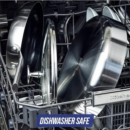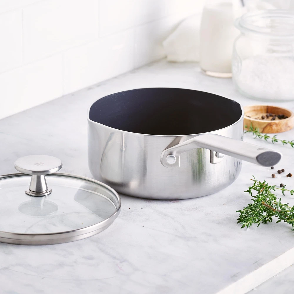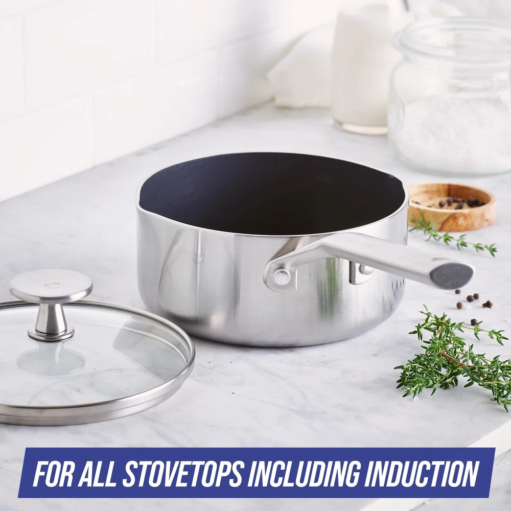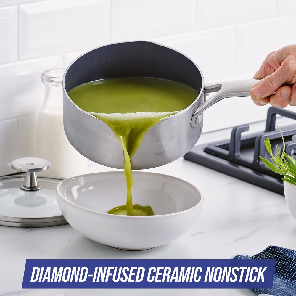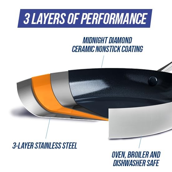 TRIPLE STEEL CONSTRUCTION: Three-layer tri-ply stainless steel bodies deliver even heating for incredible browning, searing, and sautéing results 5X HARDER COATING & 10X LONGER LASTING: Our diamond-infused ceramic nonstick coating is 5x harder and lasts 10x longer than traditional nonstick, metal utensil safe TOXIN-FREE: This collection’s healthy ceramic nonstick coating is free of PFAS, PFOA, lead, and cadmium VERSATILE COOKTOP COMPATIBILITY: Suitable for all stovetops, including induction, for maximum cooking flexibility EXTREME HEAT RESISTANCE: Mirror-finished stainless steel bodies are oven and broiler safe up to 600°F, glass lids up to 425°F COOL-TOUCH HANDLES: V-shaped cutouts in the stainless steel handles ensure they stay cool during stovetop use SPACE-SAVING DESIGN: Angled handle shape allows for easy stacking and storage EASY TO CLEAN: Dishwasher safe for convenient cleanup, though most messes wipe away effortlessly