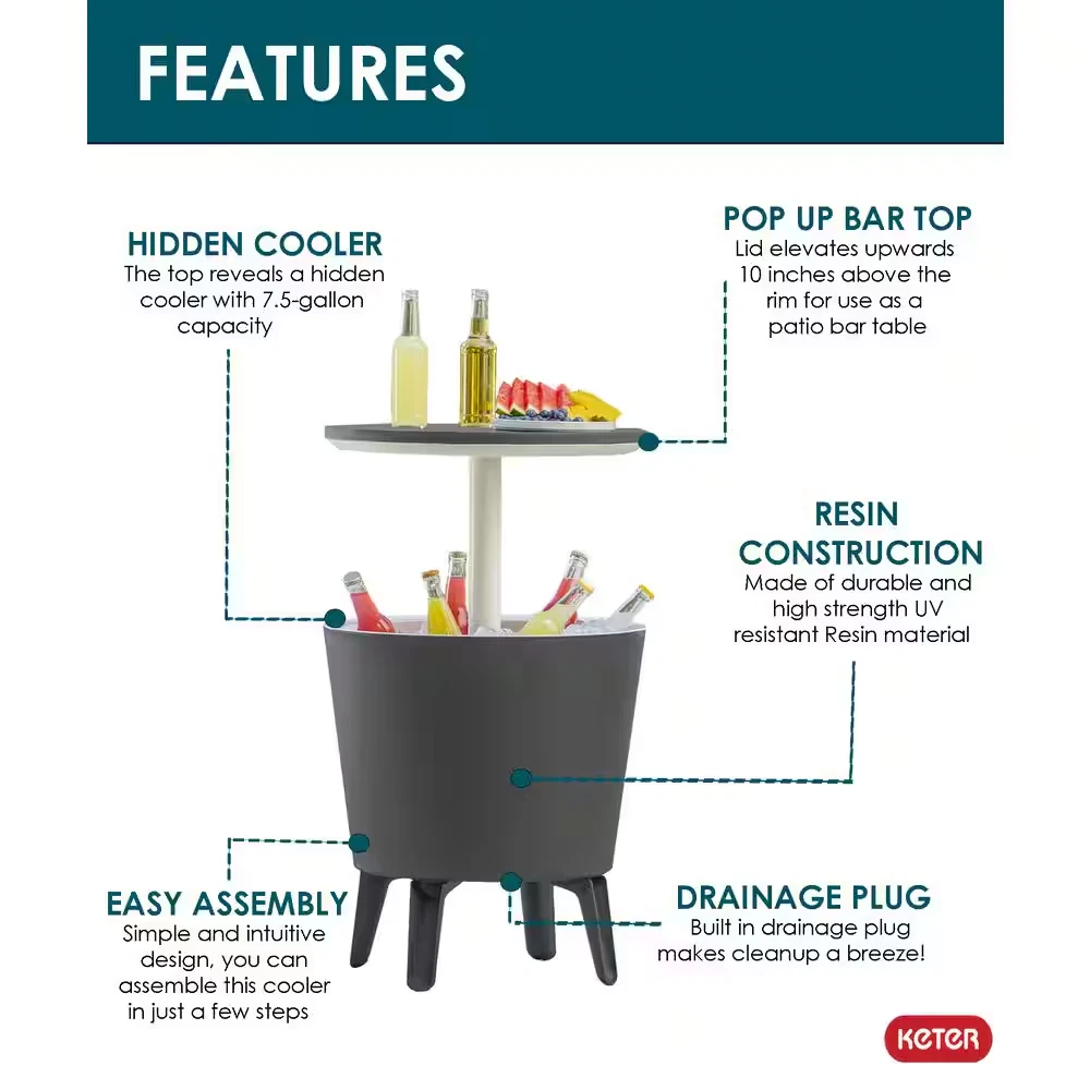 Store New Arrivals Add to Favorite View Feedback Contact Cool Bar Gray Resin Outdoor Accent Table & Cooler in One Drink Storage Pool Side Description Condition New: A brand-new, unused, unopened, undamaged item in its original packaging (where packaging is ... Brand Keter Product Weight (lb) 12.52 lb Returnable 90-Day Manufacturer Warranty 2-Year Limited Warranty Included No additional items included Shape Round Assembly Required Yes Commercial/Residential Residential Frame Finish Gray Material Plastic Frame Primary Finish Gray Patio Furniture Features Extendable,Storage,Weather Resistant Table Type Outdoor Accent Table Tabletop Material Resin Assembled Depth (in) 19.5 in Assembled Height (in) 22.5 in Assembled Width (in) 19.5 in eBay Cool Bar Gray Resin Outdoor Accent Table & Cooler In One Drink Storage Pool Side Description Assembly Required Yes Commercial/Residential Residential Frame Finish Gray Frame Material Plastic Frame Primary Finish Gray Included No additional items included Patio Furniture Features Extendable,Storage,Weather Resistant Product Weight (lb) 12.52 lb Returnable 90-Day Shape Round Table Type Outdoor Accent Table Tabletop Material Resin Manufacturer Warranty 2-Year Limited Warranty Assembled Depth (in) 19.5 in Assembled Height (in) 22.5 in Assembled Width (in) 19.5 in Keeps drinks chilled for more than 12 hours Made from weather-resistant resin for durability Pop-up top rises from 22.5 in. to 32.5 in. for easy drink access Whether you want a stylish accent table or a functional entertaining accessory, you can have it all with the Cool Bar from Keter. It is the ultimate 3-in-1 backyard solution: part cooler, part coffee table or part cocktail table. It's perfect for backyard barbecues, patio parties or just lounging on your patio or by the pool. Its compact design will easily fit into the layout of even the smallest deck, patio or yard space. If you have larger outdoor living areas, you can place one on either side of each sofa, loveseat or chair to use as end tables. Want to convert your Cool Bar from cooler/coffee table into a party-perfect cocktail table Simply lift the lid and twist the locking ring. The Cool Bar's 7.5 Gal. cooler can keep drinks chilled for more than 12-hours. The top rises smoothly from 22.5 in. to 32.5 in. in overall height and locks into place to prevent it from falling when topped with party provisions. And when you are done, simply remove the built-in drainage plug for easy cleanup. With a resin frame and compact design the cool bar is perfect for almost any space Constructed out of durable resin with sturdy engineered legs for optimal support Weather-resistant resin protects against the elements, making the frame resistant to rust, rot and decay Wash with a garden hose or a mild detergent solution, do not use a stiff brush or abrasive cleaners, including degreasers and oil or acetone-based cleaning materials, as these may damage the product Designed for fast and easy assembly Top rises from 22.5 in. to 32.5 in. in overall height and locks into place for easy drink access 7.5 Gal. drink storage capacity can handle up to forty 12 oz. cans with ice for up to 12-hours Built-in drainage plug makes clean-up a snap Assembled dimensions closed: 19.5 in. L x 19.5 in. W x 22.5 in. H Assembled dimensions open: 19.5 in. L x 19.5 in. W x 33.2 in. H ABOUT US We offer the best prices around on high quality products. Our E-store includes tools, general home, garden items and more. SHIPPING We are always working hard to ensure your package arrives as soon as possible. Please understand that some factors like weather, high postal traffic, and the performance of shipping companies are outside of our control. We offer free shipping to the lower 48 states and ship within 4 business days of payment, usually sooner. We do not accept P.O. Boxes. Please provide a physical address. RETURNS We offer a 30-Day Return Policy on items which you are not completely satisfied with. You have the option for a full-refund or an exchange of the item. No returns are available on items shipped outside of the USA. PAYMENT We accept PayPal. CONTACT US This page content is yet to come Please ad us to your favorite seller and visit again later Thank You CUSTOMER SATISFACTION We try our very best to make sure every customer is completely satisfied. If there's a problem, message us! We're happy to help. WE ACCEPT Copyright © 2017 AutoDs. | All Rights Reserved ABOUT US We offer the best prices around on high quality products. Our E-store includes media such as books, movies, music and games while offering electronics, toys, sporting apparel, clothing, tools, general home, garden items and more. SHIPPING We are always working hard to ensure your package arrives as soon as possible. Please understand that some factors like weather, high postal traffic, and the performance of shipping companies are outside of our control. We offer free shipping to the lower 48 states and ship within 2 business days of payment, usually sooner. We do not accept P.O. Boxes. Please provide a physical address. For shipping outside of the continental USA, we only use eBay's Global Shipping Program.The item is shipped to KY and then sent to the rest of the world. International customers are responsible for all duties and taxes. Continue to 'check out' to calculate costs for shipping the item to your country. Messages regarding eBay's Global Shipping Program MUST be directed at eBay EXCLUSIVELY. RETURNS We offer a 30-Day Return Policy on items in which you are not completely satisfied with. You have the option of a full-refund or an exchange of the item. No returns are available on items shipped outside of the USA. PAYMENT We accept PayPal. CONTACT US This page content is yet to come Please ad us to your favorite seller and visit again later Thank You CUSTOMER SATISFACTION We try our very best to make sure every customer is completely satisfied. If there's a problem, message us! We're happy to help. WE ACCEPT Co