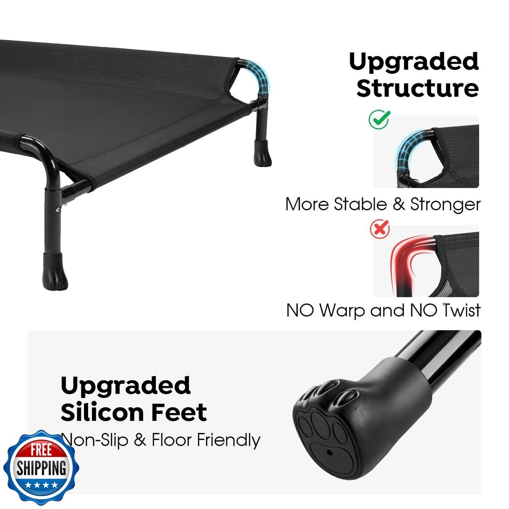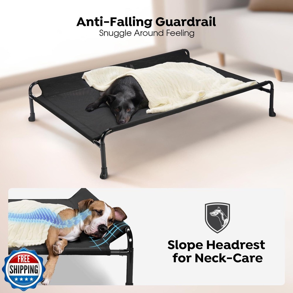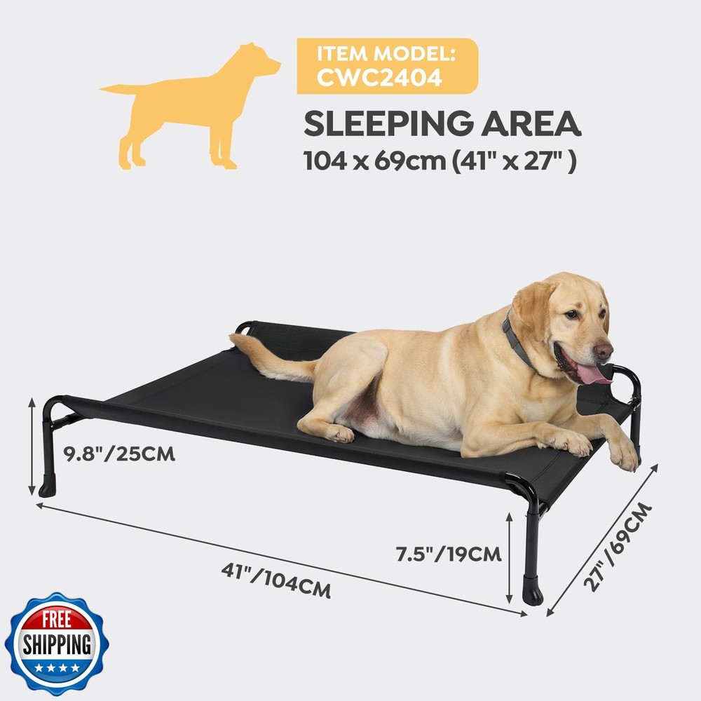 Veehoo Cooling Elevated Dog Bed - Raised for Large Dogs, Outdoor With Guardrail, Upgraded Non-Slip Feet, Breathable Teslin Mesh, Portable Camping Cot, 41 x 27 Inches, Black Features Large Dog Bed: The dog bed frame measures 41.0"L x 27.0"W x 9.8"H(including 2.4" guardrail height), supports up to 100 lbs(45kg). Ideal for Golden Retriever, Labrador, Rottweilers, Boxers, Huskies, Border Collie, Samoyed, Wolf dog etc. Dog Bed with Guardrail: The double-sided guardrail prevents your dog from accidentally rolling off the bed, giving your pet a safe and snuggle around feeling; And the slope headrest provides comfort neck support. Enhanced Stability: Upgraded non-slip feet with soft silicon bottom guarantee the dog cot bed doesn’t slide on the floor when dog runs and jumps on it; And upgraded bed frame constructure ensure no twist and no sudden collapse; Cooling Elevated Dog Bed: Crafted of durable Teslin mesh in the center, the bed allows airflow and water penetrate, keeping your pet cooling and dry in the humid summer; and the raised design makes your pet off hard muddy ground, keeping clean and joints health; On-the-Go Dog Bed: Hassle-free setup, no tool needed; washable dog bed is easy to maintain clean, simply wipes clean or hose off, no longer worry about your pup’s dirty paws and dog smell. This portable dog bed is ideal for both indoor comfort and outdoor adventures. Shipping Free & Fast Shipping: We offer free shipping to most of the USA with a normal delivery time of 3-7 days. However, due to the current situation, additional delivery time (up to 3 weeks) may be required for some items. Alternative Carriers: We may use alternative carriers (e.g., USPS, FedEx, UPS) to ensure your package arrives safely and on time. Due to the use of multiple carriers, we are unable to provide a tracking number automatically. Handling Time: Orders are processed and shipped within 1-2 business days of receiving cleared payment. Shipping Restrictions: Shipping to Alaska, Hawaii, Puerto Rico, Guam, and other US territories may incur shipping charges or delivery restrictions. Please contact us before ordering, or your order can be refunded/cancelled. State Restrictions: Certain items may not be shipped to California due to state regulations. Contact for Tracking Updates: If you require tracking updates or have any concerns about the delivery of your order, please feel free to contact us, and we will be happy to assist you. Return Policy 30-Day Hassle-Free Returns: If you are not completely satisfied with your purchase, you can return the item for free within 30 days of receiving it for a full refund or exchange. Easy Return Process: Contact us, and we will provide you with a prepaid return shipping label and detailed instructions. No Restocking Fee: There are no restocking fees for returns. However, the buyer is responsible for return shipping costs if the return is not due to a seller"s error. Refund Processing: Refunds will be processed within 1 business day of receiving the returned item in its original condition. Feedback Your feedback is extremely important to us. We strive to provide the best products and customer service possible. If you are satisfied with your purchase, please take a moment to leave us a positive review. If you have any concerns or issues with your order, please contact us before leaving negative feedback. We are committed to resolving any problems and ensuring your satisfaction. Contact Us If you have any questions or concerns, please feel free to reach out to our customer support team. You can contact us through the eBay messaging system. We are available Monday to Friday, 9:00 am to 5:00 pm EST, and we will do our best to respond to your inquiry within 24 hours. Thank you for supporting our small family business!