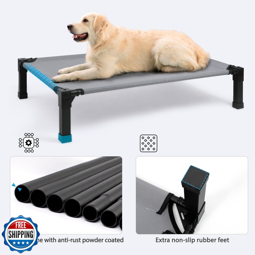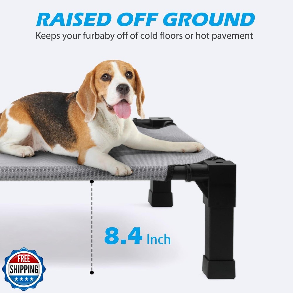 Cooling Elevated Dog Bed with Mesh and Metal Frame, Portable Dog Cot for Outdoor and Indoor Use Features Stay Cool and Dry: The dog bed elevates pets more than 8.4 inches off the ground, which allows air to circulate underneath and provides a cooling environment for your pets. Raised dog cot is great for keeping your pet warm in the cooler months and cooler in the warmer months both indoors and outdoors. Premium Fabric Materials: The Textilene dog bed mat allows air to flow, is sturdy and breathable. Pet hair, dirt, grime won't stick to the tight mesh, just hose off with water and allow to dry. You can also wipe it clean with a wet towel. Sturdy Steel Construction: Powder-coated steel frame is rust-resistant and built to withstand harsh outdoor conditions, it can support the weight of your large-sized dog. Designed for quick removal and installation, make the bed portable and perfect for indoor, outdoor, picnic, camping, training. Enlarged Rubber Feet Pads: The non-slip rubber feet protect floors from scratches and keep the pet bed from sliding when your dog jumps on or off. The non-slip feet provide extra stability during movement, making this ultra-comfortable bed ideal for use on a variety of surfaces. Easy to Install: The cooling dog cot can be installed without the use of any tools, screws and can be installed directly with the plastic connector. It only takes a few minutes of your time, and presto! It's up and ready for your pet to enjoy in. Shipping Free & Fast Shipping: We offer free shipping to most of the USA with a normal delivery time of 3-7 days. However, due to the current situation, additional delivery time (up to 3 weeks) may be required for some items. Alternative Carriers: We may use alternative carriers (e.g., USPS, FedEx, UPS) to ensure your package arrives safely and on time. Due to the use of multiple carriers, we are unable to provide a tracking number automatically. Handling Time: Orders are processed and shipped within 1-2 business days of receiving cleared payment. Shipping Restrictions: Shipping to Alaska, Hawaii, Puerto Rico, Guam, and other US territories may incur shipping charges or delivery restrictions. Please contact us before ordering, or your order can be refunded/cancelled. State Restrictions: Certain items may not be shipped to California due to state regulations. Contact for Tracking Updates: If you require tracking updates or have any concerns about the delivery of your order, please feel free to contact us, and we will be happy to assist you. Return Policy 30-Day Hassle-Free Returns: If you are not completely satisfied with your purchase, you can return the item for free within 30 days of receiving it for a full refund or exchange. Easy Return Process: Contact us, and we will provide you with a prepaid return shipping label and detailed instructions. No Restocking Fee: There are no restocking fees for returns. However, the buyer is responsible for return shipping costs if the return is not due to a seller"s error. Refund Processing: Refunds will be processed within 1 business day of receiving the returned item in its original condition. Feedback Your feedback is extremely important to us. We strive to provide the best products and customer service possible. If you are satisfied with your purchase, please take a moment to leave us a positive review. If you have any concerns or issues with your order, please contact us before leaving negative feedback. We are committed to resolving any problems and ensuring your satisfaction. Contact Us If you have any questions or concerns, please feel free to reach out to our customer support team. You can contact us through the eBay messaging system. We are available Monday to Friday, 9:00 am to 5:00 pm EST, and we will do our best to respond to your inquiry within 24 hours. Thank you for supporting our small family business!