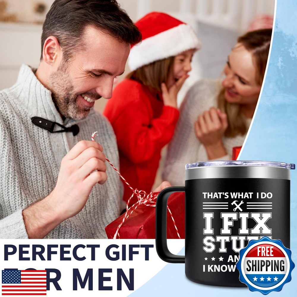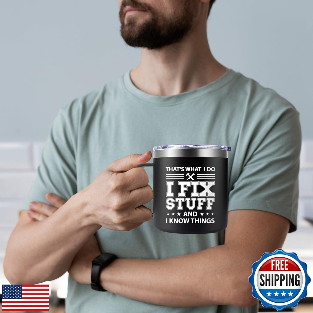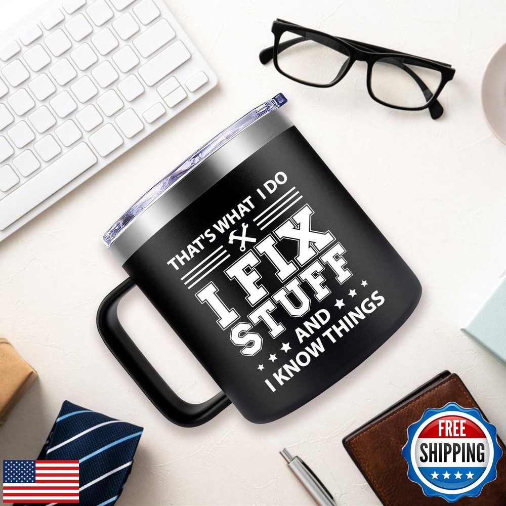 Fufendio Fathers Day Gift for Dad - Cool Birthday Gifts for Men - I Fix Stuff and I Know Things Mug 14oz - Birthday Christmas Gifts for Him Grandpa Uncle Brother Husband Features MUG FOR HIM: This mug featuring the clever phrase 'That's What I Do I Fix Stuff and I Know Things,' would make a wonderful gift for Father's Day, Christmas, or any special occasion worth commemorating WHAT'S INCLUDED: It comes packaged in a gift box and includes a stainless steel mug, a leak-proof lid, a opener keychain, a coffee spoon, a straw and straw brush SPILL PROOF GUARANTEE: This mug have an easy-to-grip handle. It's also dishwasher-safe, making cleaning a breeze. Its design is ideal for individuals with busy, fast-paced lifestyles DOUBLE WALL VACUUM INSULATED: Crafted with double-wall insulation. It keeps your drinks steaming hot for up to 3 hours and refreshingly cold for over 6 hours USE FOR MANY OCCASIONS: This mug is suitable for use in indoor or outdoor setting, making it perfect for enjoying drinks at home, on the beach, by the lake, at the pool, in the office Shipping Free & Fast Shipping: We offer free shipping to most of the USA with a normal delivery time of 3-7 days. However, due to the current situation, additional delivery time (up to 3 weeks) may be required for some items. Alternative Carriers: We may use alternative carriers (e.g., USPS, FedEx, UPS) to ensure your package arrives safely and on time. Due to the use of multiple carriers, we are unable to provide a tracking number automatically. Handling Time: Orders are processed and shipped within 1-2 business days of receiving cleared payment. Shipping Restrictions: Shipping to Alaska, Hawaii, Puerto Rico, Guam, and other US territories may incur shipping charges or delivery restrictions. Please contact us before ordering, or your order can be refunded/cancelled. State Restrictions: Certain items may not be shipped to California due to state regulations. Contact for Tracking Updates: If you require tracking updates or have any concerns about the delivery of your order, please feel free to contact us, and we will be happy to assist you. Return Policy 30-Day Hassle-Free Returns: If you are not completely satisfied with your purchase, you can return the item for free within 30 days of receiving it for a full refund or exchange. Easy Return Process: Contact us, and we will provide you with a prepaid return shipping label and detailed instructions. No Restocking Fee: There are no restocking fees for returns. However, the buyer is responsible for return shipping costs if the return is not due to a seller's error. Refund Processing: Refunds will be processed within 1 business day of receiving the returned item in its original condition. Payment We accept all major credit cards, PayPal, and Apple Pay for your convenience. Your payment information is secure and encrypted to ensure a safe and seamless transaction. Please complete your payment within 3 days of purchase to avoid any delays in shipping. Feedback Your feedback is extremely important to us. We strive to provide the best products and customer service possible. If you are satisfied with your purchase, please take a moment to leave us a positive review. If you have any concerns or issues with your order, please contact us before leaving negative feedback. We are committed to resolving any problems and ensuring your satisfaction. Contact Us If you have any questions or concerns, please feel free to reach out to our customer support team. You can contact us through the eBay messaging system. We are available Monday to Friday, 9:00 am to 5:00 pm EST, and we will do our best to respond to your inquiry within 24 hours. Thank you for supporting our small family business!